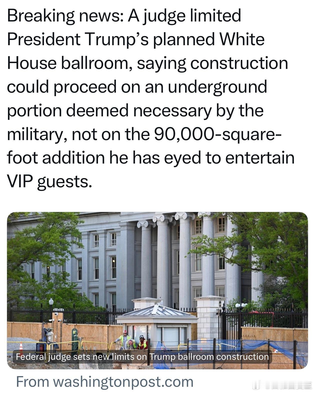 联邦法官判:白宫“宴会大厅”项目,地下掩体部分,军方认为必要,可以继续施工;地上九万平方英尺建筑,依然有争议、目前施工暂停