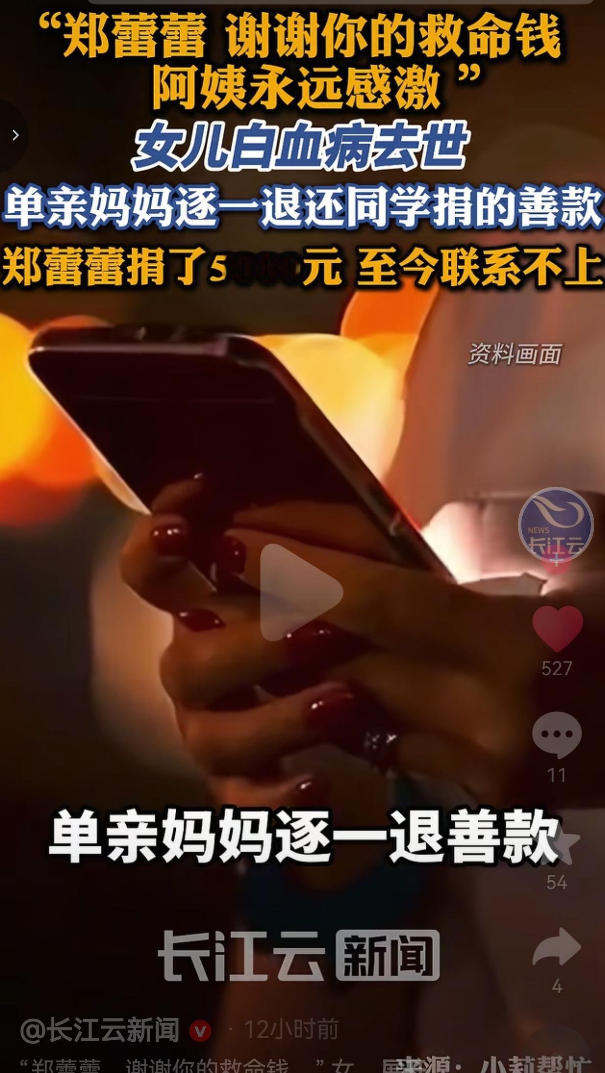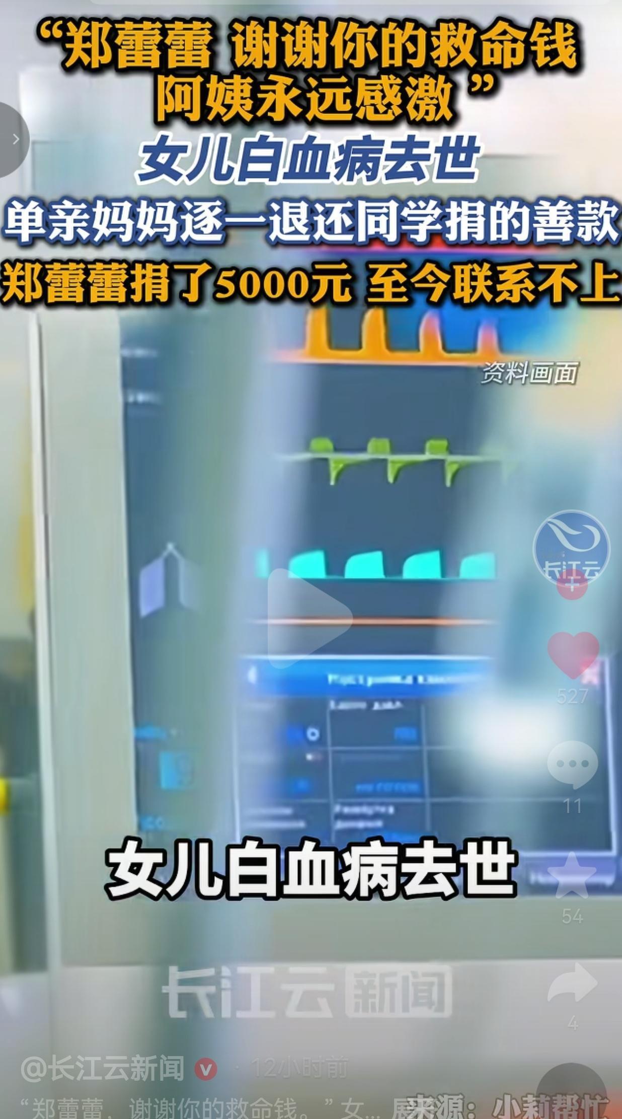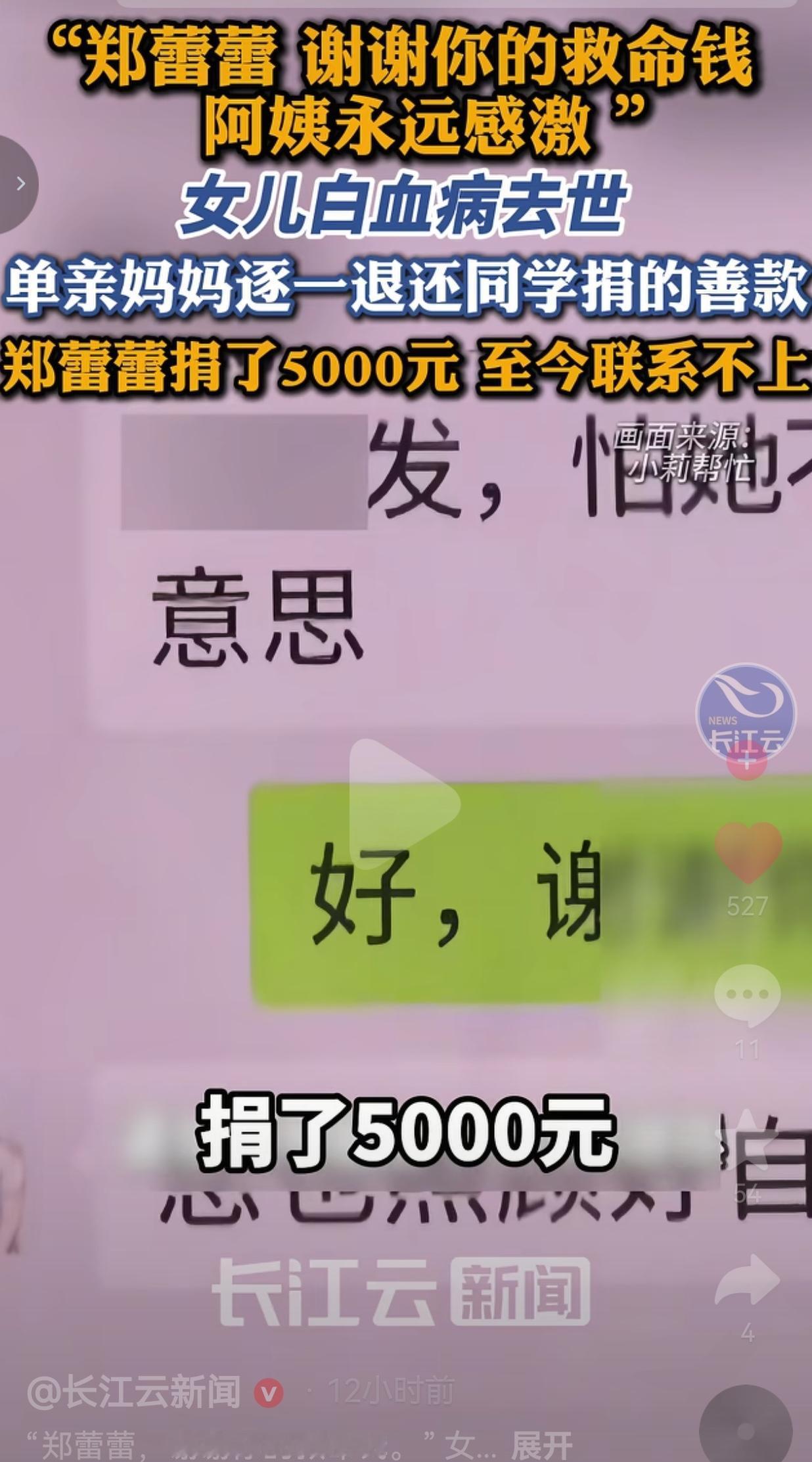 河南许昌的一位单亲妈妈,女儿因为白血病走了,她却执意要把当年大家捐的钱,一分不少地退回去。可唯独一笔5000元的捐款,她怎么也找不到主人,她对着全网喊:“郑蕾蕾,阿姨想把钱还给你,也想亲口说声谢谢!” 这位妈妈,一个人拉扯着女儿长大。女儿查出白血病的时候,她感觉天都塌了。 为了给女儿凑医药费,她在网上发起了求助,女儿的同学们也自发组织了捐款。那段时间,她收到了来自四面八方的善意,很多素不相识的人,给她打钱、发消息,鼓励她一定要撑住。 可惜,拼尽全力,还是没能留住孩子。女儿走了,她抱着冰冷的孩子,心也跟着死了。可就在大家都以为她会沉浸在悲伤里的时候,她做了一个决定:把所有没花完的捐款,全部退回去。 她对着每一个给她转过钱的人,一个个发消息,转账,说:“孩子走了,钱我不能要,你们的心意我领了,谢谢你们。” 很多人不肯收,说“留着自己用”,她就一遍一遍地转,一遍一遍地说:“这是我的心愿,也是对孩子的交代。” 可唯独这笔5000元,她遇到了难题。转账过去,对方没收,过期了。她发消息过去,也石沉大海。她只记得对方叫郑蕾蕾,是一位大学生,来自汉语国际教育学院,可她怎么也联系不上了。 她拿着手机,看着那个早已过期的转账记录,一遍遍地说:“蕾蕾同学,阿姨知道你是真心想帮我们,这笔钱我一定要还给你,也想亲口跟你说声谢谢。” 网友看到后评论说:我哭了……阿姨真的太善良了!她失去了全世界,却还在想着不欠别人一分一毫。 也有的网友说:郑蕾蕾同学,如果你看到了,能不能出来回应一下?阿姨只是想把这份善意,好好地还给你。 还有的网友说:现在这种人太少了!多少人拿到捐款就消失了,她却在失去孩子后,坚持把钱退回去,太戳心了。 更有网友表示:她不是在退钱,她是在守护孩子最后的体面,也是在守护这个世界的善意啊。 说实话,我真的被这个妈妈的“体面”狠狠戳中了。 女儿没了,她什么都没了,可她还在坚持着,不占别人一点便宜。她不是不知道,这些钱留着,能帮她度过难关,可她就是过不了自己心里的那道坎。 她对着每一个陌生人说谢谢,对着空无一人的对话框喊着郑蕾蕾的名字,她不是矫情,她是在用自己的方式,守护着女儿,也守护着那些陌生人给她的温暖。 我见过太多,拿着别人的善意当理所当然的人,可这个妈妈,哪怕自己身处深渊,也不想让善意打了水漂。她知道,那一笔笔捐款,不是理所当然,是别人的血汗钱,是别人的一份心意。 她不是不难过,她只是不想让这份善意,跟着女儿一起,消失在这个世界上。 这件事,最让我破防的,从来都不是她有多惨,而是她在极致的痛苦里,依然保持着的善良和体面。 她想找到郑蕾蕾,不只是为了还钱,更是为了给这份善意一个交代。她想告诉那个姑娘:谢谢你,阿姨收到了你的心意,也永远记着你的好。 或许,郑蕾蕾早就忘了这件事,可这位妈妈,却记了一辈子。她想把这份温暖,原封不动地还给她,也想让她知道,她的善意,真的照亮过一个濒临绝望的妈妈。 希望郑蕾蕾能看到,也希望这位妈妈,能早日走出悲伤,被这个世界温柔以待。