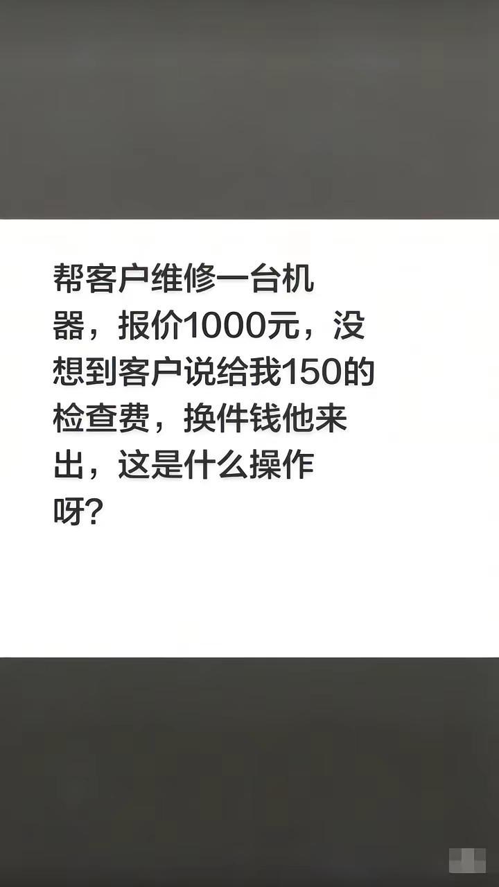 帮客户维修一台机器,报1000元,没想到客户说给我150的检查费,剩下的自己搞掂,这是什么操作呀?