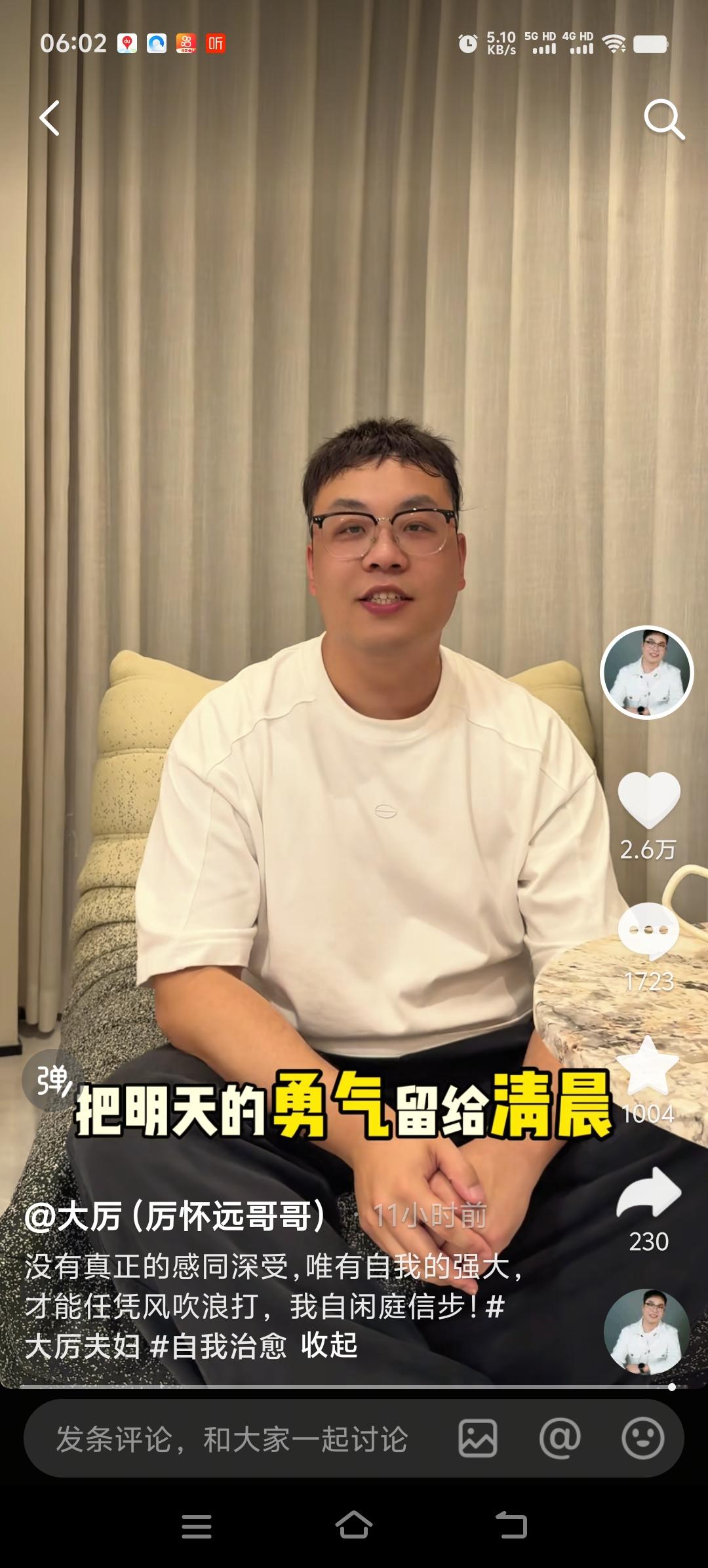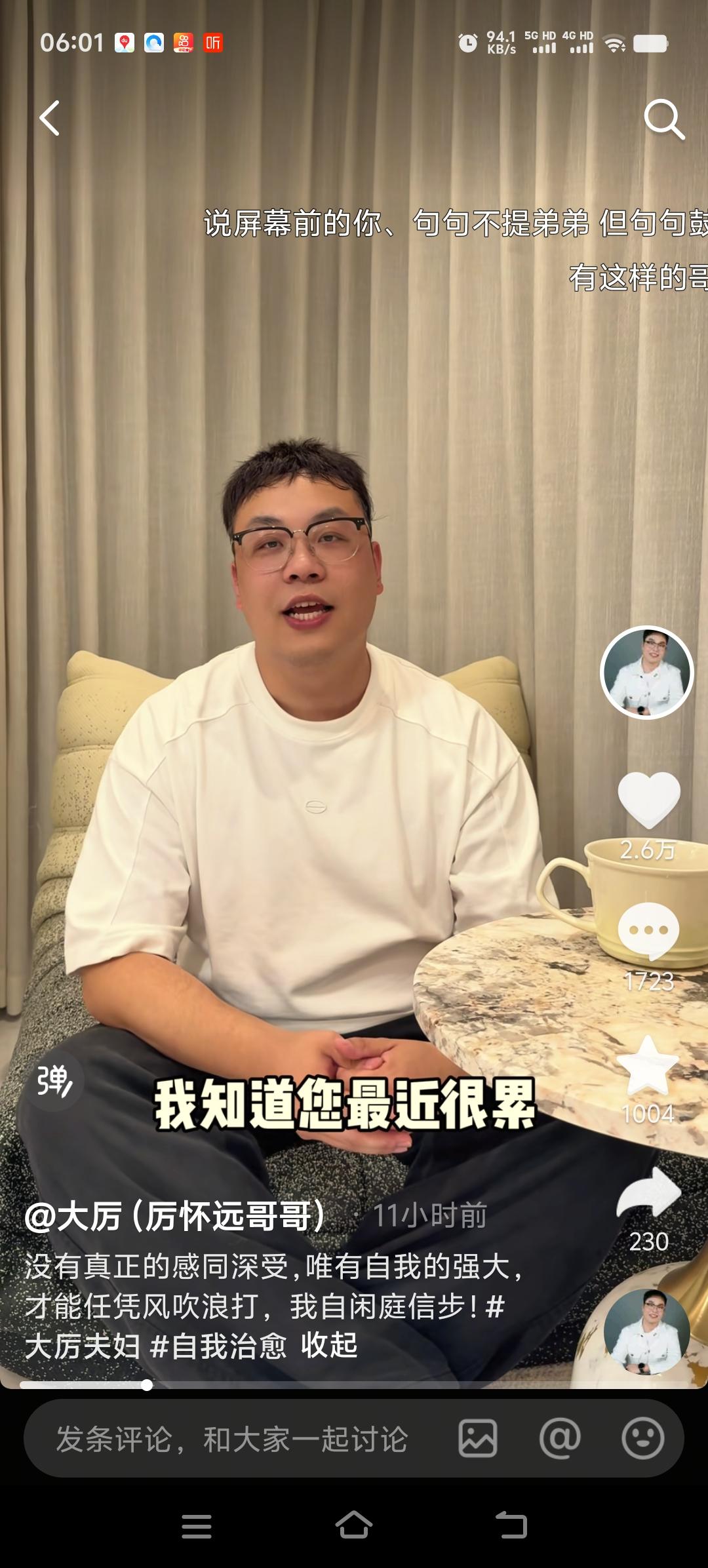 还是厉怀远的哥哥活得通透。他发布视频,称知道大家最近活得很累。这话看似是说给镜头前的每一位粉丝网友,实则是在劝解弟弟。一个人不可能什么都拥有,可也不会什么都没有。把明天的勇气留给清晨,把昨夜的疲惫交给星空。弟弟,你最近太累了,不光心灵疲惫,身体也吃不消。你独自打理着自己的三亩果园,哥哥担心你撑不下去,这才是真正的手足情深。 爆料