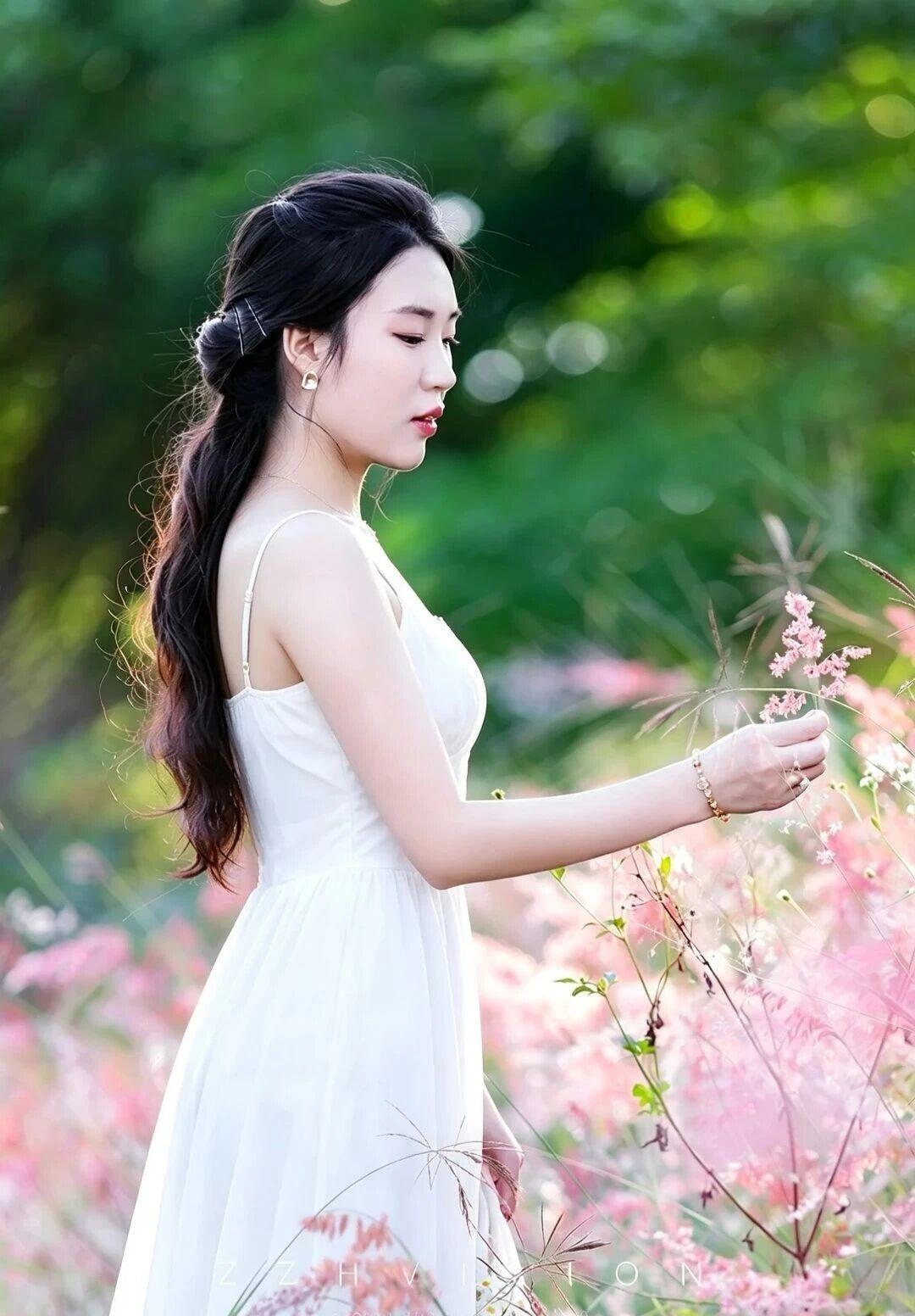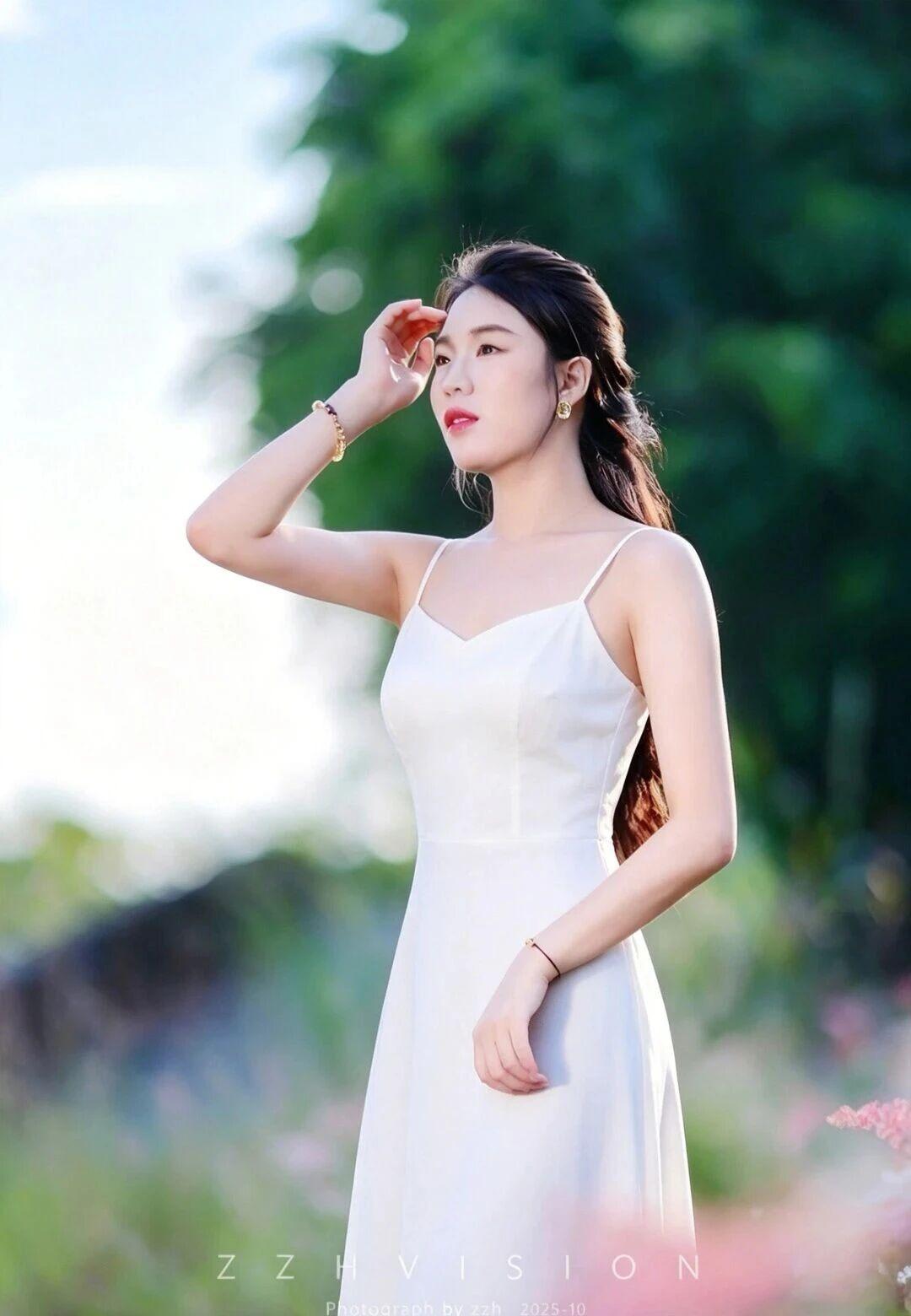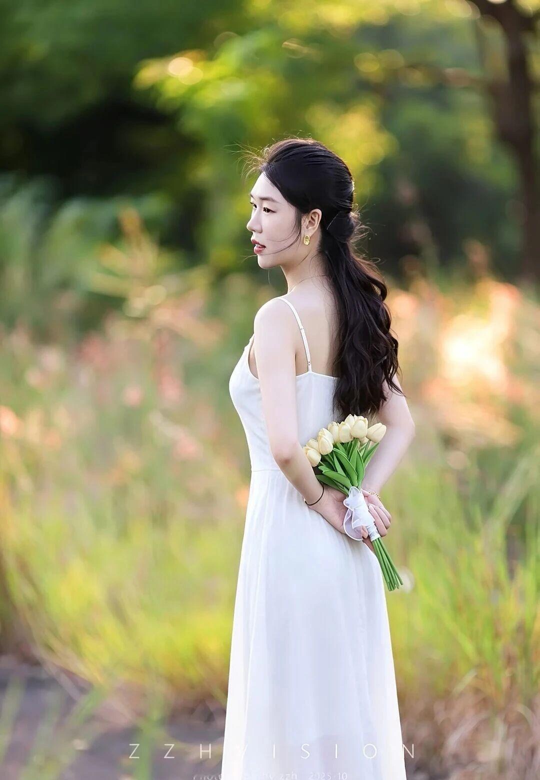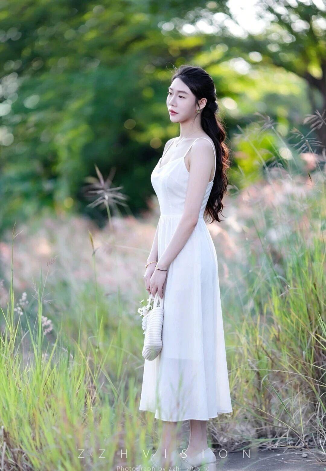 ✨温柔氛围感全描写 她一身极简干净的白色垂感吊带长裙,简约V领细吊带版型,温柔勾勒舒展身形,轻盈雪纺面料自带仙气,干净纯白自带圣洁温柔气质,简约又高级。 黑长卷发半扎温婉盘发,余下发丝慵懒垂落,温柔又氛围感十足;五官精致柔和,眉眼温婉清冷,唇色温柔动人,气质干净素雅。细碎小巧的耳饰、细项链、金手链做极简精致点缀,温柔又不浮夸。 置身秋日粉黛草与绿野林间,温柔逆光柔光氛围感拉满,暖调自然光衬得皮肤白皙通透。或是轻捻花草、手捧郁金香、静坐凝望,神态恬静淡然,一颦一笑都温柔治愈,自带清冷又温婉的知性气质,清冷素雅、温柔大气,像林间治愈月光,干净又自带东方温柔美感。