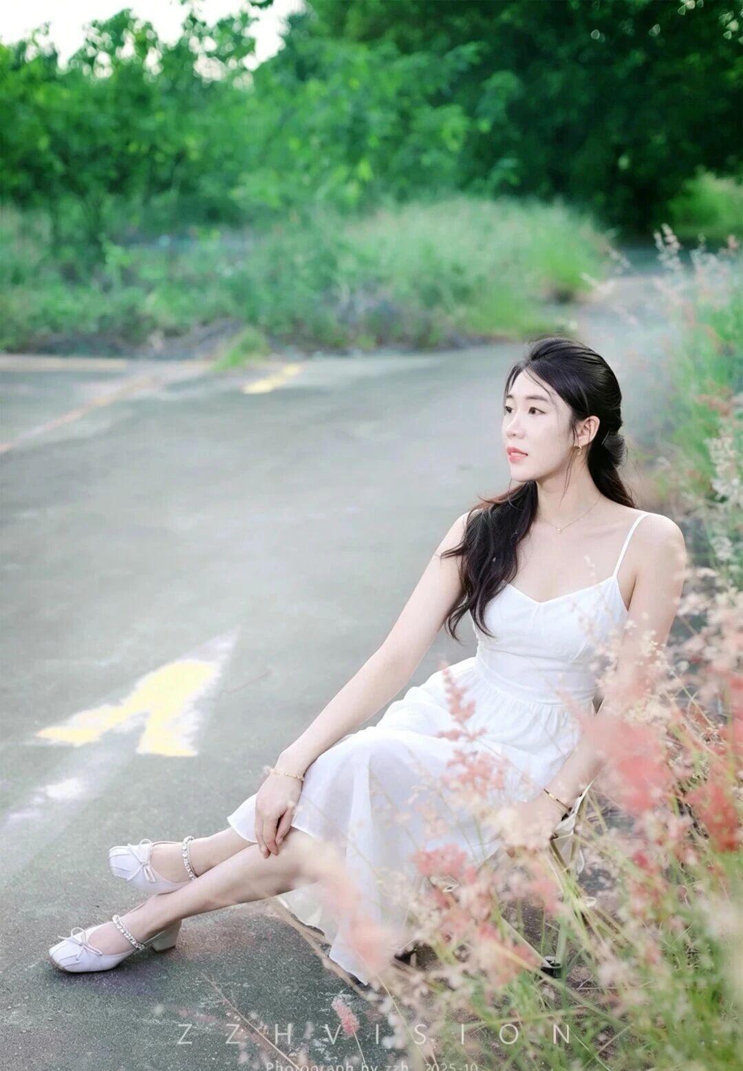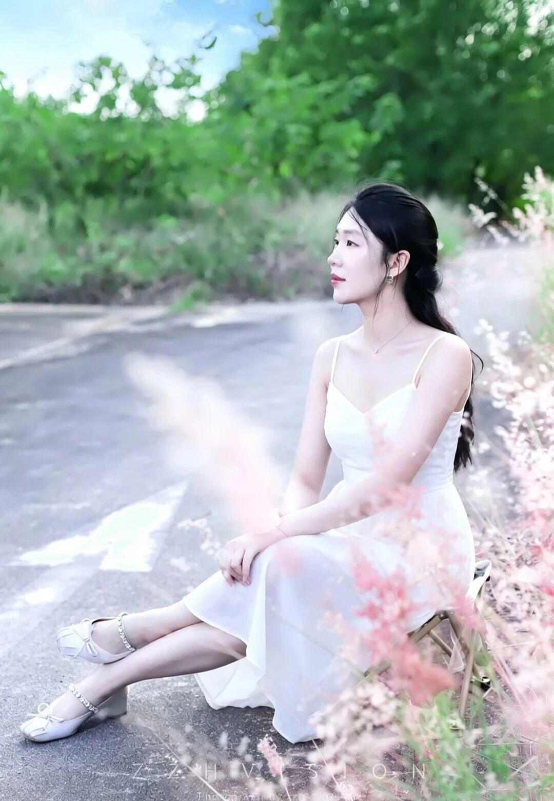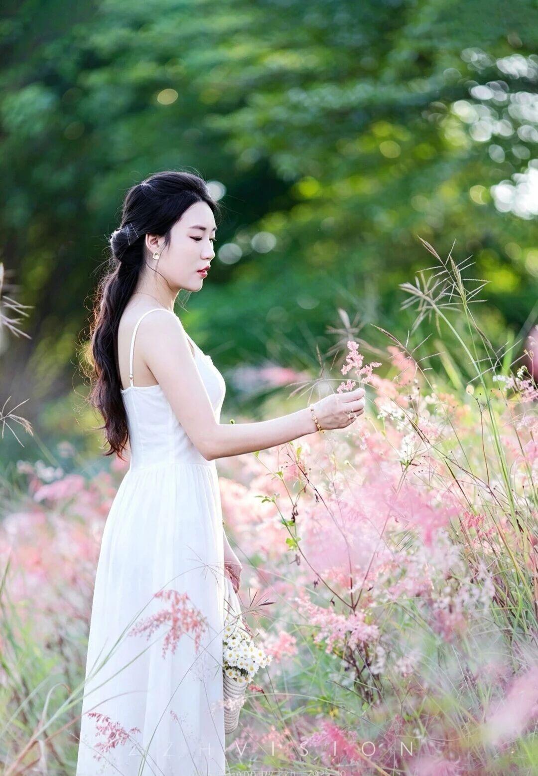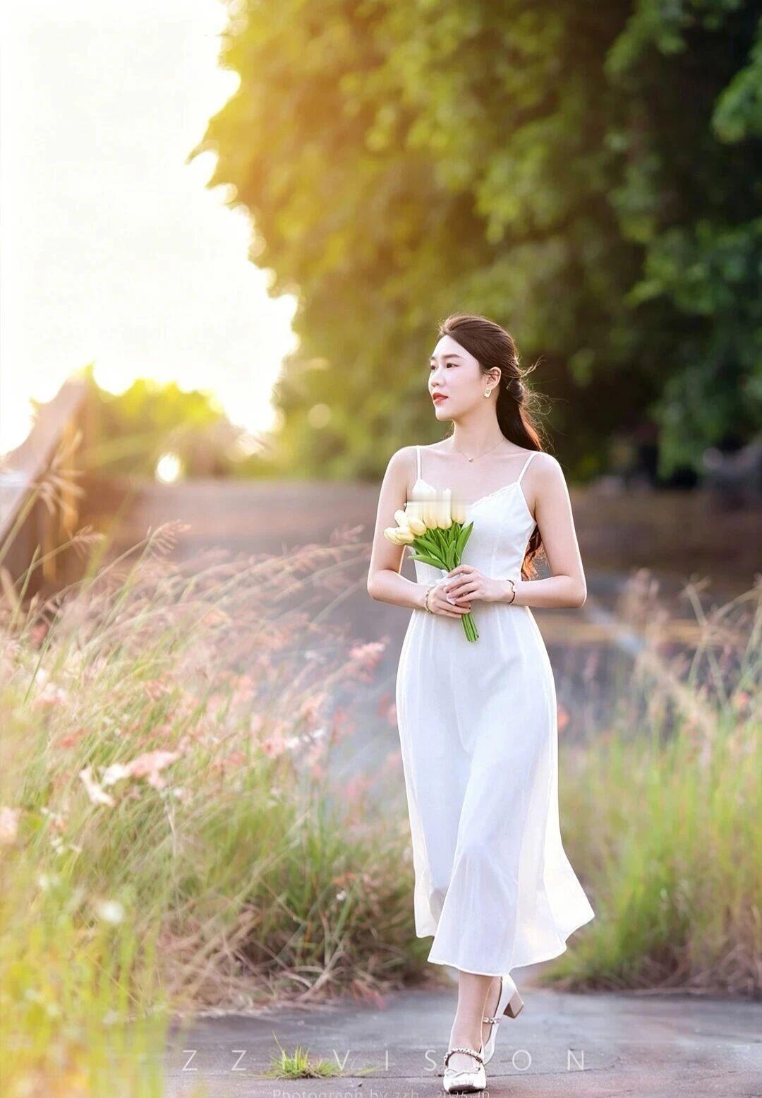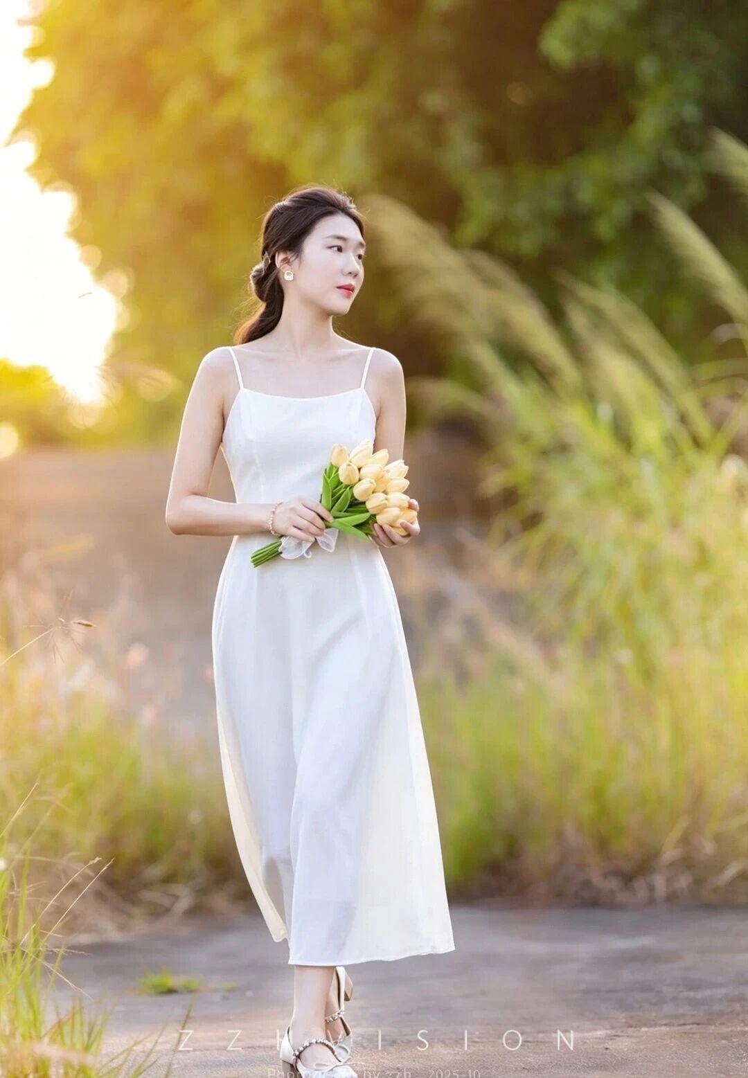 ✨温柔氛围感全描写 她一身极简干净的白色垂感吊带长裙,简约V领细吊带版型,温柔勾勒舒展身形,轻盈雪纺面料自带仙气,干净纯白自带圣洁温柔气质,简约又高级。 黑长卷发半扎温婉盘发,余下发丝慵懒垂落,温柔又氛围感十足;五官精致柔和,眉眼温婉清冷,唇色温柔动人,气质干净素雅。细碎小巧的耳饰、细项链、金手链做极简精致点缀,温柔又不浮夸。 置身秋日粉黛草与绿野林间,温柔逆光柔光氛围感拉满,暖调自然光衬得皮肤白皙通透。或是轻捻花草、手捧郁金香、静坐凝望,神态恬静淡然,一颦一笑都温柔治愈,自带清冷又温婉的知性气质,清冷素雅、温柔大气,像林间治愈月光,干净又自带东方温柔美感。
