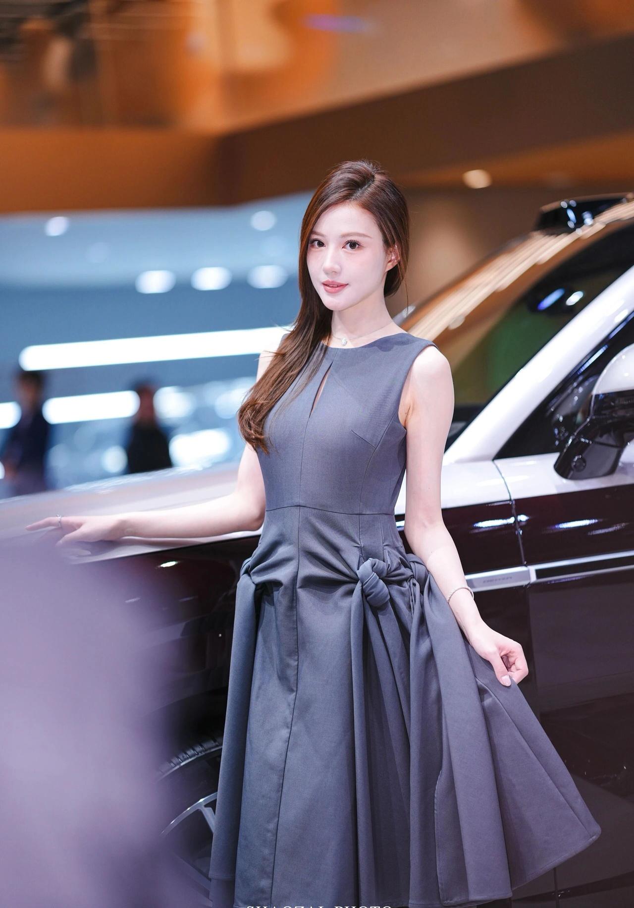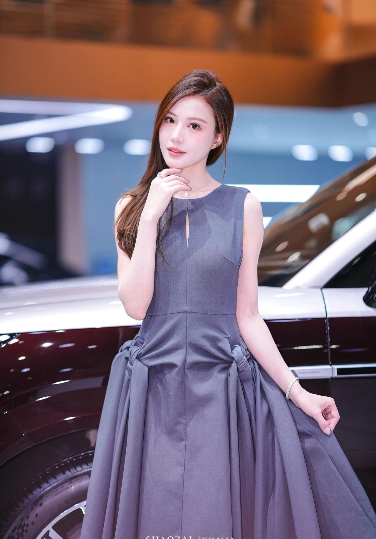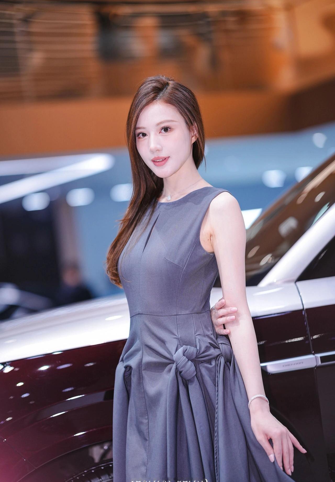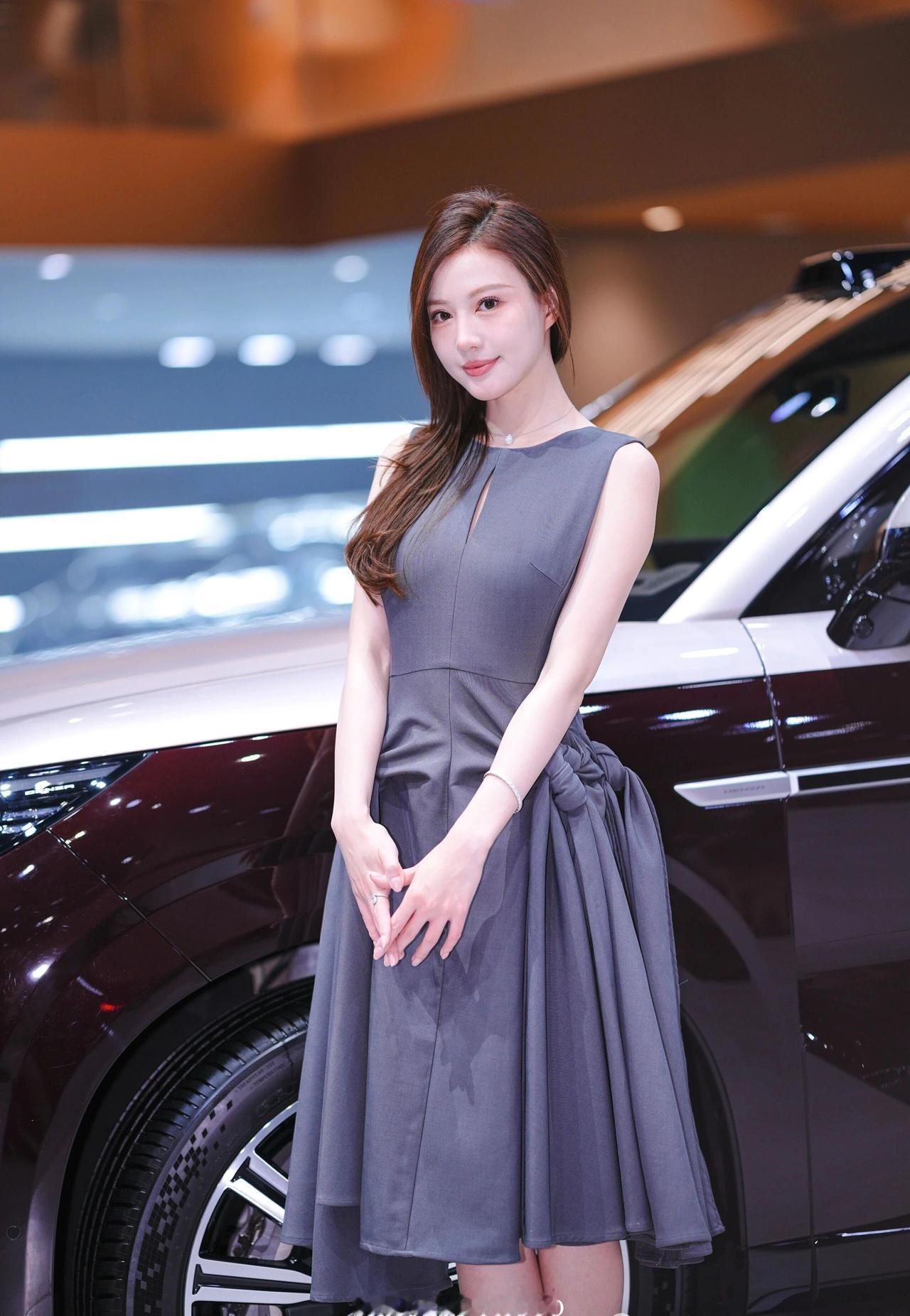 车展氛围感写真解析 穿搭造型 一身高级灰无袖收腰连衣裙,简约圆领+胸口小心机镂空设计,腰部侧边立体扭结大裙摆,版型利落又显贵气,完美勾勒身形线条;搭配细钻项链、精致手链与戒指,简约轻奢配饰低调精致,温柔又大气,成熟知性御姐气质拉满。 温柔棕调侧分长卷发,妆容干净清透,眉眼精致温婉,气质端庄优雅。 场景氛围 室内车展展馆环境,身后是双拼色豪华SUV展车,暖调展馆灯光柔和通透,背景虚化干净高级,商务大气的车展现场质感,精致光影把优雅氛围感拉满。 神态姿态 多组灵动温柔的车展拍摄姿势,站姿端庄、侧身回眸、轻托脸颊、撩发提裙,神态温婉灵动,眼神温柔动人,一颦一笑都优雅大方,端庄又温柔,车展出片模板。 画面质感 高清车展直出画质,光影柔和细腻,灰调穿搭和展馆暖光完美适配,低调高级又温柔大气,知性轻奢氛围感十足。