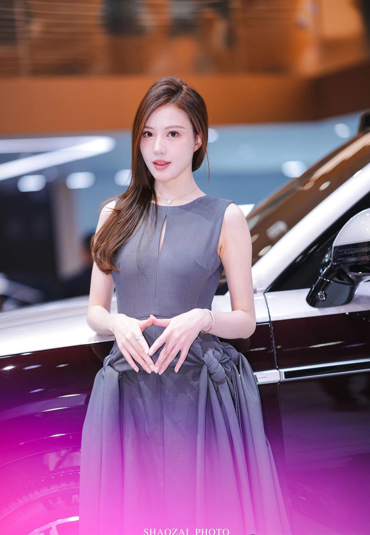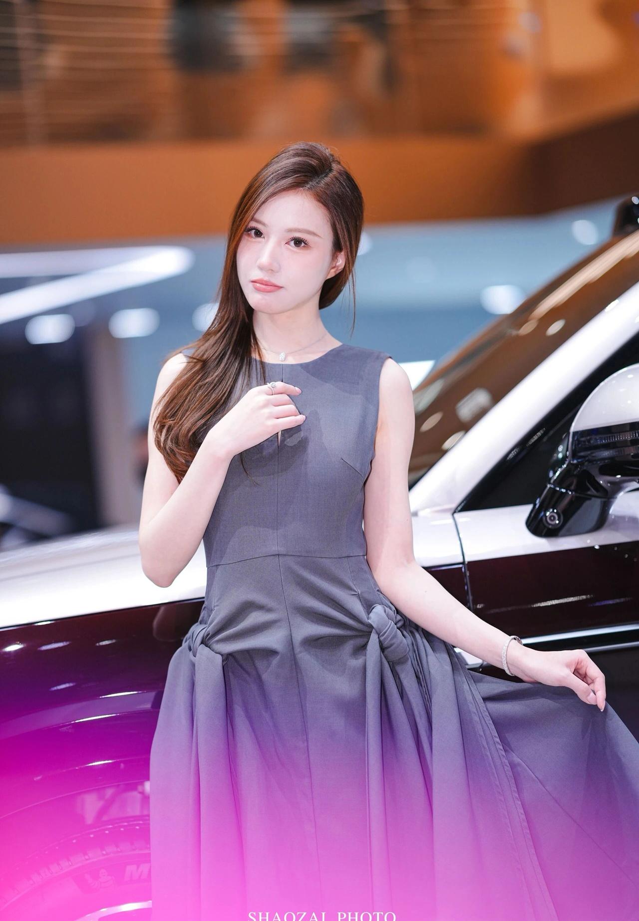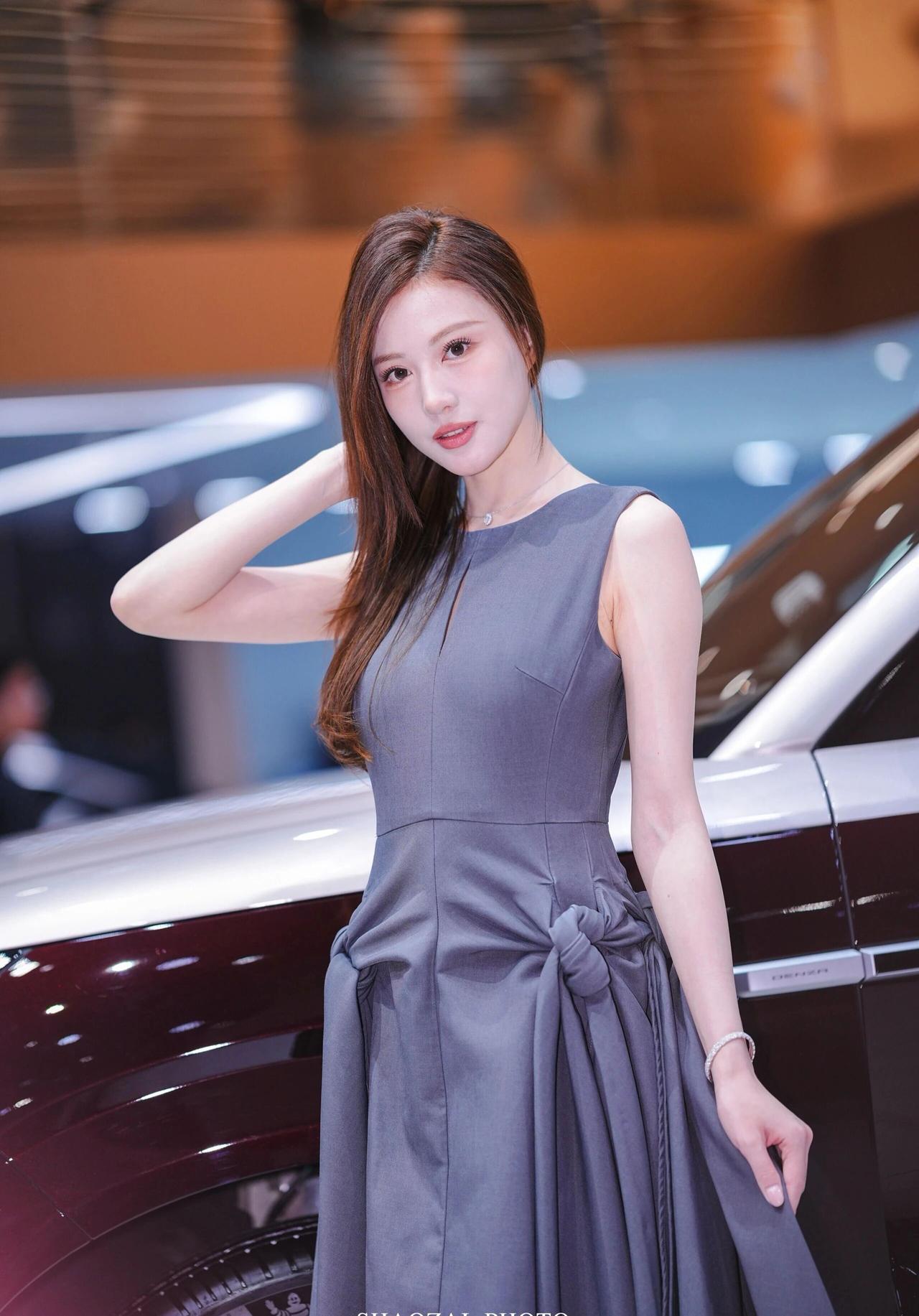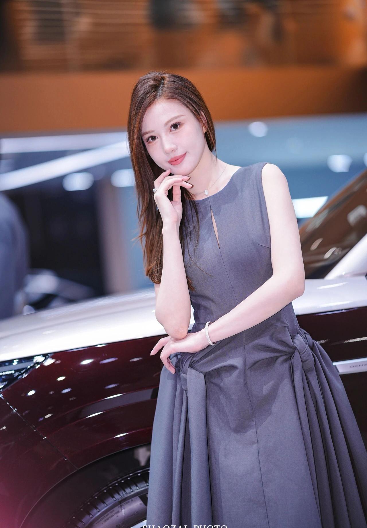 车展氛围感写真解析 穿搭造型 一身高级灰无袖收腰连衣裙,简约圆领+胸口小心机镂空设计,腰部侧边立体扭结大裙摆,版型利落又显贵气,完美勾勒身形线条;搭配细钻项链、精致手链与戒指,简约轻奢配饰低调精致,温柔又大气,成熟知性御姐气质拉满。 温柔棕调侧分长卷发,妆容干净清透,眉眼精致温婉,气质端庄优雅。 场景氛围 室内车展展馆环境,身后是双拼色豪华SUV展车,暖调展馆灯光柔和通透,背景虚化干净高级,商务大气的车展现场质感,精致光影把优雅氛围感拉满。 神态姿态 多组灵动温柔的车展拍摄姿势,站姿端庄、侧身回眸、轻托脸颊、撩发提裙,神态温婉灵动,眼神温柔动人,一颦一笑都优雅大方,端庄又温柔,车展出片模板。 画面质感 高清车展直出画质,光影柔和细腻,灰调穿搭和展馆暖光完美适配,低调高级又温柔大气,知性轻奢氛围感十足。