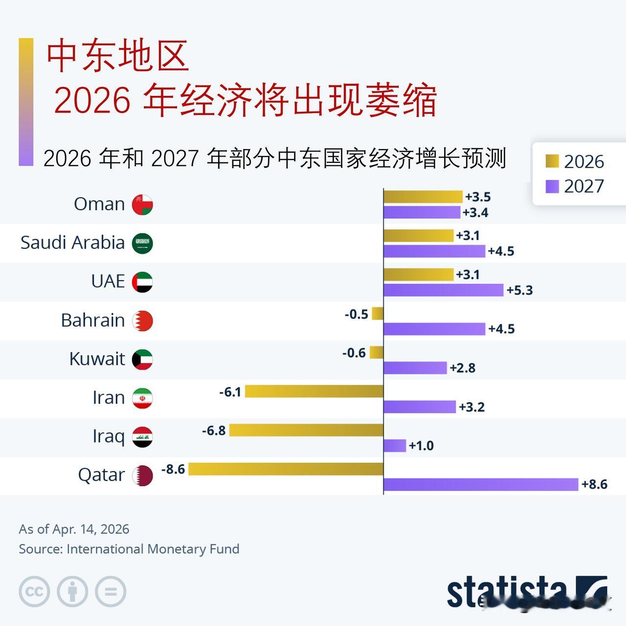 中东地区经济2026年将收缩多少? 国际货币基金组织于4月14日发布最新一期《世界经济展望》报告,数据显示,受2月底爆发的伊朗战争影响,多个中东经济体预计在2026年陷入收缩。该组织已将全球经济增长预期下调至3.1%。 不过,这一总体数据掩盖了地区间的差异:中东与中亚地区2026年经济增速预计放缓至1.9%,较1月的预测值下降3个百分点。 国际货币基金组织警示,直接受冲突波及的大宗商品出口国,因生产与出口规模缩减,经济预期遭大幅下调。冲击程度将取决于能源与交通基础设施的受损程度,以及各国对霍尔木兹海峡的依赖度和替代出口通道的可及性。 受此影响,伊朗、伊拉克和卡塔尔预计将出现最为严重的经济收缩。若未来数月能源生产与运输通道恢复正常,该地区整体经济有望在2027年反弹。 如下图所示,自1月以来,伊朗2026年经济增长预期被下调7.2个百分点,至-6.1%;沙特阿拉伯的经济预期则下调1.4个百分点,至3.1%。