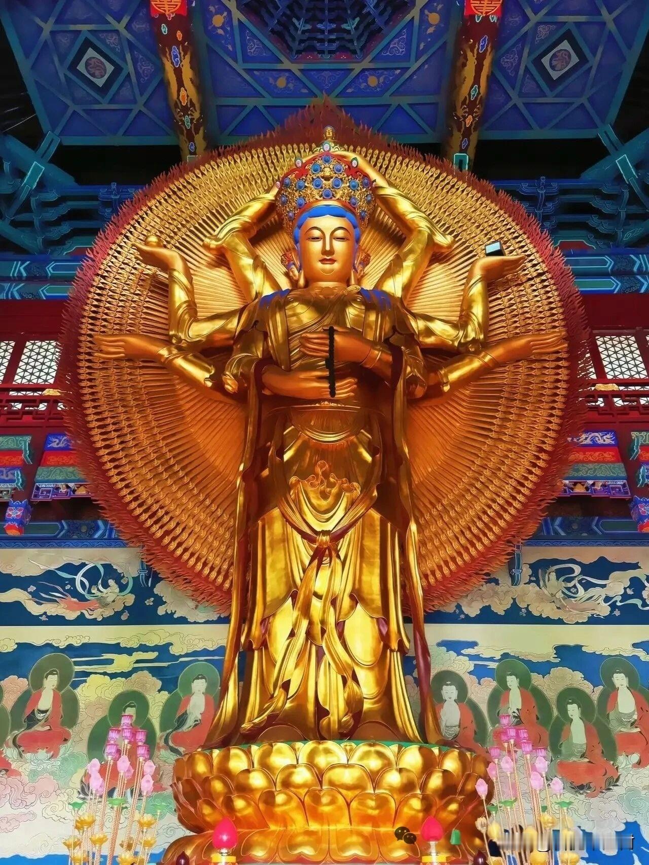 文殊智光照处,便是人间清醒时 金辉流转处,是五台山千年未凉的佛国月光。 无论是广化寺里规整庄严的千臂千钵文殊,还是竹林寺中依山而建、温润灵动的圣像,那鎏金衣褶间流淌的,皆是穿越时空的智慧与慈悲。 千臂舒展,不是张扬,而是遍洒慈悲,誓愿度尽十方苦厄;千钵生辉,不是虚妄,每一只金钵里都端坐化佛,藏着“一念三千”的圆满,藏着破除无明、通达彼岸的般若真心。 红尘滚滚,我们总在奔波中迷失,在琐碎里困顿,像迷途的舟子,不知何处是岸。而文殊菩萨的垂眸,从来不是俯视众生的艰难,而是以大智慧为灯,照亮我们心头的蒙尘。 它教我们:于喧嚣中守一份清醒,于繁杂中留一份纯粹。不必执着于一时的得失,不必困于眼前的烦恼,如文殊般,以智慧为剑,斩断纷扰,以慈悲为舟,渡己亦渡人。 今日见此圣像,便是缘。愿文殊智光照进你心底,解你千结,开你万惑。愿你心有文殊,眼有星河,行有坦途,在这人间烟火里,活得通透、自在、丰盈。 心有智慧,万事顺遂;心有慈悲,岁岁安康。🙏 佛教 五台山 山西旅游