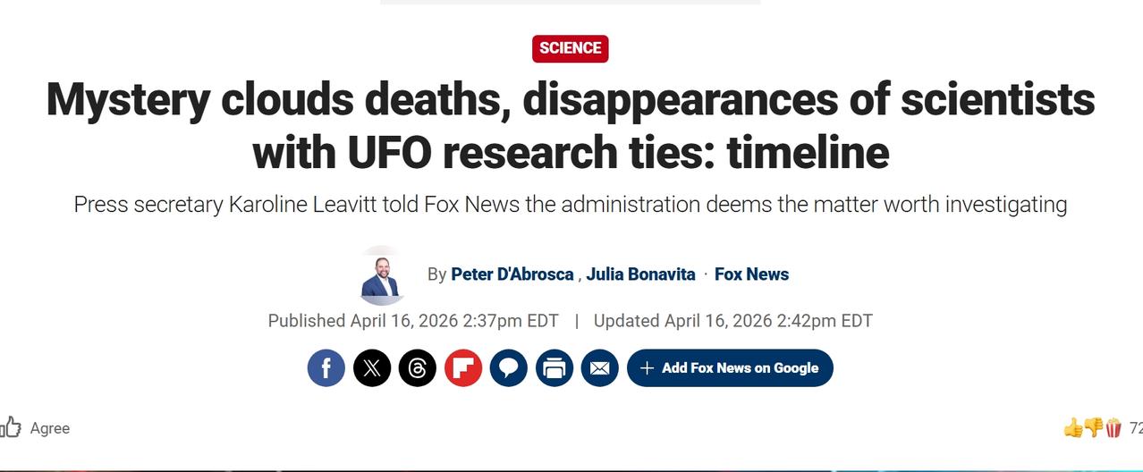 2023年以来,美国至少有八名UFO研究有关联的高级科学家死亡或失踪 当地时间周三,福克斯新闻记者彼得·杜西问到这一问题时,白宫新闻秘书卡罗琳·利维特表示,特朗普政府很可能会对此事进行调查。她说:“我还没和相关机构谈过。我一定会这么做,我们会给你一个答复,如果属实,当然,我认为这绝对是政府及其政府值得调查的事情。那就让我来帮你吧。” 1)迈克尔·大卫·希克斯 希克斯曾于1998年至2022年在NASA喷气推进实验室担任科学家。他参与了航天计划的双小行星重定向测试(DART)项目,重点是了解小行星和彗星的物理特性,以及它们是否可以在外太空被重新定向。于2023年7月30日死亡,时年59岁,死因未公布。 2)弗兰克·迈瓦尔德 迈瓦尔德为一个名为表面生物学与地质学(SBG)的项目设计了一项关键仪器——可见光到短波红外线(VSWIR),这是NASA未来的任务,旨在将卫星送入太空,并以远超人眼观测的细节绘制地球的“活色彩”地图。在去世前一年多,他正在参与一项项目,帮助宇航员识别其他行星上的生命迹象,包括木星的卫星欧罗巴、土星的卫星、土卫二以及矮行星谷神星。于2024年7月4日死亡,时年61岁,死因未公布。 3)莫妮卡·雷扎 缺失日期:2025年6月22日 年龄:60岁 状态:未知 莫妮卡·雷扎曾在NASA喷气推进实验室担任航空航天工程师,负责监督该实验室的材料加工组,该组“专注于航天器新材料和先进制造技术,专注于散装金属玻璃合金和金属增材制造”。于2025年6月22日失踪,时年60岁,至今下落不明。 4)梅丽莎·卡西亚斯 缺失:2025年6月26日 年龄:53岁 状态:未知 卡西亚斯曾在新墨西哥州洛斯阿拉莫斯国家实验室担任行政助理,该实验室为曼哈顿计划开发核武。于2025年6月26日失踪,时年53岁,至今下落不明。 5)安东尼·查韦斯 查韦斯y曾在洛斯阿拉莫斯国家实验室工作,直到2017年退休。于2025年5月8日失踪,时年79岁,至今下落不明。 6)史蒂文·加西亚 加西亚曾在堪萨斯城国家安全园区工作,开发制造核武器的大部分非核组件,他有最高机密安全许可。于2025年8月28日失踪,时年48岁,至今下落不明。 7)卡尔·格里尔迈尔 格里尔梅尔是加州理工红外处理与分析中心的著名研究科学家,该中心与NASA喷气推进实验室合作,提供“科学运营、用户支持、档案和数据服务以及科学愿景,以最大化太空和地面天文台的发现。”还参与了NASA的太空望远镜项目。于2026年2月16日在家门外被29岁的弗雷迪·斯奈德枪杀,动机不明,时年47岁。 8)退役空军少将威廉·尼尔·麦卡斯兰 麦卡斯兰曾任空军研究实验室指挥官,并与洛斯阿拉莫斯国家实验室有联系,据报道,他掌握了关于UFO的绝密信息。于2026年2月27日失踪,时年68岁,至今下落不明。