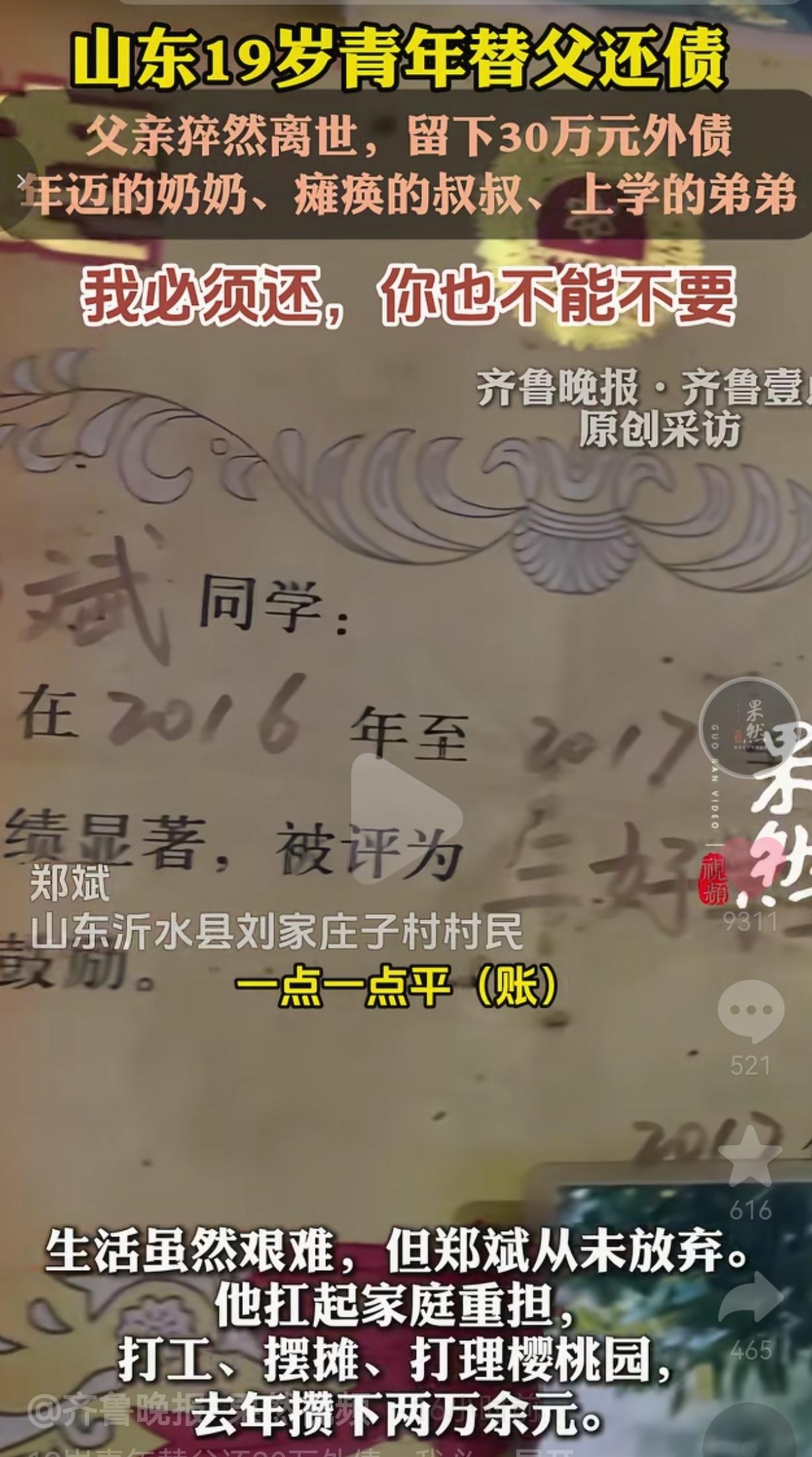 山东19岁男孩替父还债,年夜饭4个菜,却说这是最开心的一年! 父亲去世留下30万外债,母亲改嫁,家里还有瘫痪的叔叔、70多岁的奶奶和7岁的弟弟,他一句“债必须还,你也不能不要”,扛起了整个家! 这个男孩叫郑斌,山东沂水县的。2024年6月,他17岁,父亲突发心梗走了,没留下一句交代,只留下了30多万的外债。 紧接着,母亲改嫁了。家里瞬间就剩下他、70多岁的奶奶、瘫痪十几年的叔叔,还有一个7岁的弟弟。天,说塌就塌了。 很多人都劝他:“你一个孩子,别管了,法律上你也没义务还。”可郑斌不这么想,他说:“这是我爸欠的,他走了,我不能让别人戳他脊梁骨。” 从那天起,他就成了家里的顶梁柱。白天打工、摆摊,晚上打理家里的樱桃园,什么苦活累活都干。去年一整年,他省吃俭用,攒下了两万多块钱。 今年春节前,他拿着这笔钱,挨个联系债主。他说:“可能一次还不完一家,但必须给,给多给少我都得给一些,还完一家再还另一家。” 他挨家挨户地还钱,债主们看着这个半大孩子,有的不忍心要,他却固执地说:“我必须还,你也不能不要。” 那个年,他的年夜饭只有四个菜,简单得不能再简单。可他却笑着说:“这是我过的最轻松的一个年,也是吃过最开心的年夜饭。”因为他终于靠着自己,给父亲争回了体面。 网友看到后评论说:这孩子太实在了!现在能有这份担当的年轻人,真的太少了!他爸在天上看着,也得欣慰! 也有的网友说:我19岁的时候还在伸手要钱呢,他却扛起了一个家,还想着替父还债,太戳心了! 还有的网友说:这就是刻在骨子里的诚信和骨气!哪怕日子再难,也不能欠别人的,这孩子未来绝对差不了! 更有网友表示:他不是在还债,他是在守住一个家的尊严,守住一个少年的初心啊。 说实话,我被这个19岁的男孩,狠狠破防了。 现在的社会,多少人遇到事就想着甩锅、躺平,可他呢?明明自己也是个孩子,却硬生生扛起了所有。 他不是不知道可以不还,也不是不知道可以一走了之,可他就是过不了自己心里的那道坎。 他说,不能让别人戳他爸的脊梁骨。这句话,比任何豪言壮语都让我感动。他守住的,不只是一笔债务,更是父亲的名声,一个家的体面,还有他自己做人的底线。 他每天起早贪黑,省吃俭用,连年夜饭都只有四个菜,可他却说这是最开心的年。因为他终于用自己的双手,挺直了腰杆,告诉所有人:郑家的债,郑家的孩子认! 这份骨气,这份担当,比什么都珍贵。 郑斌的故事,没有惊天动地的剧情,却比任何偶像剧都戳心。他用自己的行动,告诉了我们什么叫诚信,什么叫担当,什么叫男人的责任。 他不是在替父还债,他是在为自己的人生铺路。一个能在绝境里守住诚信和骨气的孩子,未来一定差不了。 也希望这个少年,能被这个世界温柔以待,往后的路,能少一点风雨,多一点阳光。