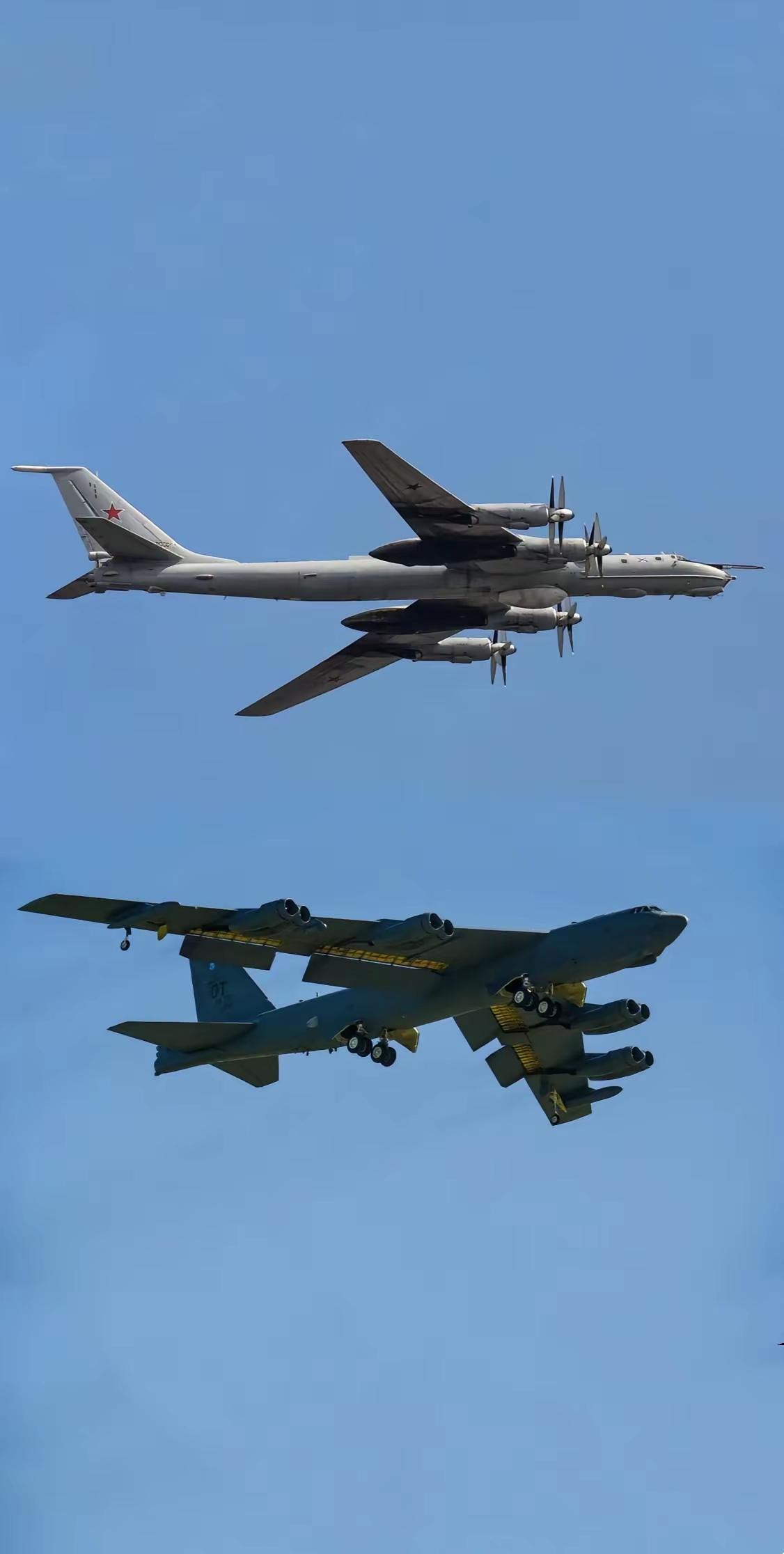 美国和俄罗斯两款战略轰炸机,图-95和B-52。美俄中轰炸机 都是服役半个世纪以上的老爷机了,现如今依然活跃。两款完全不同设计风格的轰炸机也代表着两国在军事装备上的差距。 两款轰炸机都可以进行跨洲际飞行,都可以进行核威慑,是两款三位一体核打击中空中平台不可或缺的一环。
