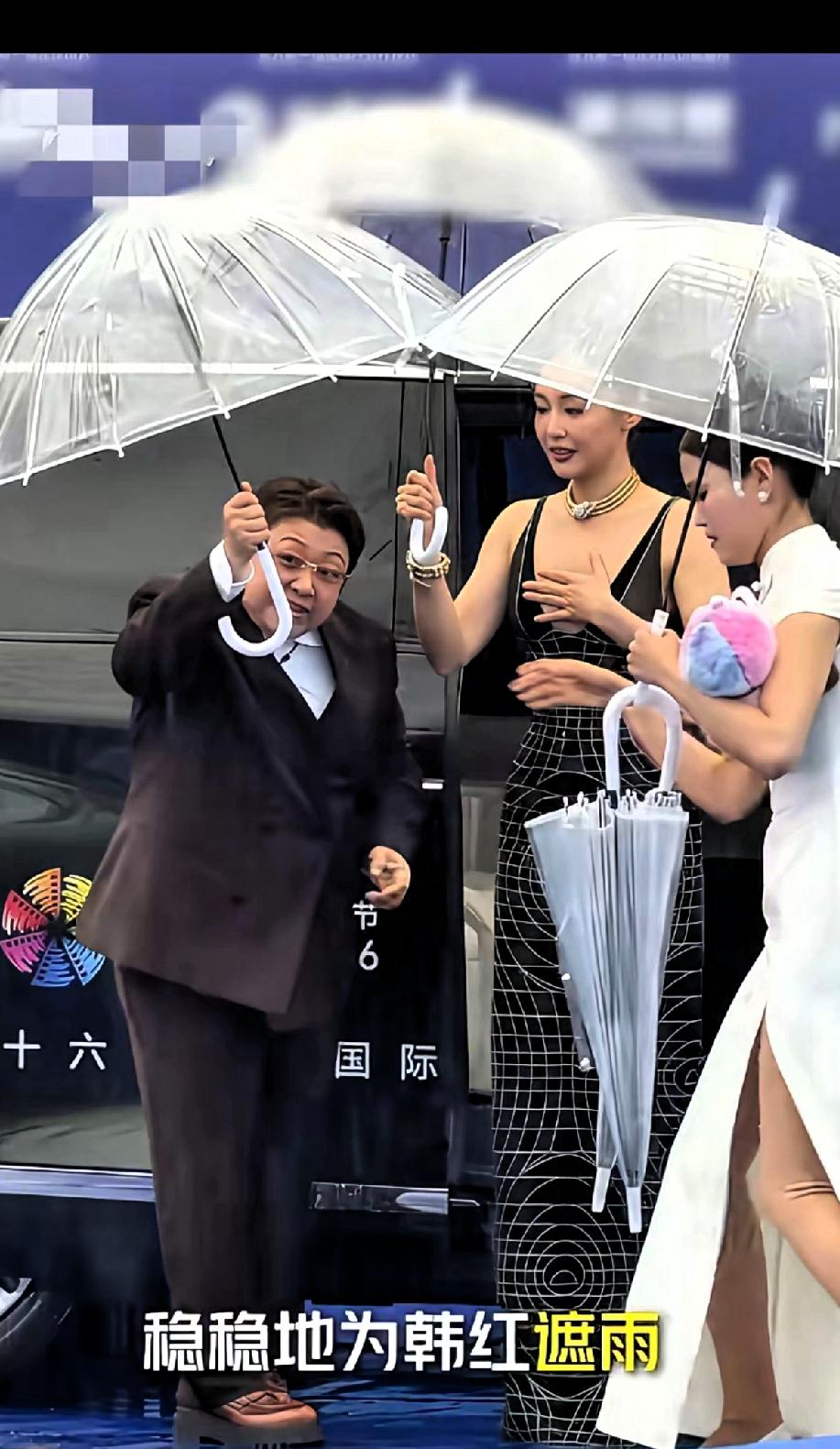 骨子里带滴善良! 北京国际电影节,韩红和高叶一同出席,现场下着瓢泼大雨,韩红下车后紧皱眉头,而高叶穿着性感吊带长裙,穿着恨天高,整个人冻到发抖,韩红立刻转身伸手搀扶高叶下车,而且她当时是淋着雨的状态,把雨伞下的空间都留给了高叶,韩红把高叶扶下车后,也是把伞递给了高叶,避免高叶被雨淋到,破坏了装容,然后才从工作人员手里拿另外一把伞。 于无声处的善良,人情味浓浓,所以说,一个人平常的一举一动,是真正体现一个人的素质!习惯成自然!她这个人的高素质和善良,不愧是内娱慈善第一人,