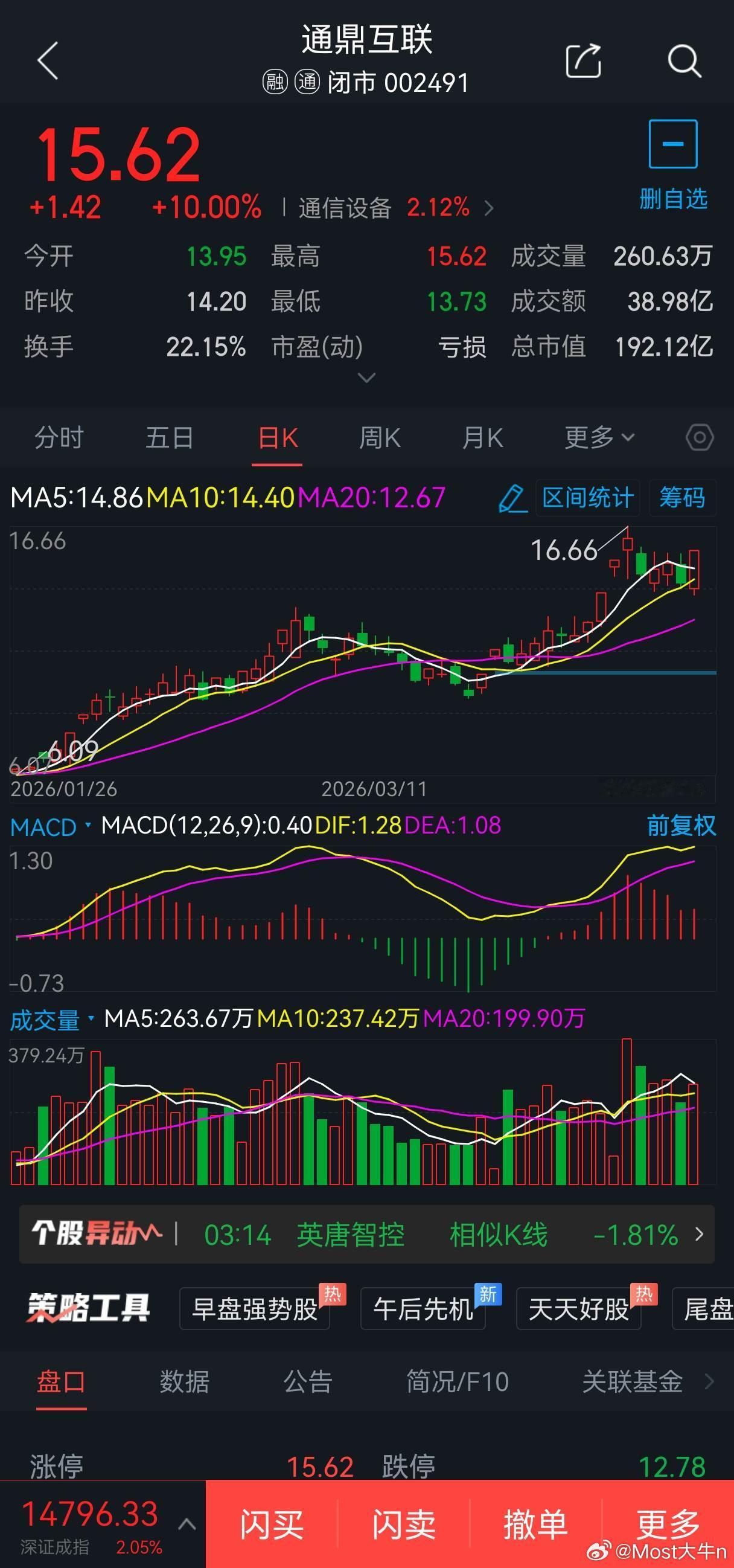 价格到了则参与, 切勿追高,集中资金做一只股票,当天买次日抛,短线操作快进快出!注意事项:因为是提前做功课,某价格附近买入控制在该价格的0.5%以内,比如:10元的股票 在10元附近参与,参与价格可以是10.05元至以下的价格.切勿追高!价格不到,宁愿错过,不要做错,机会每天都有,个人观点,仅供参考!投资有风险,入市需谨慎!$长信科技(SZ300088)$$通鼎互联(SZ002491)$