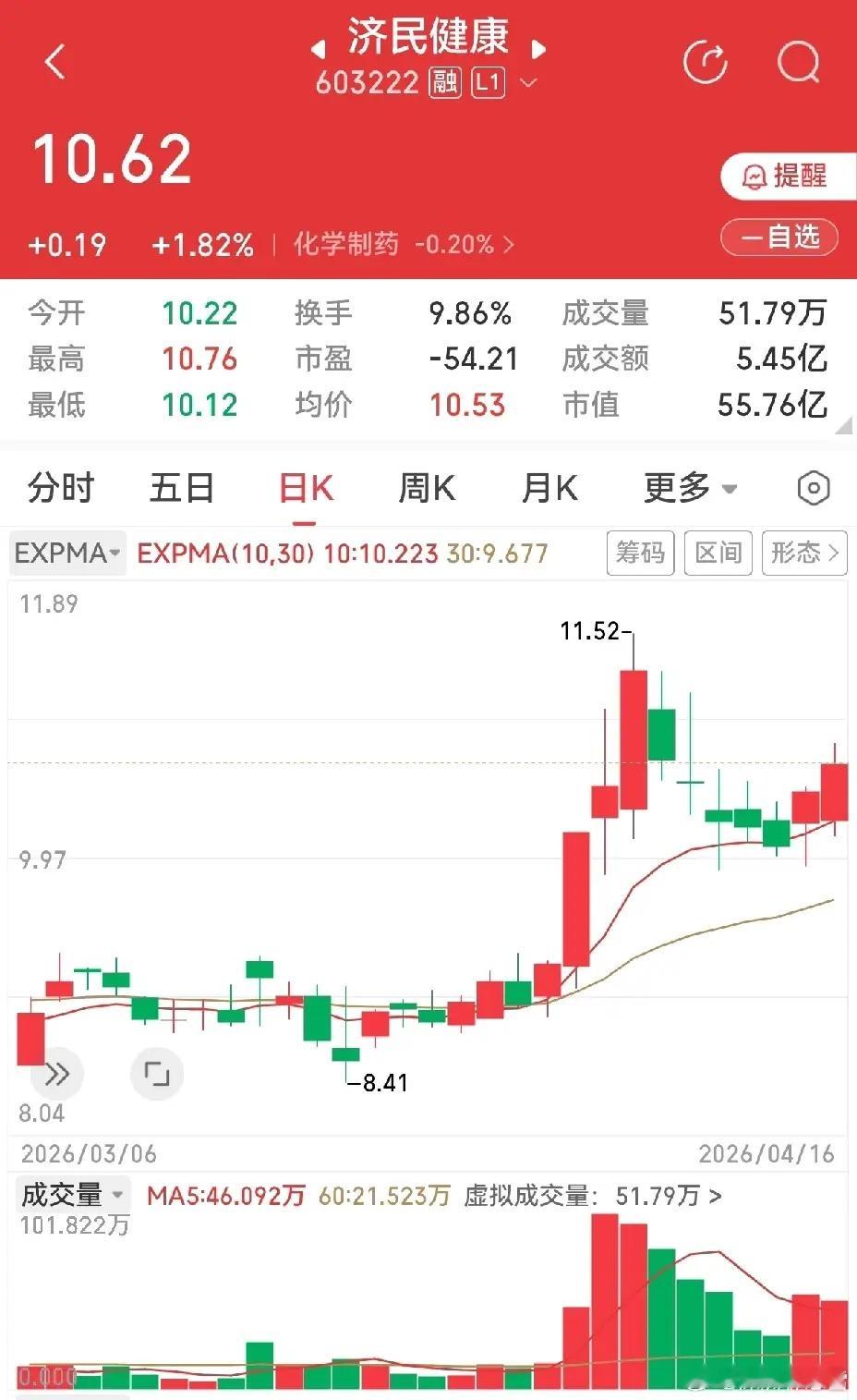 济民健康站稳首板区间,连阴回落之后阳线回暖,趋势支撑稳稳守住;
