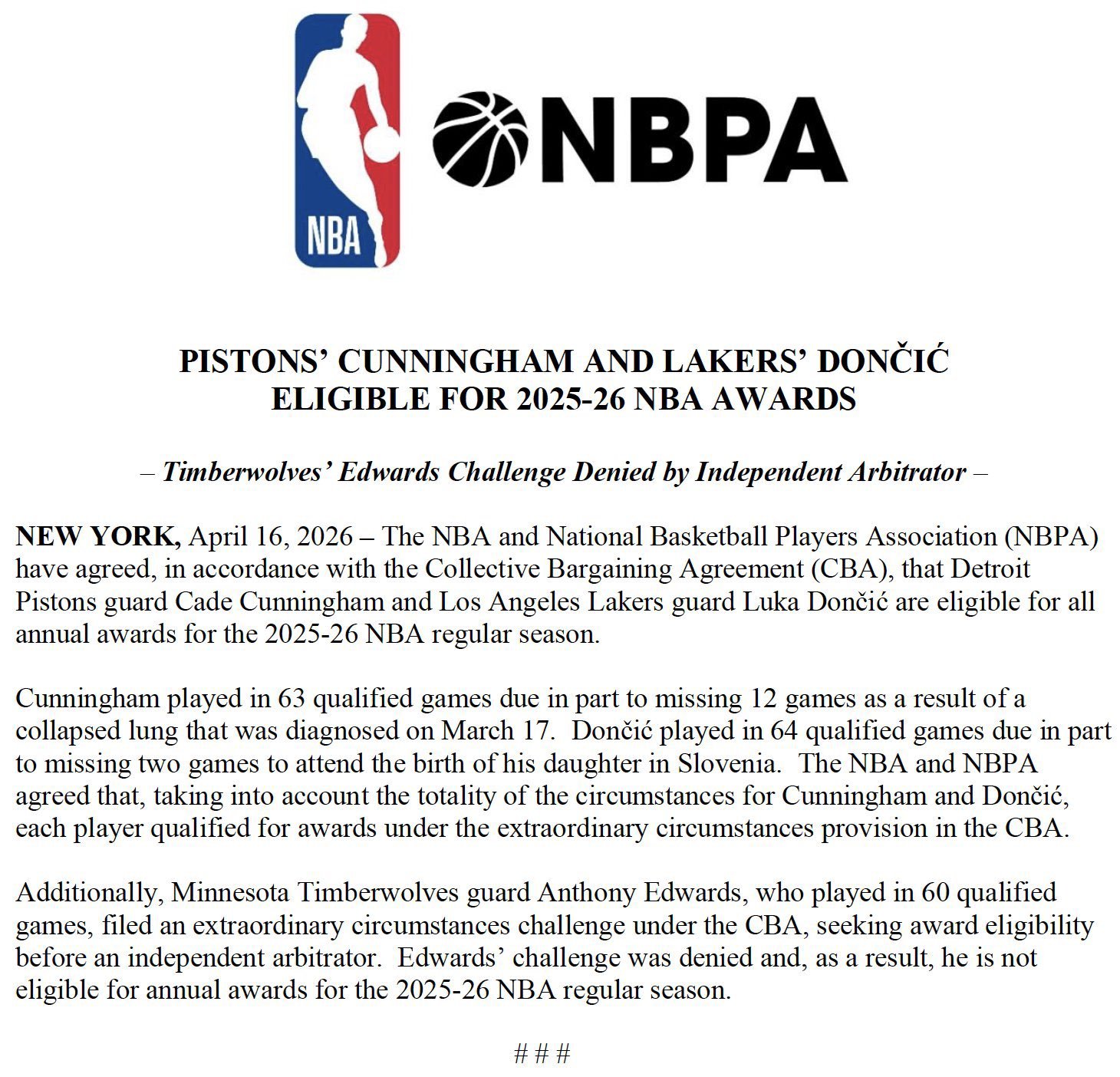 东契奇和坎宁安关于65场评奖的申诉都成功了,而爱德华兹则失败。东契奇差1场,CC