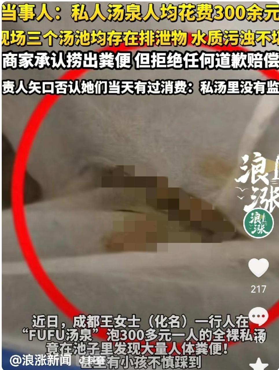 花三百多块钱本来是去享受的,结果却在大池子里捞出了一堆大便,这搁谁谁不崩溃啊? 成都30岁的王女士和朋友花了329元/人,去当地“FUFU汤”汤泉酒店泡全裸私汤,图的就是个干净又私密。 正泡得开心呢,突然听到同池的小孩喊,踩到了软绵绵的东西。王女士当场叫来工作人员打捞,好家伙,全是大便!不止一两坨,还挺多! 更恶心的是,工作人员捞完就当什么事都没有发生一样若无其事,既没换水也没消毒。结果呢,后面竟然还有新客人接着往池子里泡! 王女士当场就炸了,要求商家给个说法。结果老板只轻飘飘来了一句:“这汤池没有监控,我也没法证明你们在里面消费过啊。” 听听,这是什么鬼话?十几双眼睛看着你捞出来的大便,现在跟我说不认账?现场十几号人全看见的,你说没监控就没泡? 更奇葩的是,商家反手就报了警,说王女士她们是恶意敲诈勒索,要走法律流程。 看到这儿我是真服了。出事了不解决问题,反而先想着解决提出问题的人? 三百多块钱,这服务态度也值了。 有时候真不知道现在商家脑子里装的啥,是把钱赚了就行,消费者的健康和权益都不管了? 大家怎么看这事? 如果你遇到这种情况会怎么处理?欢迎评论区留言,咱们一起避雷!