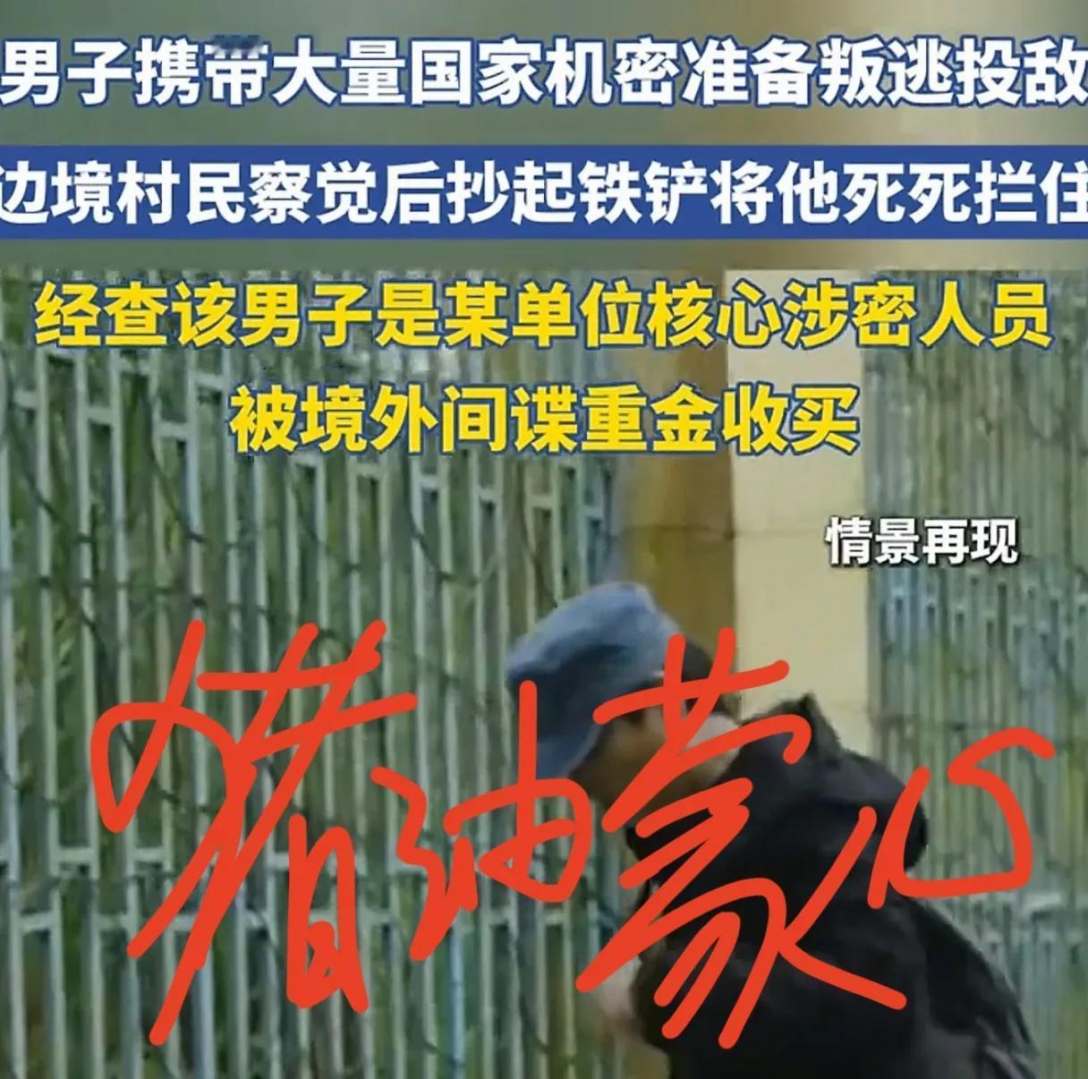 男子携机密叛逃被村民抓包,这男子这智商是如何能接触到机密文件的?还能从单位里带出来,连村民都能看出他有问题,他单位的同事就没能发现吗? 细思极恐,他如果拍照再通过网络把机密文件发出去,那国家损失可就老大了! 为这个村民的英勇行为点赞,在关键时刻挺身而出,这是藏在中国人骨子里的家国情怀,维护国家安全,人人有责。