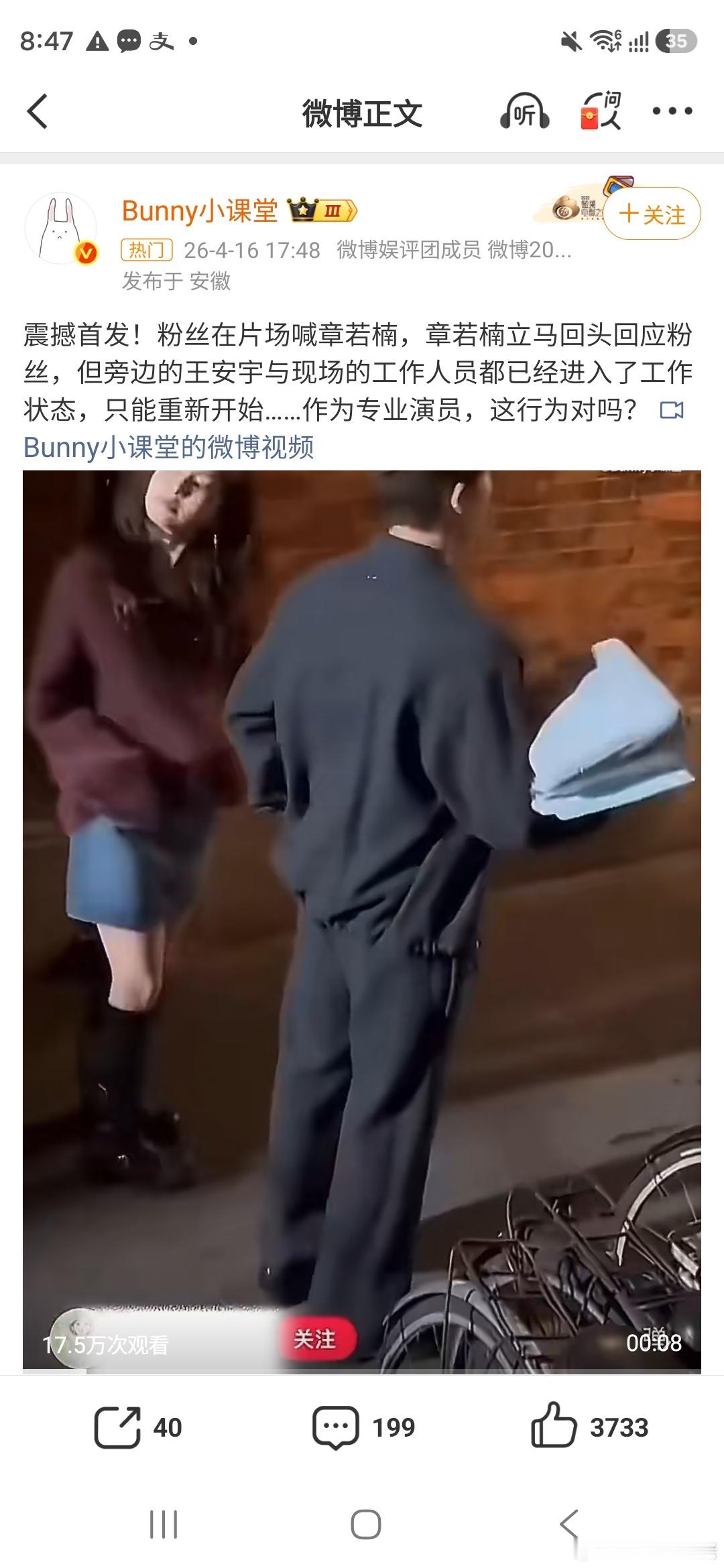章若楠片场拍戏走神 刷到这个,貌似是王安宇粉丝投的营销号,说章若楠开拍后还回头回应粉丝,并且台词说321,这个年代还有演员敢不背台词说数字?