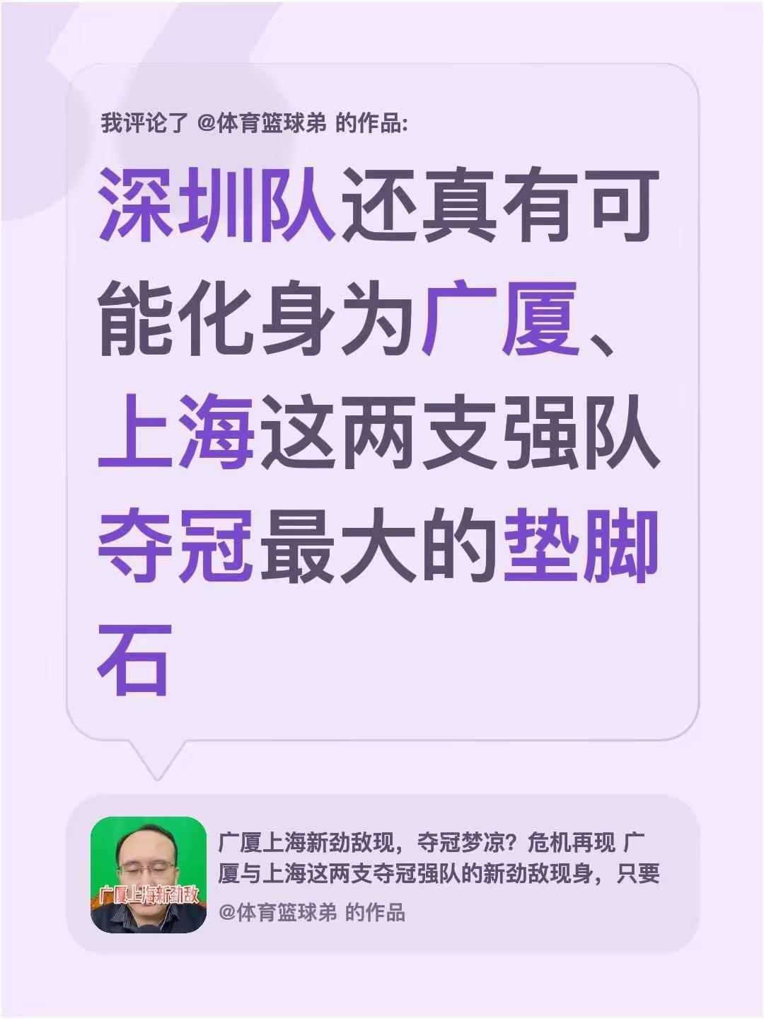我评论了@体育篮球弟 的作品:深圳队还真有可能化身为广厦、上海这两支强队夺冠最大的垫脚石