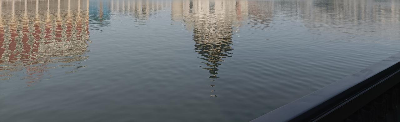 水面的涟漪把建筑倒影揉成流动的油画,几种色彩随波纹轻轻晃动,像一首温柔的城市诗。 这是飞马水城,水面的倒影让一切变得熟悉又陌生。 深色的栏杆给人一种厚实之感,静与动在此刻平衡,这是松弛又治愈的氛围感。