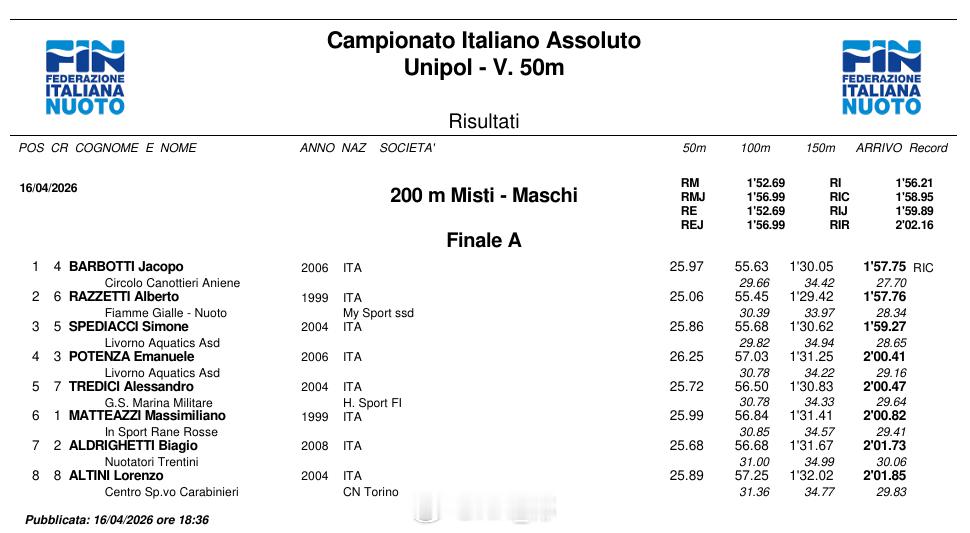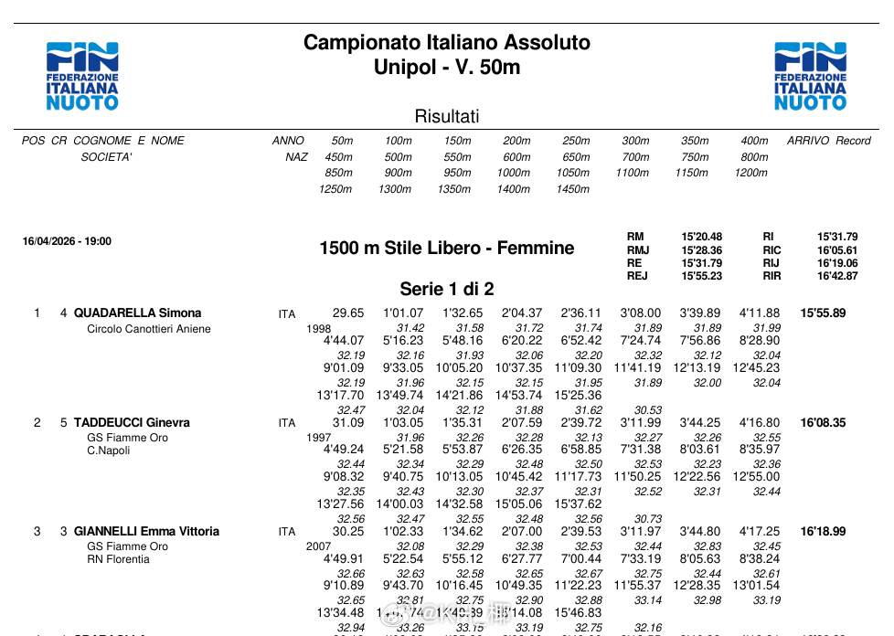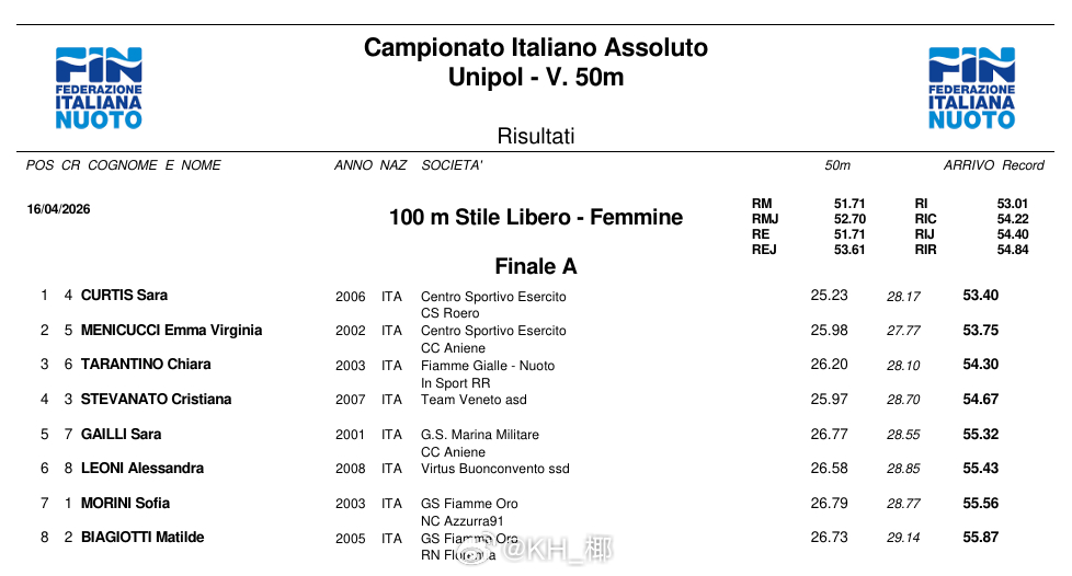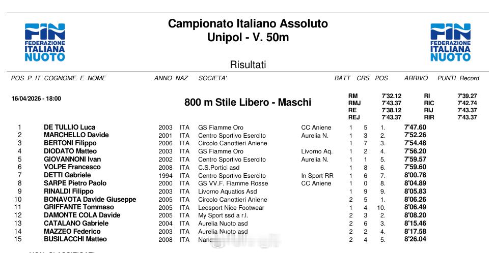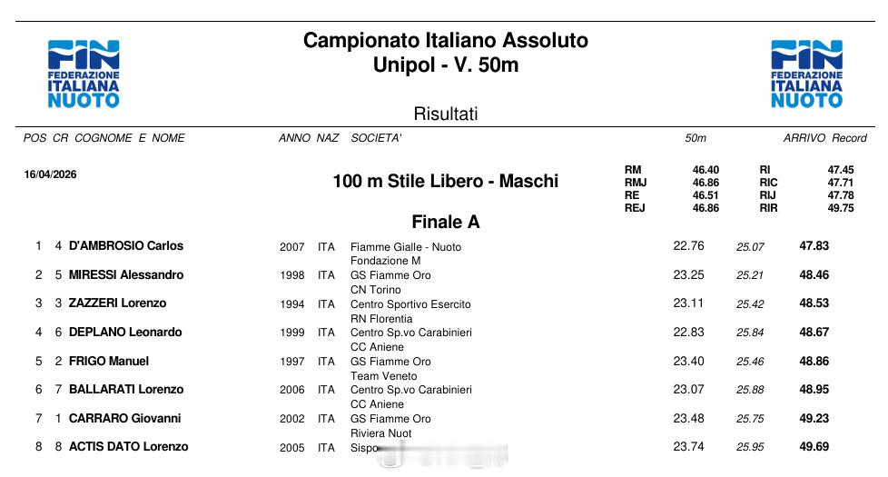 意大利游泳锦标赛 第三天决赛男100自:Carlos D’Ambrosio 47.83男800自:Luca De Tullio 7:47.60男200混:Jacopo Barbotti 1:57.75女100自:Sara Curtis 53.40女1500自:Simona Quadarella 15:55.89
