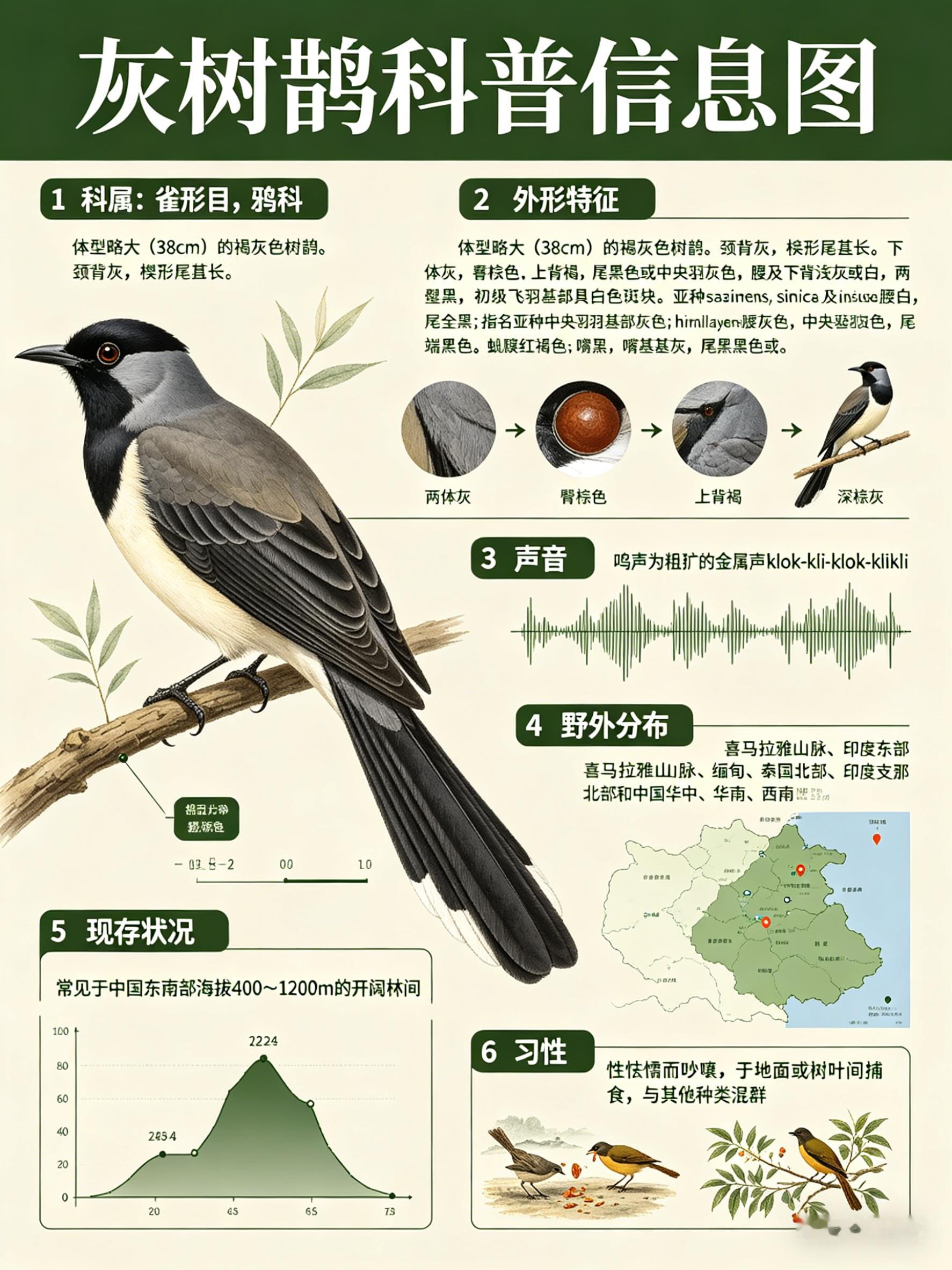 ·外形特征:体型略大(38cm)的褐灰色树鹊。颈背灰,楔形尾甚长。下体灰,臀棕色,上背褐,尾黑色或中央尾羽灰色,腰及下背浅灰或白,两翼黑,初级飞羽基部具白色斑块。亚种sapiens, sinica及insulae腰白,尾全黑;指名亚种中央尾羽基部灰色;himalayensis腰灰色,中央尾羽灰色,尾端黑色。虹膜红褐色;嘴黑,嘴基灰;脚及趾深灰色。