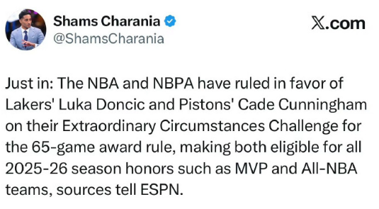 NBA联盟与球员工会已裁定东契奇和坎宁安就65场奖项评选规则提出的“特殊情况申诉”成立,两人因此均有资格竞争2025-26赛季所有荣誉,包括MVP和最佳阵容等。