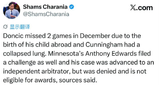 东契奇因12月在国外迎来孩子出生而缺席了两场比赛,坎宁安则因气胸缺席。爱德华兹也提出了申诉,其案件被提交给独立仲裁员,但遭到驳回,因此没有资格参与奖项评选。