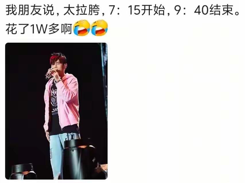 周杰伦这波演唱会,真的看不懂! 三小时的演唱会,他只唱了90分钟不到,剩余时间,要么就是互动聊天,要么就是嘉宾助阵以及点歌环节。 看上去诚意满满,互动满满,可对于花了大几千的粉丝来说,实在难以接受。 我花钱来是因为喜欢你,喜欢你的歌,结果你全程划水,高音上不去降调,要么就是直接将话筒递给观众。 并不是所有人都是伍佰,能够不开麦就能开演唱会的。 伍佰的演唱会,大合唱是观众自发的。 而周杰伦的划水,不是自发,而是自己设计的。 两者有很大差别。 这也是观众表示接受不了的的原因,而且近些年周杰伦的作品越来越敷衍。 此次演唱会上,老歌少就不说了,强推的新歌,歌词都记不清。 这就是明晃晃的敷衍。 也难怪粉丝都接受不了了。 说实话,与其这样敷衍,还不如把美好的记忆留在粉丝心中,别出来消费情怀了。 既然确定了要开演唱会,那就得尽心尽力,除非非人为导致的意外。 要不然就别把粉丝当韭菜。 现在的年轻人更加清醒了,你不能给我带来氛围,我管你是谁,都不惯着。
