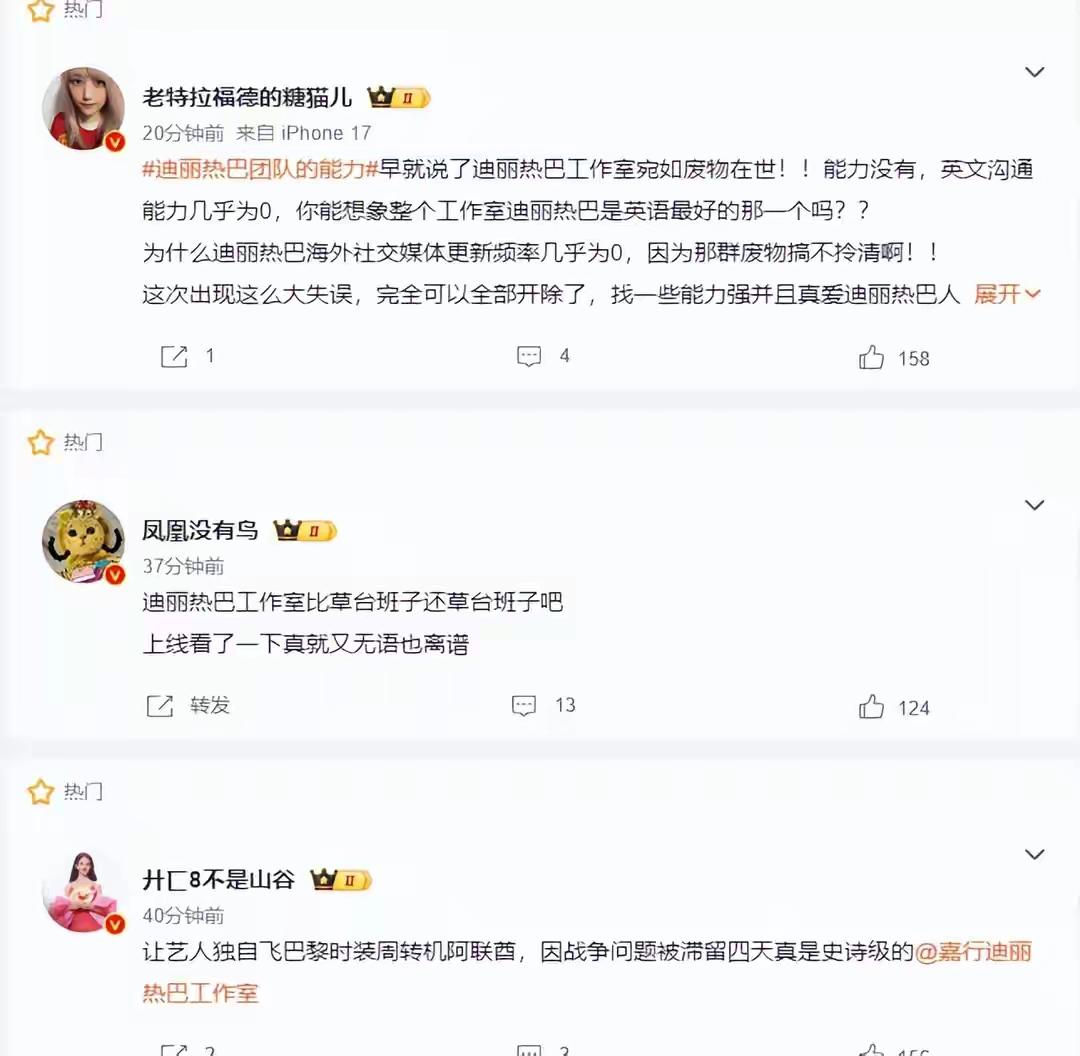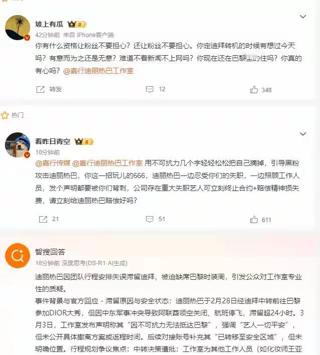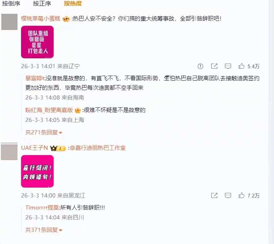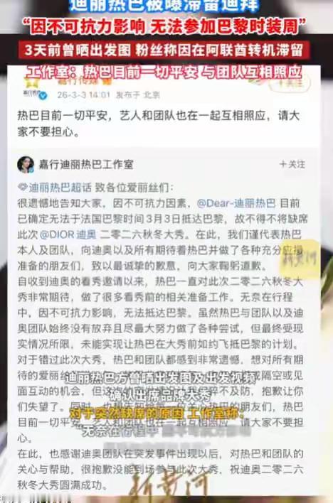 网友不是傻子! 迪丽热巴因冲突被困迪拜,粉丝叫屈,工作室甩锅,可明眼的网友却都不买账。 本来迪丽热巴被困迪拜,无法参加活动,不少人还觉得可惜,可深挖之后,网友看清了。 第一:粉丝叫屈 原因是,粉丝挖出很多证据,说之前都是直飞,而这一次居然去迪拜转机,觉得嘉行就是草台帮子,这么一件小事都办不好。 其次,粉丝挖出这已经不是嘉行第一次因为明星行程翻车了。 第三,工作人员都是直飞,而迪丽热巴却转机迪拜,然后被困。 然后全都拿着这一套言论,去攻击工作室和嘉行。 第二:工作室发文惹争议 工作室说不可抗力因素被困迪拜,可粉丝和网友也不是傻子。 27号各种消息已经来了,但凡上网看新闻的都知道,冲突即将发生。 然后你还去,这怎么看都不合理。 第三:网友不是傻子 粉丝叫屈:说工作室,嘉行不负责。 但别把别人当傻子,工作人员都能直飞,你觉得迪丽热巴就不能? 别搞笑了,就算是工作室,嘉行说要打压迪丽热巴,就算是内部封杀。 作为迪丽热巴这样的明星,还缺一张机票钱?非得去迪拜转机? 看看网上迪丽热巴的粉丝言论,全是指责工作室,嘉行的,却闭口不谈这些不合理。 那唯一的解释就是,迪丽热巴转机迪拜,不是工作室安排,也不是嘉行要求,而是她自己决定的。 她自己更改了直飞的决定,转而去了迪拜,然后再准备从迪拜转机去参加活动,没想到冲突发生,被困迪拜。 否则,无论是从什么角度,我都找不到迪丽热巴要转机迪拜的理由,只有她自己决定才合理。 所以,网上那些粉丝,就别再叫屈了,大家都不是傻子。 迪丽热巴被困迪拜,确实可惜,也希望她注意安全,早日回来。 可也别把这些善意当做你们拿去攻击别人,甩锅别人的筹码。