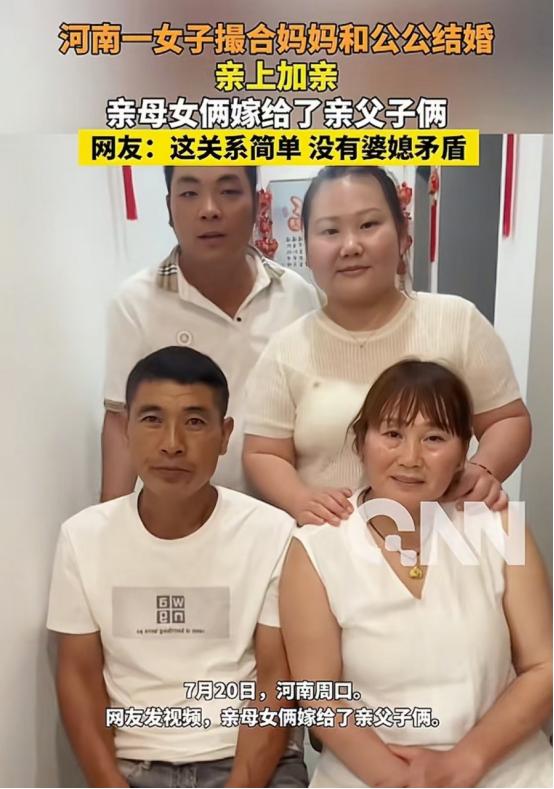 “彻底乱套了!”河南周口一女子结婚后,看公公天天闷在家里孤单寂寞,一咬牙,竟然将自己的亲妈许配给了公公。亲母女俩,直接嫁给了亲父子俩,四个人硬是拼成了一个新家庭! 河南周口,两个普通家庭最近彻底火出圈了。2018年,小慧主动撮合自己的公公和亲妈走到了一起。到了2025年7月,李娟也跟着学,带头促成了这种“四人拼团”的生活模式。 这两个家庭的想法,其实一模一样。家里的老人们,都是早年丧偶,辛辛苦苦把孩子拉扯大,完成养育任务后,就陷入了没人陪没人说话的精神空虚,日子过得孤单又冷清。而这种看似“离谱”的重组,直接打破了咱们印象里的常规家庭模式。 关键是,这场家庭重构,都是年轻人主动发起的。他们看透了老人们的孤独,没让老人各自孤单,反而把两个原本不相干的单向亲情关系,合并成了一个互相陪伴的闭环。 这样一来,既解决了老人们不愿离开自己家、抵触再婚的难题,也消除了老人独自在家、突发意外没人发现的隐患。以前年轻人在外打拼,只能远程尽孝、隔空牵挂,现在直接变成了近距离守护,一举两得。 而且通过空间整合,家里的资源也能充分利用,不会浪费,原本松散的家庭,一下子变得更稳固,更有凝聚力了。 最让外界意外的是,这种模式居然还彻底化解了最头疼的婆媳矛盾。咱们都知道,传统家庭里,婆媳关系大多剑拔弩张、矛盾不断,但现在不一样了。婆婆就是亲妈,女方再也没有了对“婆婆”这个身份的心理戒备,相处起来毫无隔阂。 反过来,岳父也变成了亲爹,男方跟长辈相处,也多了一份亲近感,再也不用小心翼翼。以前最容易闹矛盾的利益分配问题,现在也变成了一家人互相扶持、一起共建家庭,根本没有猜忌。 一家人劲往一处使,带娃做家务再也不用互相推诿,协作起来特别顺畅,家里的摩擦几乎降到了最低。 这种模式,重新搭建了家人之间的信任,靠着最实在的血缘牵绊,让原本陌生的两代人,变成了朝夕相处,互相照顾的伴侣。 这种身份的重叠,带来了意想不到的和睦,不得不说,这种实用主义的做法,真的太接地气、太懂普通人的难处了。 当然,也有很多人质疑,说这违背伦理。但咱们得回归法理,别凭感觉下判断。民法典里对婚姻禁区有明确规定,公公和亲家母之间,没有任何血缘关系,也不属于法律意义上的拟制血亲,他们俩结合,完全符合婚姻自由的原则。 民政局都给盖了章,办了合法手续,从法律层面来说,一点问题都没有,无懈可击。 还有人担心称谓会尴尬,其实他们处理得特别有智慧。他们没有强行改变原有的称谓,在孩子面前,爷爷还是爷爷,姥姥依然是姥姥,不打乱孩子的认知。关起门来,一家人各叫各的,怎么亲切怎么来。 这种做法,既照顾了传统的家庭秩序,又避免了外出社交时的尴尬,完美在规矩和现实之间,找到了一个平衡点。 其实这种现象,也折射出咱们现在家庭观念的变化。大家不再执着于表面的形式,反而更看重实实在在的幸福。现在老龄化越来越严重,养老的压力就摆在眼前,死要面子根本解决不了老人孤独、没人照顾的实际困难。 只要不触碰法律底线,不伤害到任何人,这种能让老人老有所依、老有所伴的生活方式,就值得被理解、被尊重。毕竟,幸福从来没有统一的模板,适合自己家的,就是最好的。 这不仅仅是河南周口的两个个案,更像是对当下养老痛点的一次正面回应。年轻人用最小的社会代价,换来了一家人的幸福感,解决了实际的难处。 当家里的苦难真的被解决了,外界的眼光、别人的议论,也就没那么重要了。这种带着实用主义色彩的家庭模式突围,也给了我们一个全新的视角,去思考什么是真正的家庭关系、什么是真正的幸福。 信源:新闻晨报