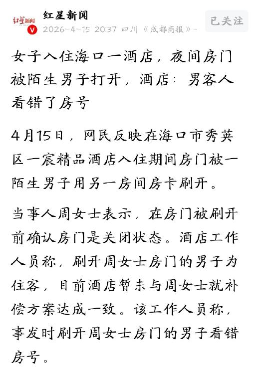 细思极恐!海南海口,女子独自入住某酒店,半夜睡得迷迷糊糊,忽然听见房门被刷开,往外一瞅,门口竟站着一位陌生男子,两人四目相对,女子当场吓懵,对此,前台轻飘飘的解释说,男子是顾客,看错了房间号,女子根本不信,就算看错了房号,为何他的卡能刷开自己的房门?到底是前台输错了,还是另有猫腻。 深夜十点多,海口秀英区一宸精品酒店某个房间里,独自出行的周女士已经陷入了浅眠,奔波了一天的人,这时候最需要的就是一张安稳的床,可命运偏偏要在最没防备的时刻开个玩笑。 那声“嘀”响起来的时候,她还以为自己在做梦,门锁解锁的声音在安静的夜里格外刺耳,紧接着是门把手被转动的声音。 周女士猛地从床上坐起来,迷迷糊糊往门口一看——门缝里挤进来一个陌生男人的身影,两个人就这么隔着半开的门对上了眼,空气在那一瞬间凝固了,谁也没说话。 周女士后来回忆起来,整个人后背都是凉的,她明明在睡前确认过门是锁好的,里里外外都检查过,这根深蒂固的安全习惯,出门在外的女孩子谁没有?可就是这样,那道本该坚不可摧的门,还是被人从外面给弄开了。 之后店长拿着那个陌生男子手里的房卡,当着周女士和酒店工作人员的面,当场刷了一次,咔嚓一声,门又开了,事实证明,那张卡确实能打开这间房。 这事儿就不太对劲了,如果按照酒店一开始的说法,那个男子只是住客看错了房间号,那问题来了——就算他走错了楼层、数错了门牌,他的房卡凭什么能刷开别人的门?这又不是万能钥匙,也不是酒店用来打扫卫生的总卡,理论上每张房卡只能打开对应的那一间。 可他偏偏就能打开一个陌生人的房间,这事儿搁谁身上都得犯嘀咕。 所以这是前台办入住的时候输错了房间号,把两间房的房卡信息搞混了?还是那个男子拿的根本不是他本该住的那间房的卡?或者是酒店房卡管理系统本身就有问题,两张卡能互相打开? 每一种可能性,对住客来说都不是好消息,一个人在外面住酒店,连门锁这道最基本的防线都靠不住,那还谈什么安全和隐私。 更让人哭笑不得的是酒店方面的态度,工作人员倒是没否认事实,承认那个男子确实是住客,也承认他拿的是别的房间的房卡。 但解释就一句——他看错房号了,没了,轻飘飘得像是把一件细思极恐的事当成了鸡毛蒜皮的小插曲,至于后续怎么处理、怎么赔偿,酒店和周女士也没谈拢,补偿方案悬在半空没个结果。 一个独住的女子,在深更半夜被陌生人用正当途径打开房门,酒店却拿不出一个让人信服的说法,这种心理阴影怕是要跟着她很长一段时间。 现在回过头看,很多人住酒店都会在门后面挂一把衣架、抵一把椅子,以前总觉得是过度谨慎,可这事儿一出,大家才发现那些看起来有点神经质的习惯,其实是有道理的,因为你永远不知道,那张小小的房卡到底开的是哪扇门。 这起发生在海口的事件给所有经常出门住酒店的人提了个醒,房卡系统出错、前台操作失误、甚至是管理上的漏洞,任何一种情况都可能让本该安全的空间变得不可预测。 希望能查清楚那个最关键的问题——那张卡到底为什么能刷开两间房,在此之前,每个住酒店的人恐怕都得多个心眼,那道门到底有多牢固,谁也不敢打包票了。 好在这个深夜的意外没有发展成更可怕的事故,但这四个字已经在每个人心里刻下了深深的印记——细思极恐。