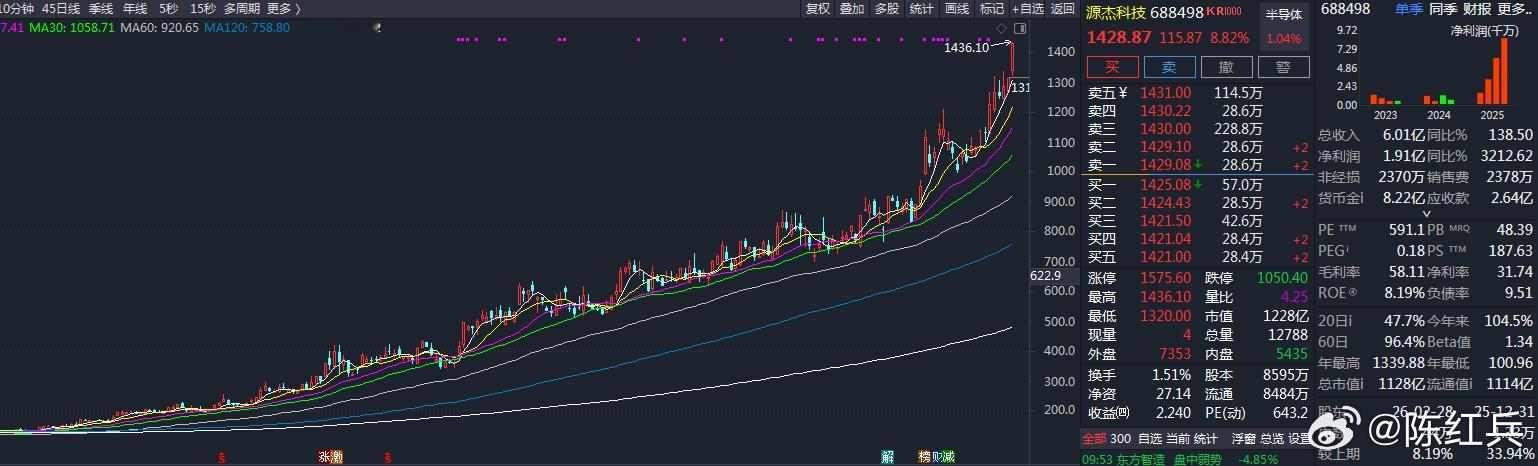 源杰科技持续走强,股价突破1420元,盘中超越茅台股价,成为A股新“股王”。