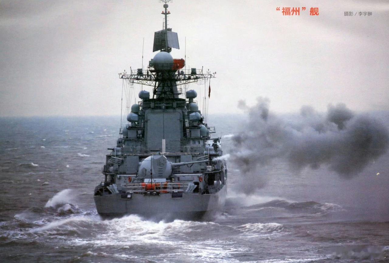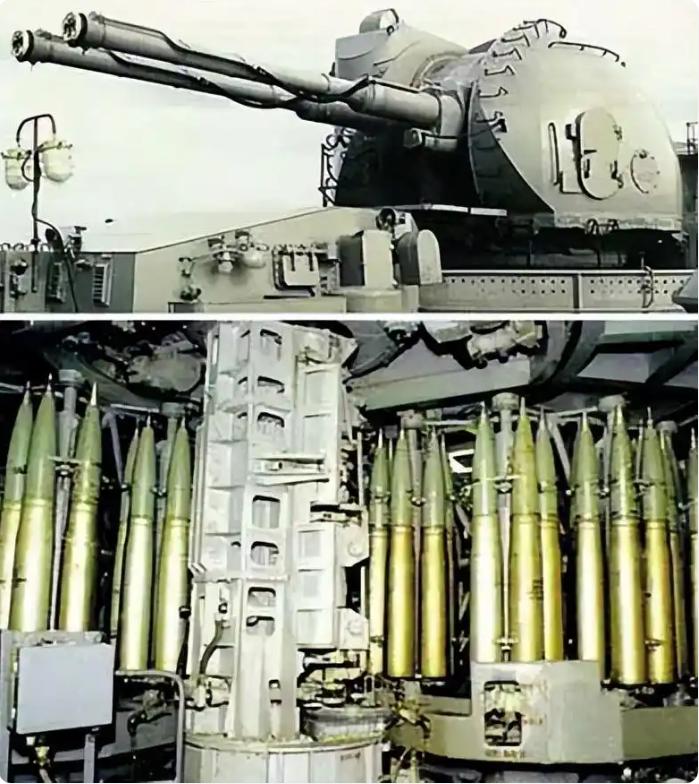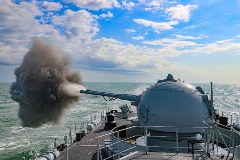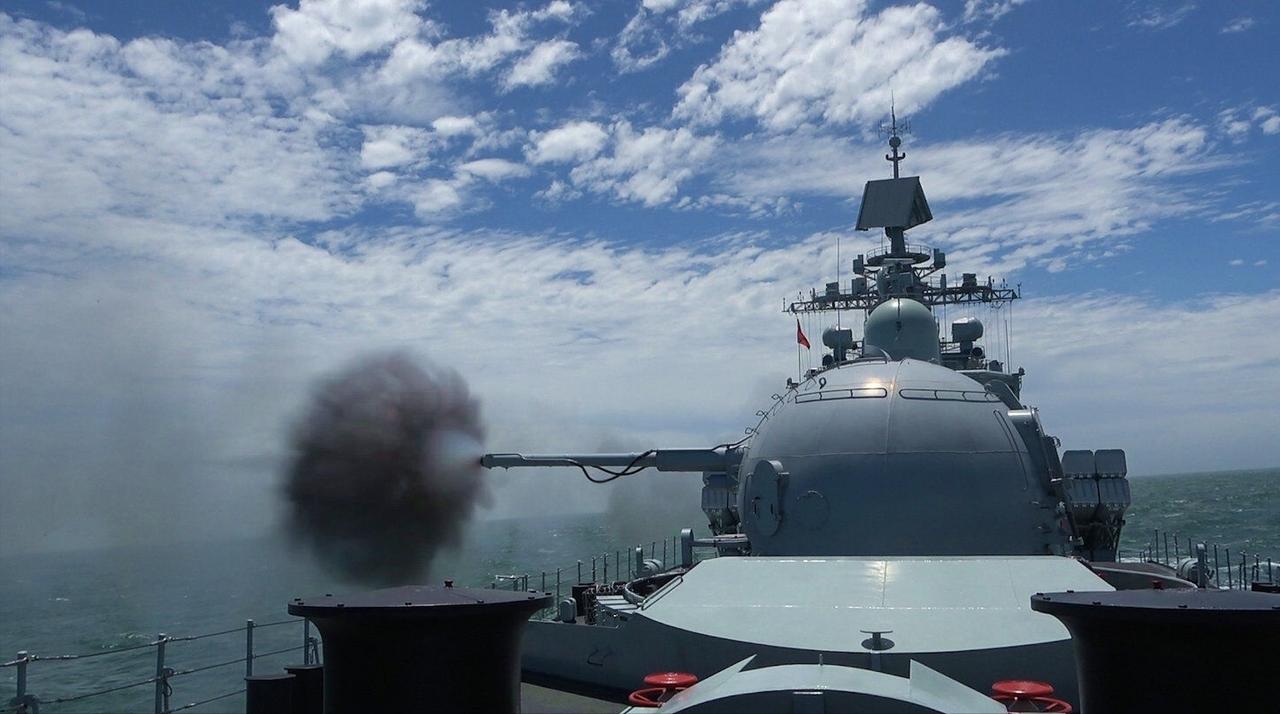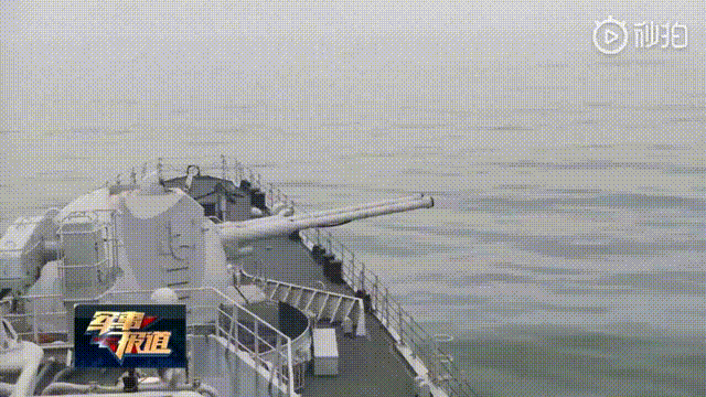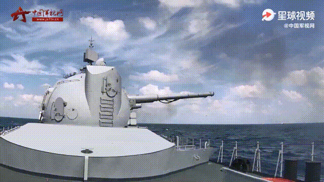 现役军舰最强舰炮火力,两座AK-130型130毫米双联装舰炮同时开火。AK-130理论最高射速90发/分,实际持续射速约70发/分,爆发射速约80发/分钟,最大射程约29.5公里(使用常规高爆弹)。
