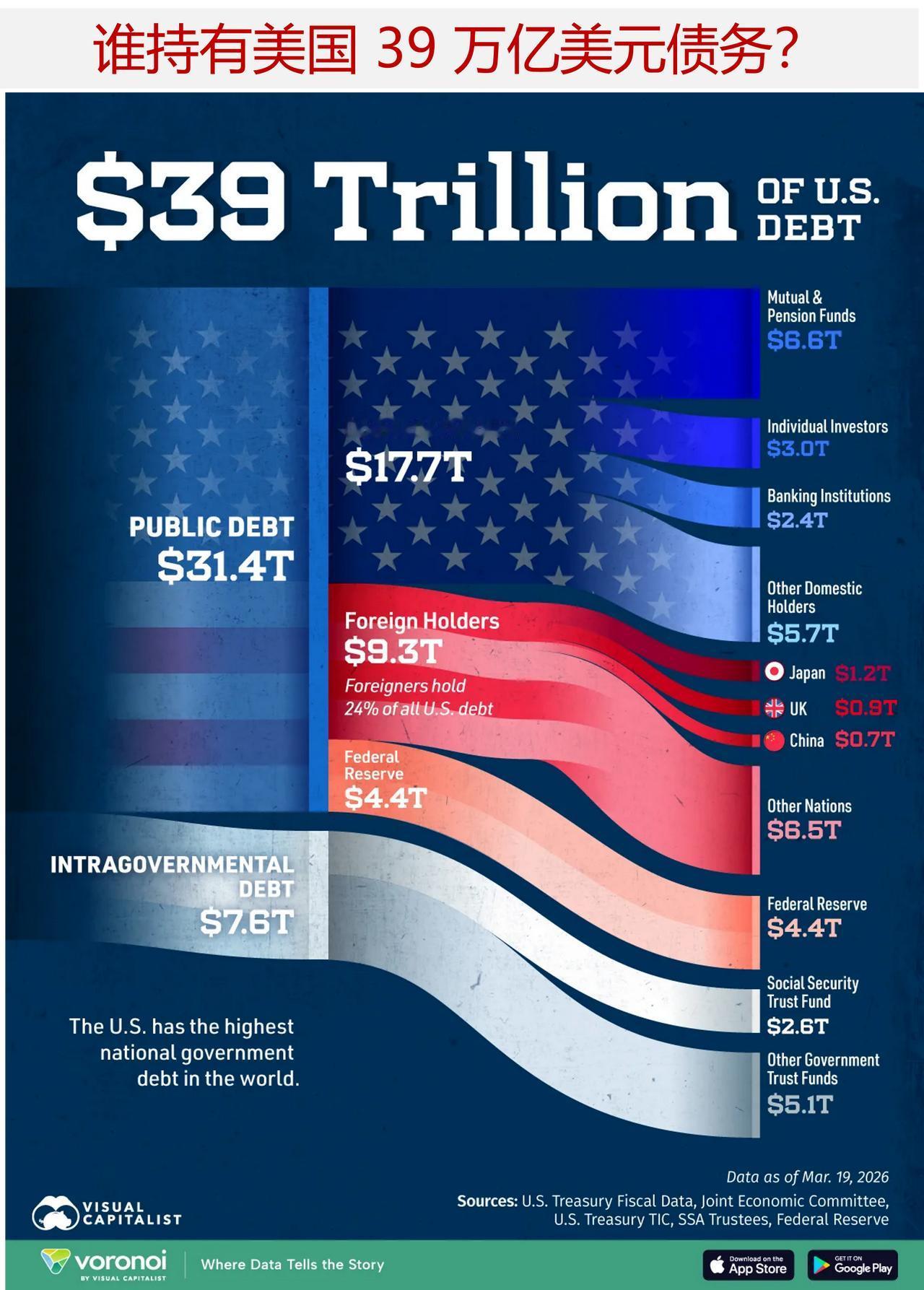 究竟是谁为美国39万亿美元的债务提供资金?其中国内持有与海外持有分别占比多少? 下面图表展示了美国债务的最终持有方分布,涵盖国内投资者、外国政府、美联储以及内部信托基金。 数据来源于美国财政部每日债务明细报告、美国联合经济委员会、国际资本流动数据(TIC)及美联储,截至2026年3月19日。 ——美国债务持有方拆解 为填补日益扩大的赤字,美国依赖广泛的买家群体,包括国内机构、外国政府及其本国中央银行(美联储)。 在39万亿美元的总债务中,31.4万亿美元(占比81%)由国内外投资者持有。 剩余7.6万亿美元(占比19%)为政府内部债务,反映政府内部的资金往来。这一规模约为全球前20位亿万富翁财富总和的两倍。 公共持有债务指美国欠外部投资者的债务,直接影响利率、借贷成本及金融市场。相比之下,政府内部债务是政府欠自身的资金,主要源于社会保障等项目。 共同基金和养老基金是最大的公共持有方,持有规模达6.6万亿美元,体现出市场对安全、流动性资产的强劲需求。美联储资产负债表上持有4.4万亿美元债务,超过日本、英国和中国这三大海外债权国的持有量总和。 个人层面,沃伦·巴菲特通过其旗下公司伯克希尔·哈撒韦,成为美国短期国库券最大的非政府持有方,截至2025年第四季度,持有规模达3390亿美元。 ——美国高债务对普通美国人意味着什么? 按债务与国内生产总值(GDP)的比值计算,美国是全球负债最高的10个国家之一,且债务每三个月约增加1万亿美元。这一趋势会影响美国人的生活水平。 随着债务增加,联邦预算中更大比例的资金将用于支付利息,挤占基础设施、国防和社会项目等重点领域的支出。 过度债务会抑制工资增长和就业创造,同时推高利率,导致抵押贷款、贷款和信用卡债务的成本上升。 随着国债持续攀升,其构成和持有情况对于理解金融市场及整体经济面临的风险至关重要。