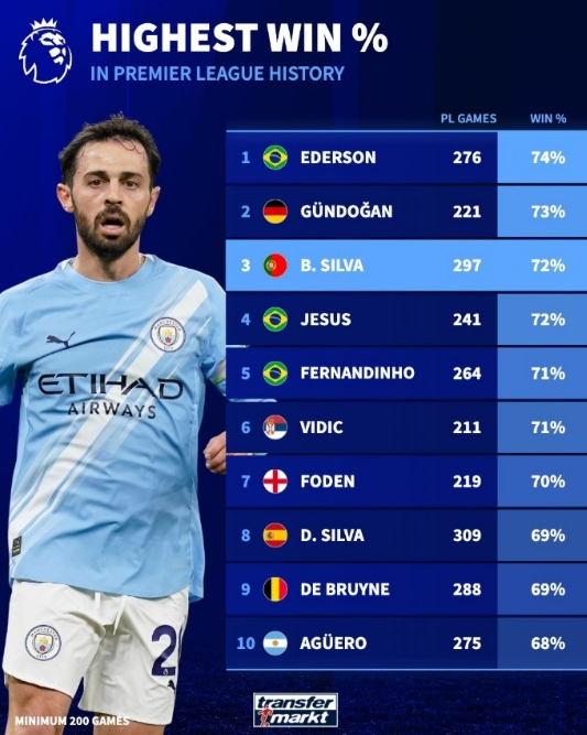 4月16日晚,曼城官宣队长B席将在赛季结束后离队。德转盘点了英超历史球员胜率榜(至少出场200场),曼城门将埃德森以276场74%的胜率高居榜首,京多安221场73%排名第二。即将离队的B席以297场72%的胜率位居第三,与热苏斯并列。费尔南迪尼奥、维迪奇、福登、大卫·席尔瓦、德布劳内和阿圭罗分列第四至第十位,前十名中多达9位曼城球员。