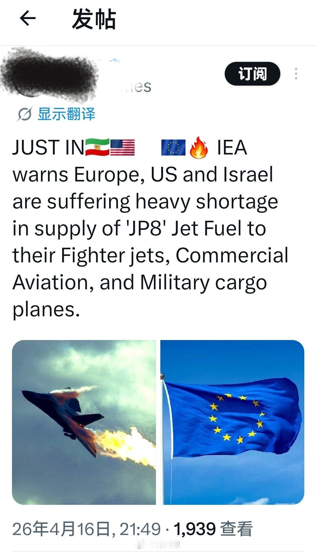 国际能源署警告:欧洲、美国和以色列在“JP8”喷气燃料供应上严重短缺,影响其战斗机、商用航空和军用运输机。