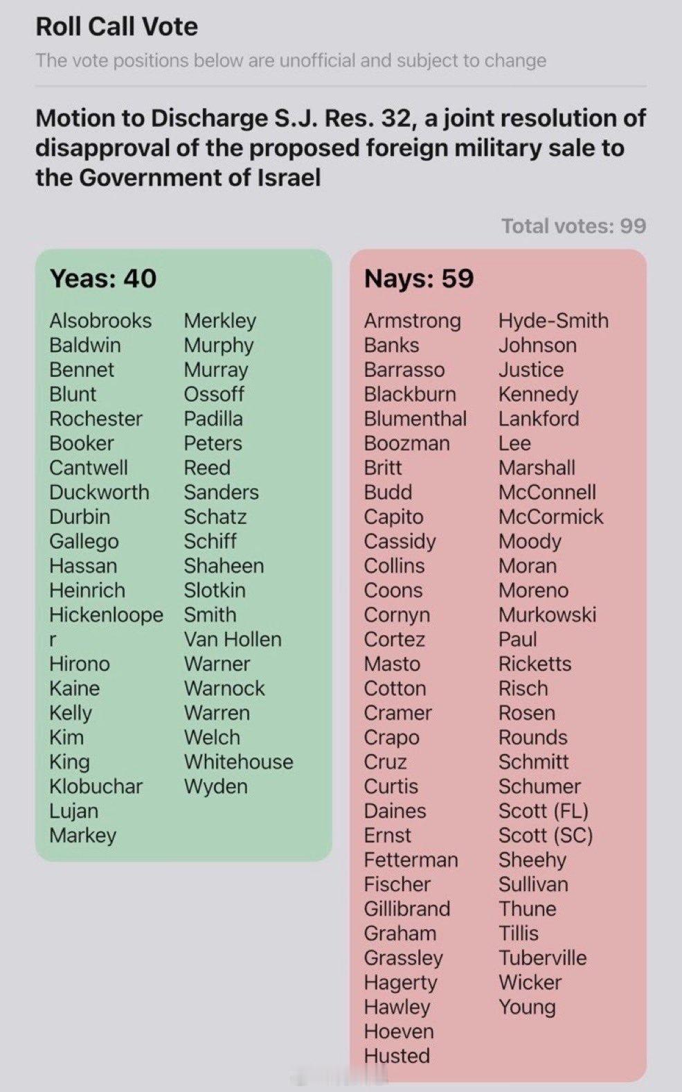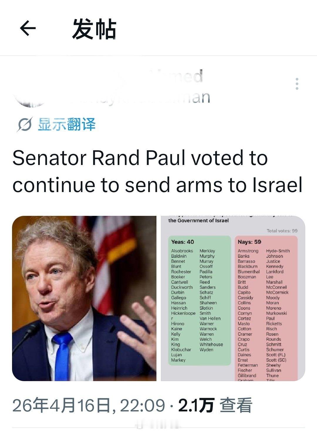 兰德.保罗参议员投票支持继续向以色列发送武器。