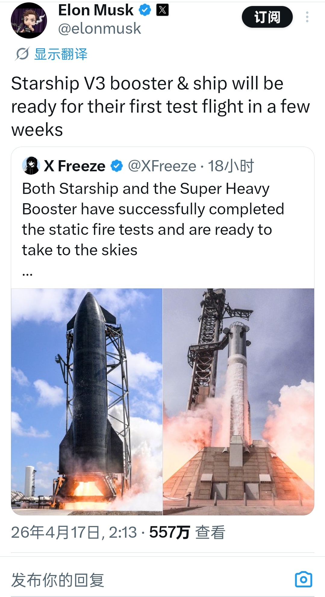 马斯克的再再再一次公布,星舰v3将在几周内准备进行首次试飞。