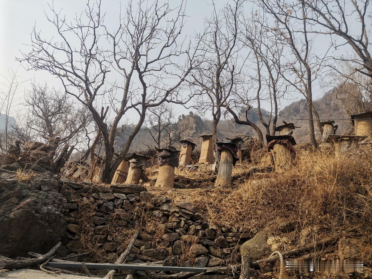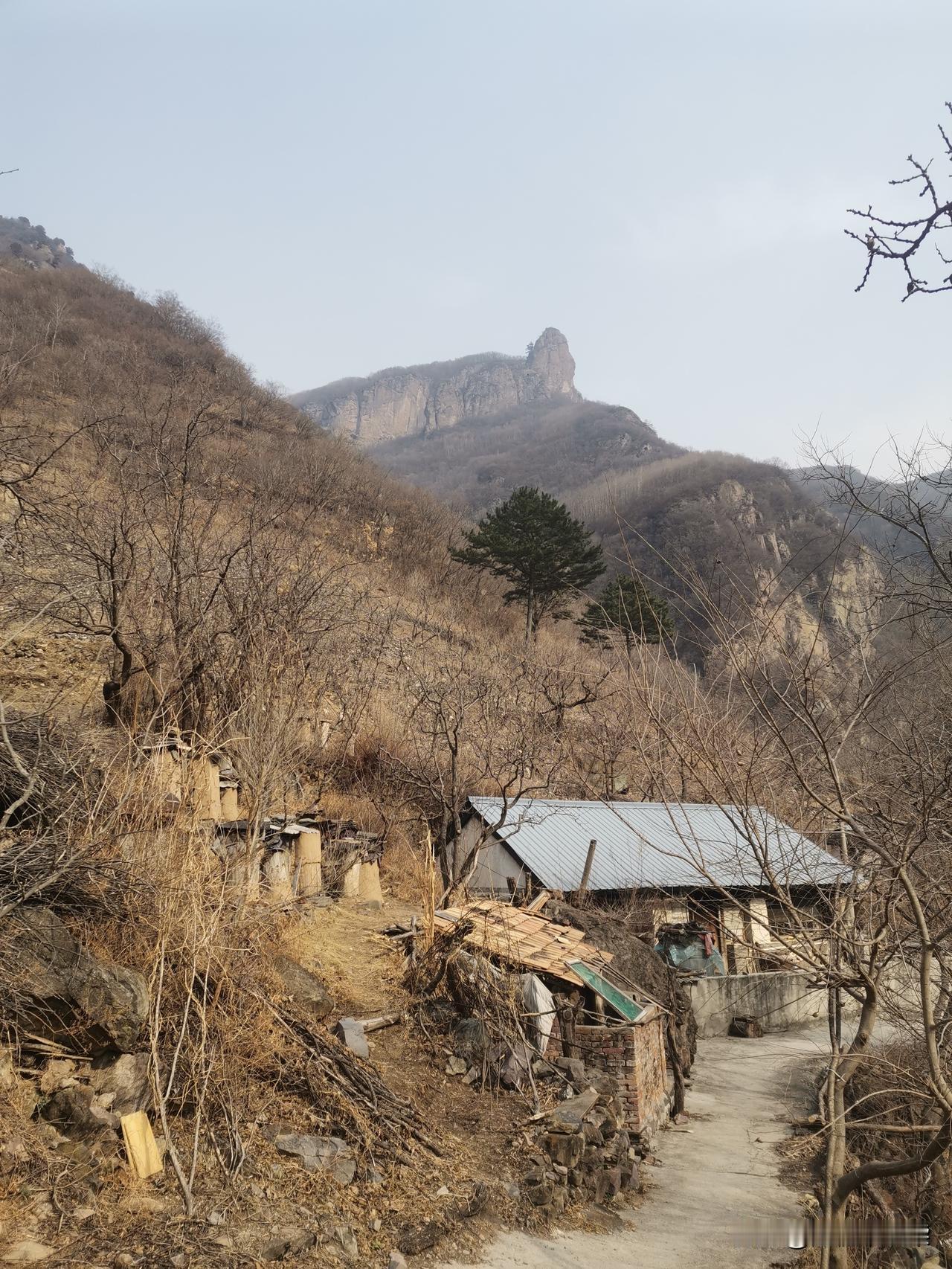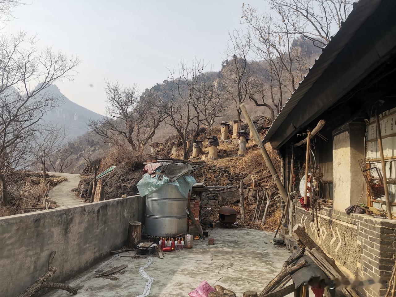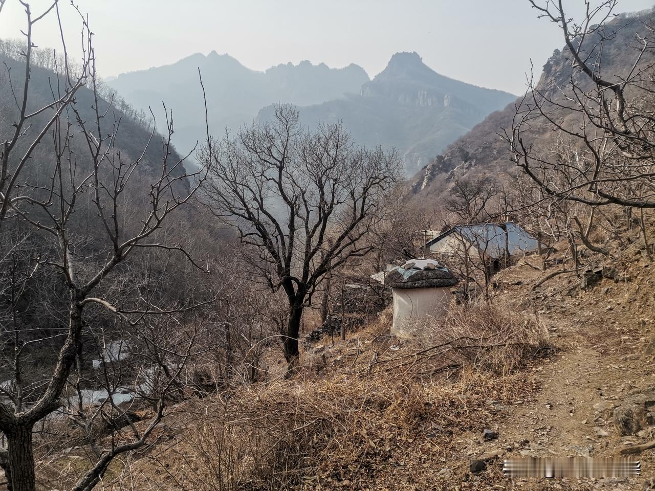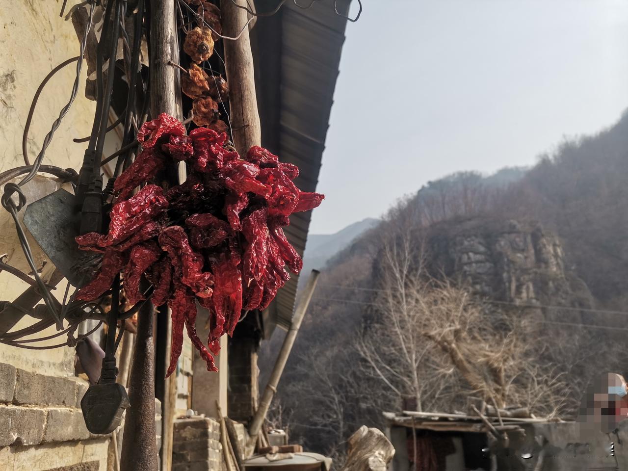 承德兴隆五指山下连战沟独居的人家。 再次来到兴隆解放村,午饭后农家院老板带我们去看一处瀑布,指给我们前往的路口后,我们几人自行前往,一路有冰冻的小溪相伴,偶尔冰下还会有哗哗的水声。沿着曲折的水泥路爬升半个小时后,来到一处近百米的悬崖下面,近似垂直的青灰色崖壁,有许多长条的黑色痕迹自上而下,断续的延伸到谷底,这应该是流水的痕迹,也是瀑布的所在,只是初春时节,少雨干旱,没见瀑布的影子,是个遗憾。 但是来回的路上,都要经过一户独居的人家,让我们很是惊讶。三间矮房应该是建于上世纪八十年代,现在屋顶覆了灰色的彩钢,房前两米宽的凉台外面是一米宽的小路,挨着山墙有一个小猪舍。这里是水泥路的尽头,下面是十几米深的溪谷,谷底的冰倔犟的拒绝着春天。主人不在,门上落锁,窗台上摆满了各式各样的小农具,一簇火红的辣椒挂在屋檐下,映衬着远处褐色的山峦。一条小路、两个粮囤、三只猪仔、四面环山;山坡上几十个树桩做的土蜂箱、远近上下栽种的果树和一小块一小块的梯田……眼前是烟火,环顾是群山,结庐在仙境,远离车马喧。我们一行人都羡慕起小屋的主人来了。