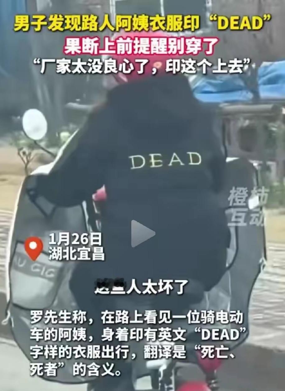 男子看见一个老人身上穿的衣服印的字,赶紧让他脱下来,对他说以后你不要再穿了,原来老人的身上印了一个字母,上面写着DEAD,意思就是死亡,去世的意思。老人是不知道这个字母的意思是什么,如果他知道的话,绝对不会穿这件衣服的。这衣服应该不是我们这里生产的,也可能是不知道从哪弄过来的旧衣服?这种衣服就不该拿到市场上来卖。