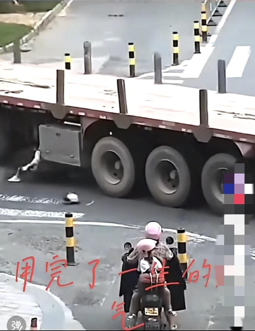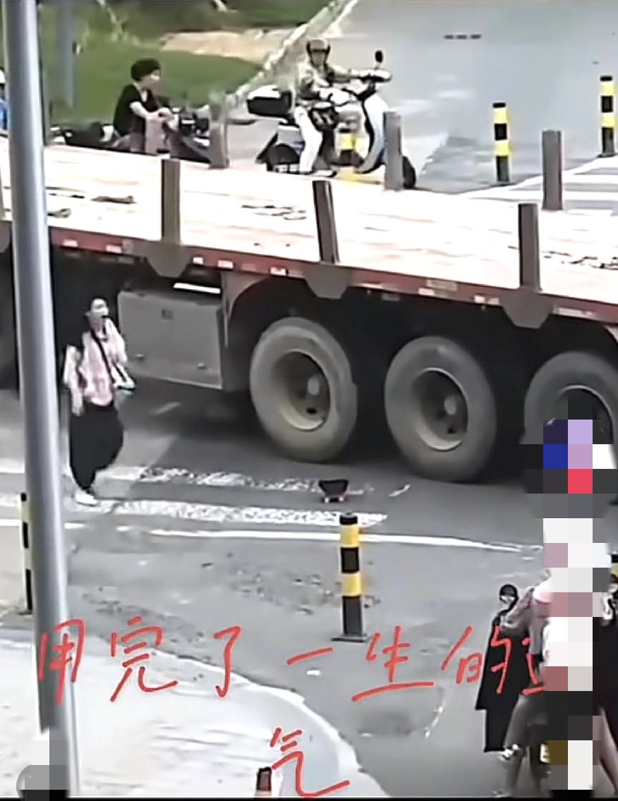 到十字路口,在大货车的盲区就非常危险,这位女士差一丁点,就被货车压到了,最后货车突然停下了,避免了一起重大事故,电瓶车下回一定要让大货车先走,如果下回压过去就废了。