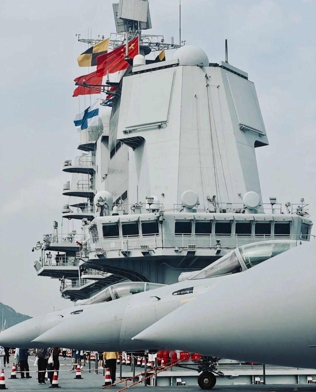 近距离观看“山东舰”的舰岛,舰岛作为航母的“大脑中枢”,是航母所有指挥、探测、通信、管制等功能的集成核心,山东舰的舰岛相比辽宁舰做了全面优化,整体长度缩短了约10米、高度略微提升,腾出了更多的甲板停放空间,提升了运作效率。 画面中舰岛主体上两块巨大的方形平面阵面,就是山东舰的“千里眼”——346B型大型有源相控阵雷达,也是中国海军现役最先进的舰载主战雷达,采用4面阵全向布局,另外2面在舰岛的前面。 相比辽宁舰的初代346型雷达,346B升级了全固态收发组件,探测距离更远、多目标处理能力翻倍、抗干扰与反隐身能力大幅提升,能在几百公里外同时跟踪数百个空中和海面目标,包括隐身战机、掠海飞行的反舰导弹等,为航母编队提供远程预警、目标识别、火力引导的全流程支撑。 这种平板式的液冷散热设计,持续开机工作能力、环境适应性更强,同时阵面布局更高,减少了舰体遮挡,探测盲区更小。优于辽宁舰雷达阵面的弧形风罩。 上面白色的球形整流罩是卫星通信与数据链系统。舰岛雷达阵面周围、顶部的多个白色球形设备,学名为天线罩(雷达罩),内部包裹的是航母的各类核心通信、导航天线,是航母的“顺风耳”。 里面包含卫星通信天线、全军战术数据链天线、北斗导航定位天线、超视距通信天线等,球形罩体本身采用透波复合材料,既能保护精密天线不受海上高盐、高湿、大风、舰载机起降冲击波的损害,又完全不影响电磁波的收发效率。 再往上面的舰岛顶部是警戒雷达与电子战系统,各类天线设备,是航母的远程警戒与电子攻防的核心。 最显眼的倾斜大板是两坐远程标对空警戒雷达,作为相控阵雷达的补充。 相控阵雷达性能虽然强劲,但长时间全功率开机功耗极大、容易暴露航母位置,这款警戒雷达可实现24小时不间断开机,执行日常对空、对海广域警戒,发现可疑目标后再唤醒相控阵雷达进行精准跟踪,兼顾预警能力与战场隐蔽性。 周边配套了大量电子对抗天线、侦察天线、短波/超短波通信天线、气象雷达等,负责截获敌方雷达、通信信号,同时对敌方探测设备实施主动干扰,保障航母日常航行的气象、导航需求。 其他的就是桅杆与信号旗了。桅杆悬挂了五星红旗,以及国际海事通用的信号旗组,画面中可见的黄黑格旗、蓝白十字旗,就是国际通用的海事信号旗。