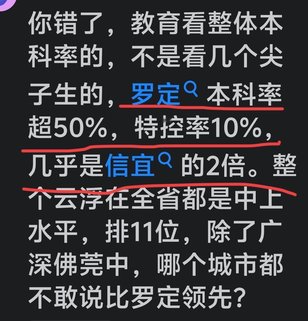 吹牛了,罗定特控率是信宜的2️⃣倍! 2️⃣0️⃣2️⃣2️⃣年至2️⃣0️⃣2️⃣4️⃣年,信宜教育与罗定教育整体对比(特控率/本科率) 1. 特控上线率(原重本率) -2022年 -信宜:约 16% -罗定:约 9.5% - 2023年 - 信宜:约 17% - 罗定:约 10% - 2024年 - 信宜:约 18%~19% - 罗定:约 10.4% 趋势:信宜持续领先,差距稳定在7~8个百分点 2. 本科上线率 - 2022年 - 信宜:约 53% - 罗定:约 49% - 2023年 - 信宜:约 55% - 罗定:约 50% - 2024年 - 信宜:约 56%~58% - 罗定:约 52.3% 趋势:信宜逐年小幅提升,罗定稳步上涨,但仍落后约4~6个点 二、头部中学最强对比(信宜中学 VS 罗定中学) 1. 特控率 - 2022年 - 信宜中学:≈42% - 罗定中学:≈46% - 2023年 - 信宜中学:≈44% - 罗定中学:≈48% - 2024年 - 信宜中学:45.8% - 罗定中学:50% 结论:罗定中学连续三年略强,差距在3~5个点 2. 本科率 - 2022年 - 信宜中学:≈84% - 罗定中学:≈93% - 2023年 - 信宜中学:≈86% - 罗定中学:≈95% - 2024年 - 信宜中学:88.2% - 罗定中学:≈97% 结论:罗定中学本科率一直明显更高 3. 高分段(600+) - 2024年 - 罗定中学:110+人 - 信宜中学:90人左右 尖子生:罗定中学更强 三、第二梯队对比(决定全市整体水平) 信宜(一中、二中、华侨、砺儒等) - 本科率普遍:45%~55% - 特控率:10%~15% - 整体非常均衡,没有明显弱校 罗定(廷锴、实验、城东、培献等) - 本科率多在:25%~45% - 特控率大多:2%~8% - 除罗定中学外,整体偏弱 结论:第二梯队信宜完胜 → 全市整体更强 四、最终一句话总结 1. 单看最好的高中:罗定中学更强 特控率、本科率、高分段连续三年小幅领先。 2. 看整个地区教育水平:信宜更强 特控率、本科率常年领先,学校整体更均衡。 3. 罗定是“一校独大”,信宜是“全面开花”