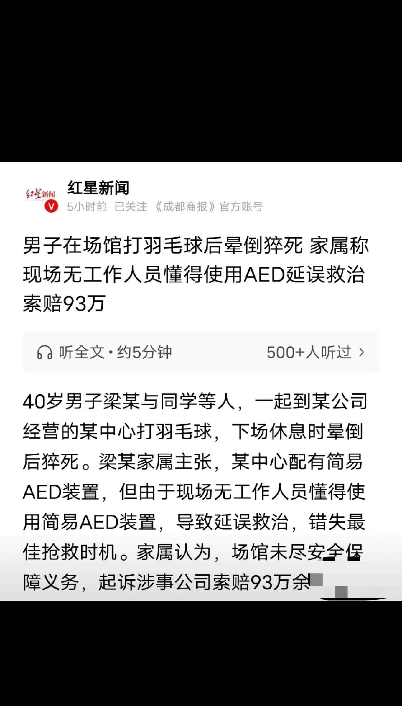 广东中山,男子去场馆打羽毛球,下场休息时,突然神志不清,呕吐,送医后诊断为心源性猝死,家属认为场馆人员不会用AED延误了男子救治,将场馆告上法院,索赔93万,法院判决亮了。 前不久,广东中山的梁先生,趁着假期跟同学约着去羽毛球馆打球。本来是开开心心的健身局,运动出了一身汗后,他下场坐下来休息,想缓一缓再接着打,没想到意外突然降临。 刚坐下没一会儿,梁先生突然脸色发白,紧接着就失去意识倒在地上,还不停呕吐,身边同学怎么喊都没一点反应,场面瞬间慌作一团! 懂急救的都知道,心源性猝死黄金抢救时间就几分钟,每一秒都不能耽误。 球馆工作人员第一时间发现险情,丝毫没耽搁,立马跑去拿场馆里配备的AED急救设备,同时全场广播找懂急救的人,梁先生的同学也立刻上前做心肺复苏,所有人都在拼命抢时间。 很快120急救人员赶到现场,全力抢救,可还是没能留住梁先生,最终确诊为心源性猝死。 好好的人说没就没,家属的悲痛大家都能理解,可接下来的操作,却让网友吵翻了! 家属直接把球馆告上法庭,张口索赔93万,理由就是:场馆虽然装了AED,但工作人员不会用,这么关键的急救设备没派上用场,就是场馆耽误了抢救,没尽到安全责任! 这事一曝光,评论区直接炸锅,网友们的观点一边倒,句句扎心👇 ❶“终于懂为啥很多商场、球场不愿配AED了!不配的话,及时打120就没多大责任;配了就算及时施救,只要人没了,家属就咬着你索赔,换谁是老板都不敢担这个风险啊!” ❷“运动本身就有风险,心源性猝死来得又急又凶,就算专业医生在现场,都不敢保证百分百救活,凭啥让场馆背全锅?” ❸“可怜归可怜,但不能无理追责啊!要是这么判,以后谁还敢配急救设备?谁还敢主动帮忙救人?社会善意都要被消耗光了!” 看完整个事件,我真的深有感触💬 很多人都误解了公共场所的安全保障义务,觉得出了事商家就必须赔钱,这完全是错误的! 按照《民法典》1198条规定,场馆只需要尽到合理的救助义务,并不是要承担“百分百救人”的无限责任。 法院经过调查,调监控、查笔录,把事实查得明明白白: 场馆工作人员发现险情后,全程积极处置,拿AED、呼救、等急救,没有一丝拖延,从梁先生晕倒到120赶到,仅仅用了13分钟,该做的救助全都做了。 家属从头到尾,拿不出任何证据证明工作人员不会用AED,更没法证明梁先生的死是场馆延误造成的。 最终法院直接判决:驳回家属所有诉求,场馆无需赔偿一分钱! 这个判决真的太解气,也太公道了!✅ 既守住了法律底线,也给所有公共场所经营者吃了定心丸,不用再怕“好心担责”; 同时也提醒所有爱运动的人,健身一定要量力而行,身体不舒服千万别硬扛,自己的身体自己才是第一责任人! 大家觉得法院这个判得对吗?评论区聊聊👇 如果人能一辈子不生病你愿意吗