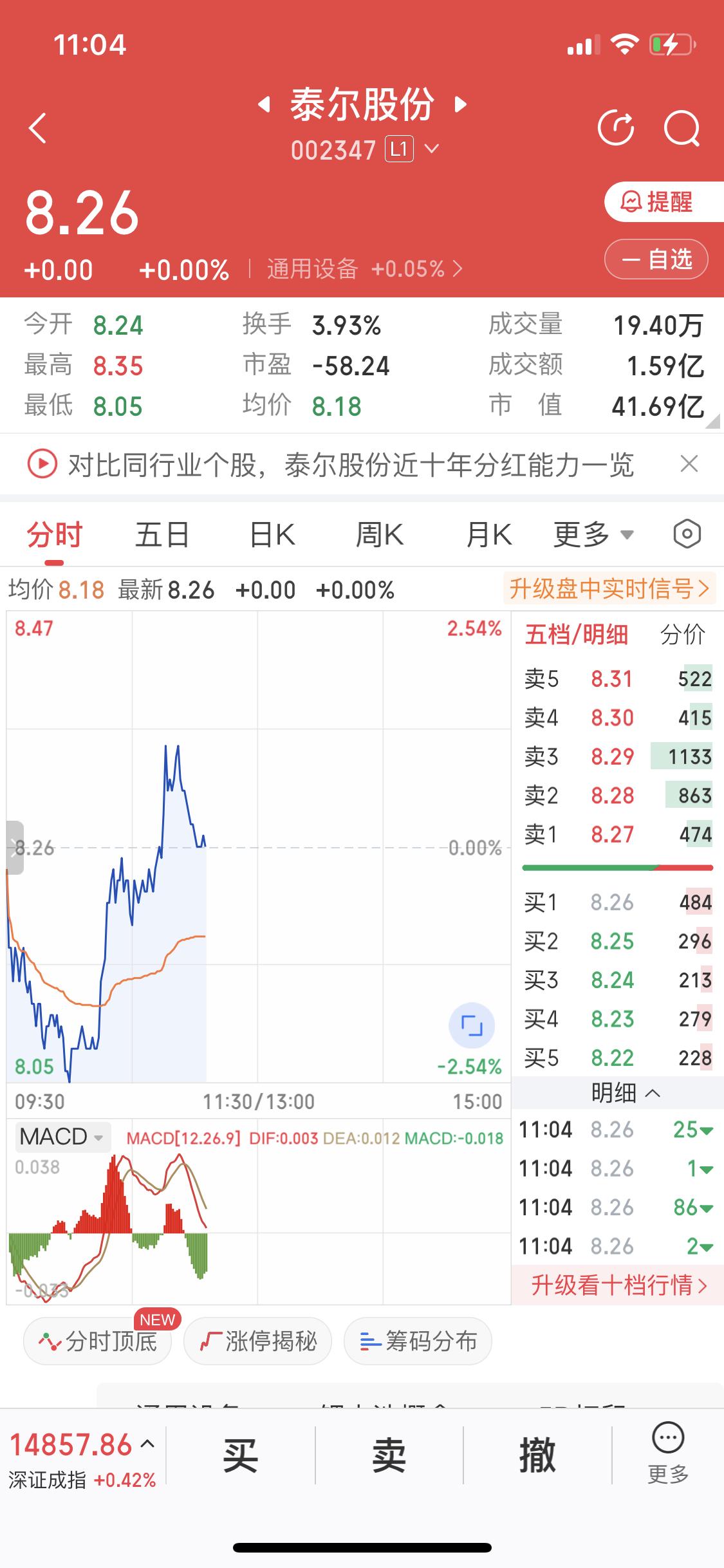 泰尔股份早盘下跌2个点 在车上的朋友你们走了吗 我是没有走 现在又从水下2个点拉升到水面 水面有资金承接 如果今天泰尔股份 成交量能放大 那就更好了