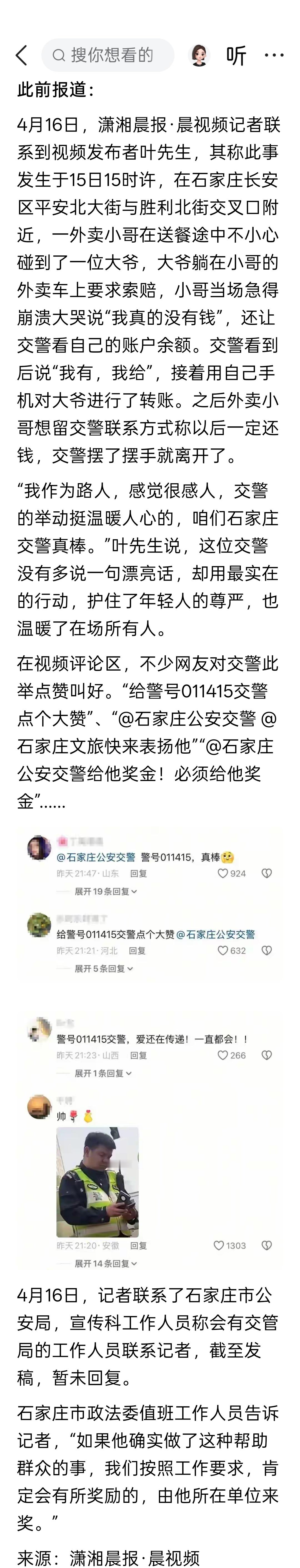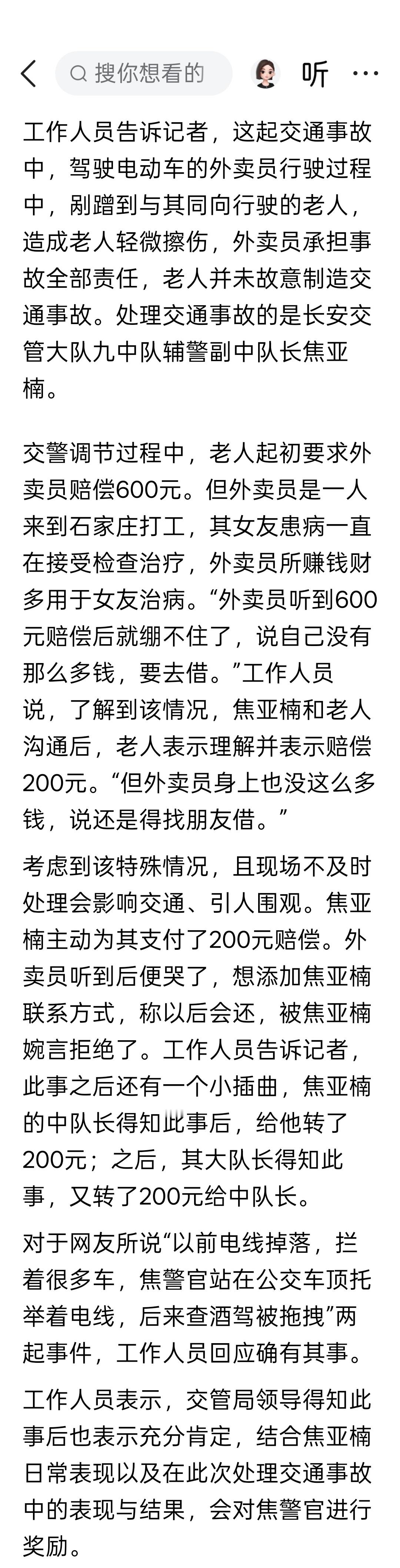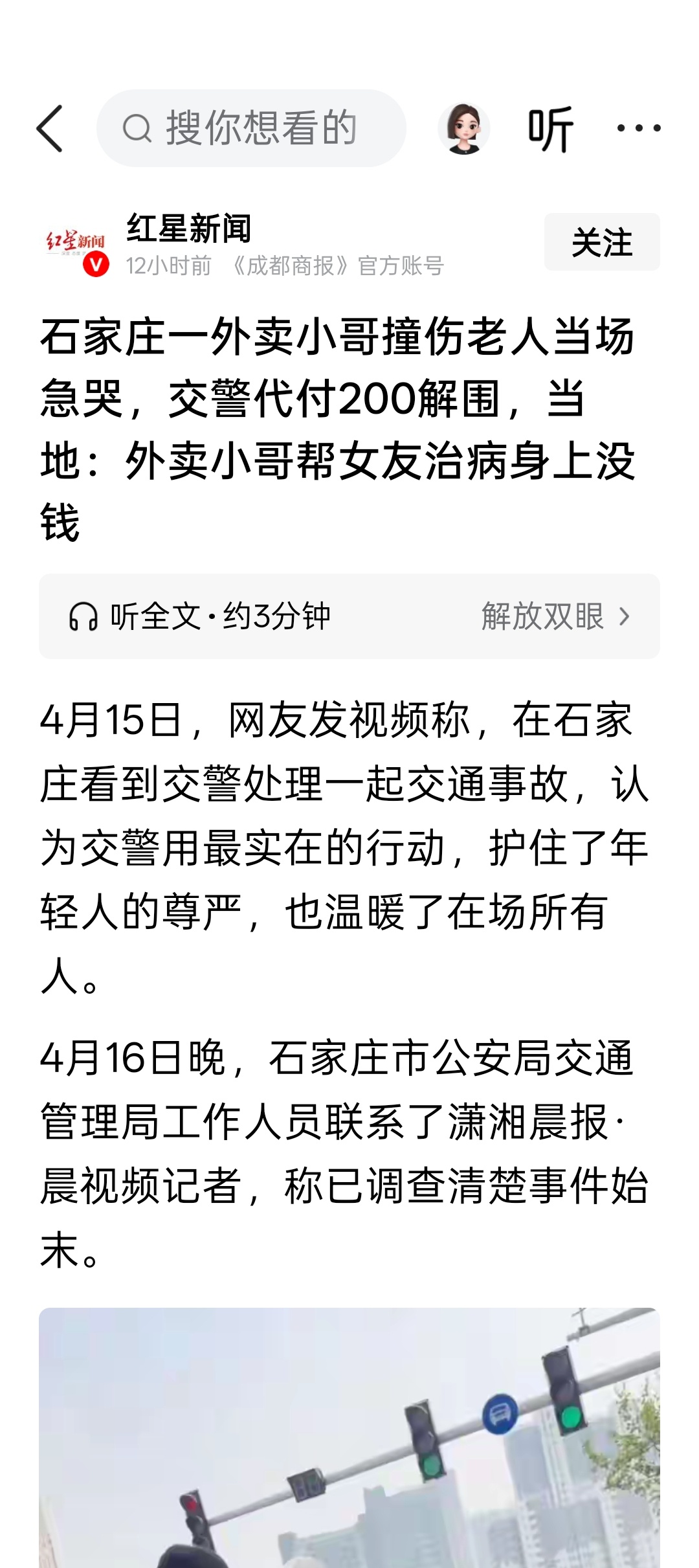 石家庄一外卖小哥撞伤老人当场急哭,交警代付200解围,当地:外卖小哥帮女友治病身