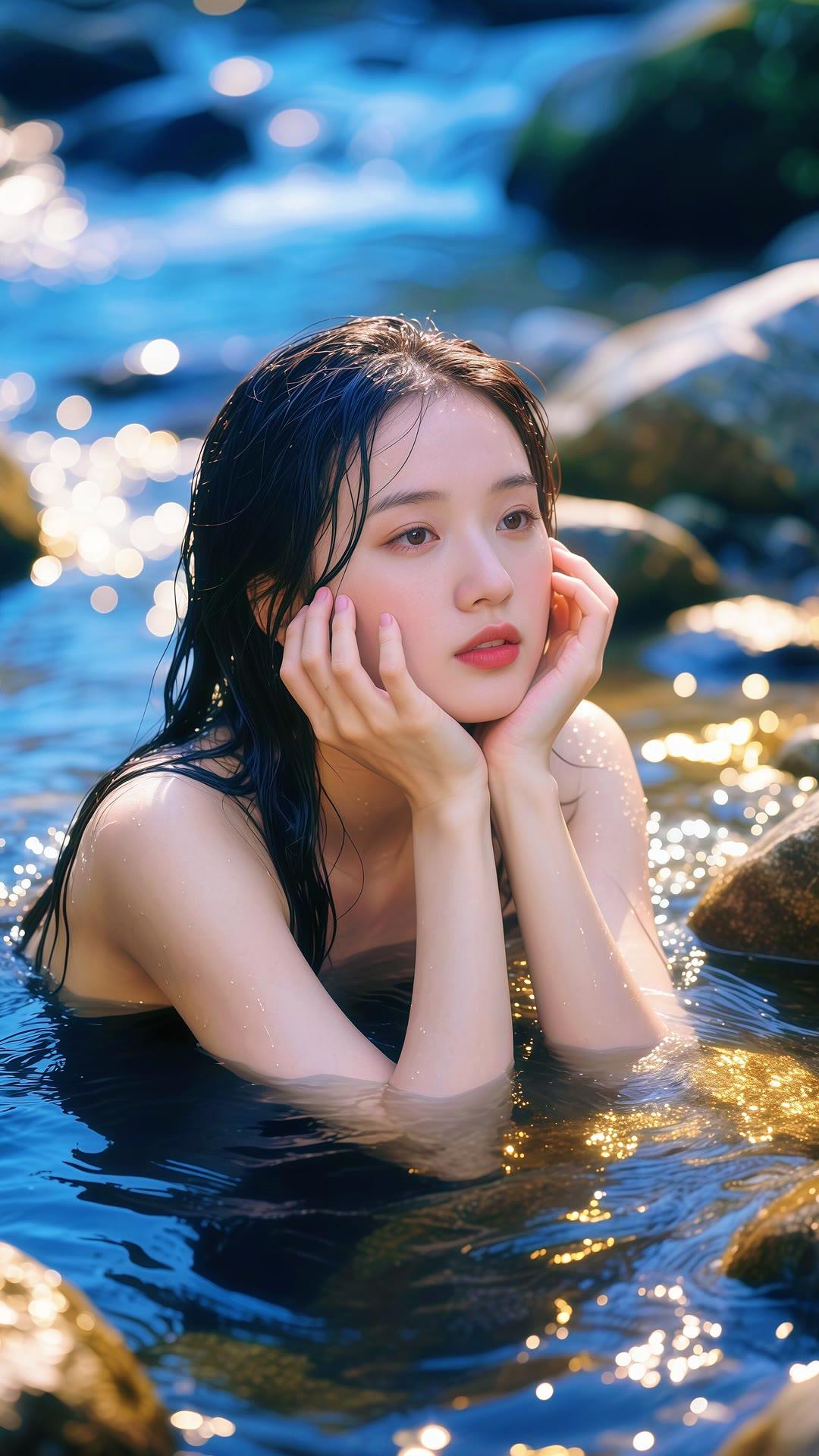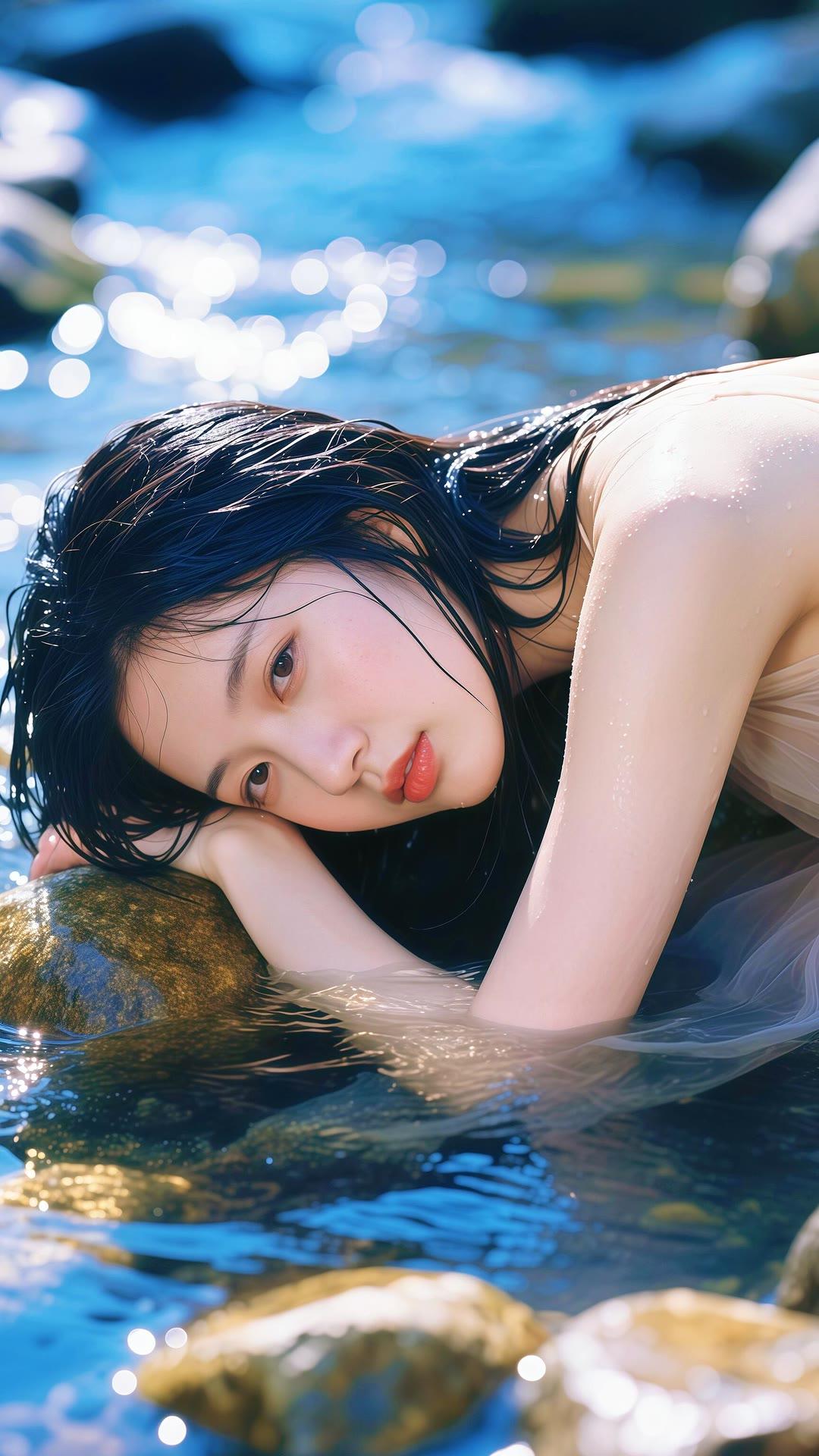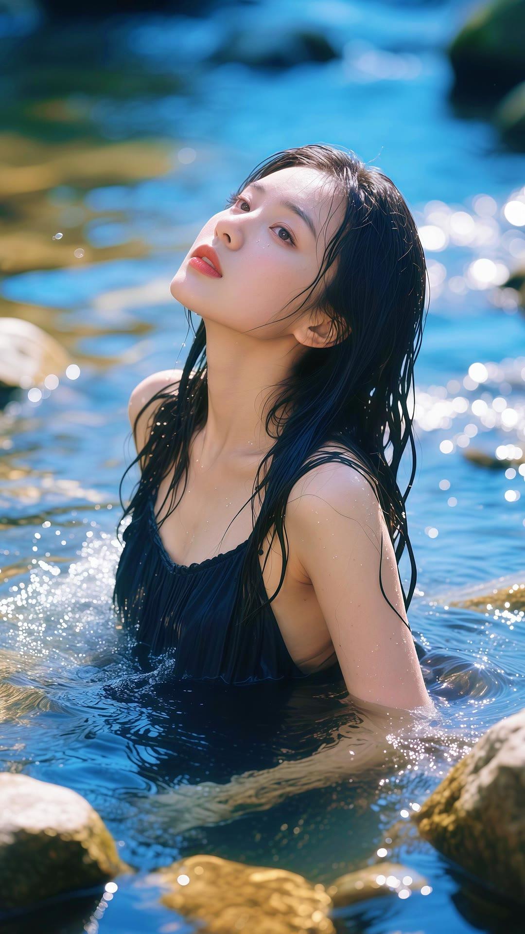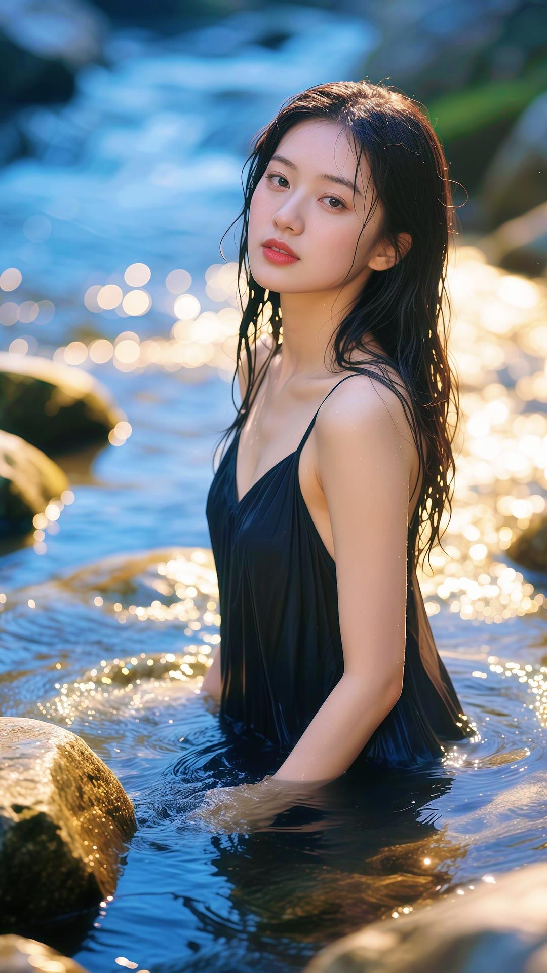 仙气飘飘的汉服少女,漫步在清澈的小溪边,宛如画中人。