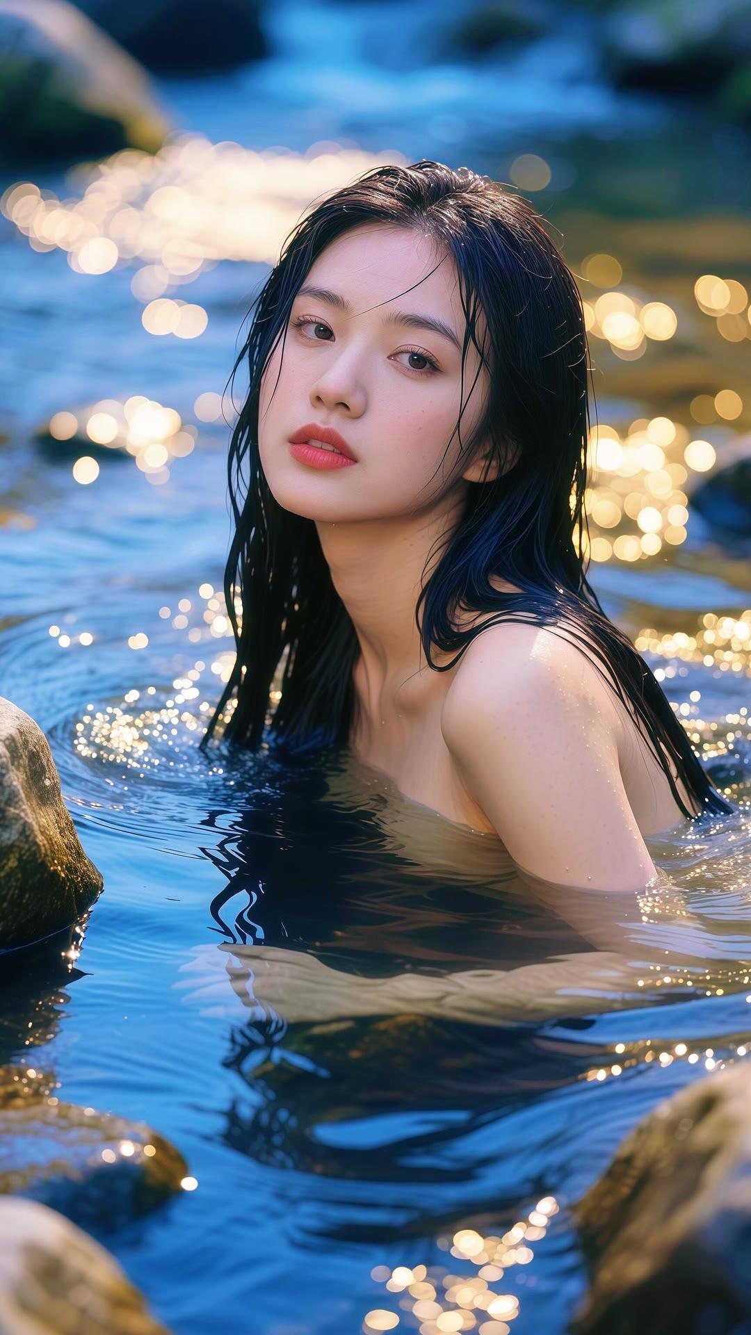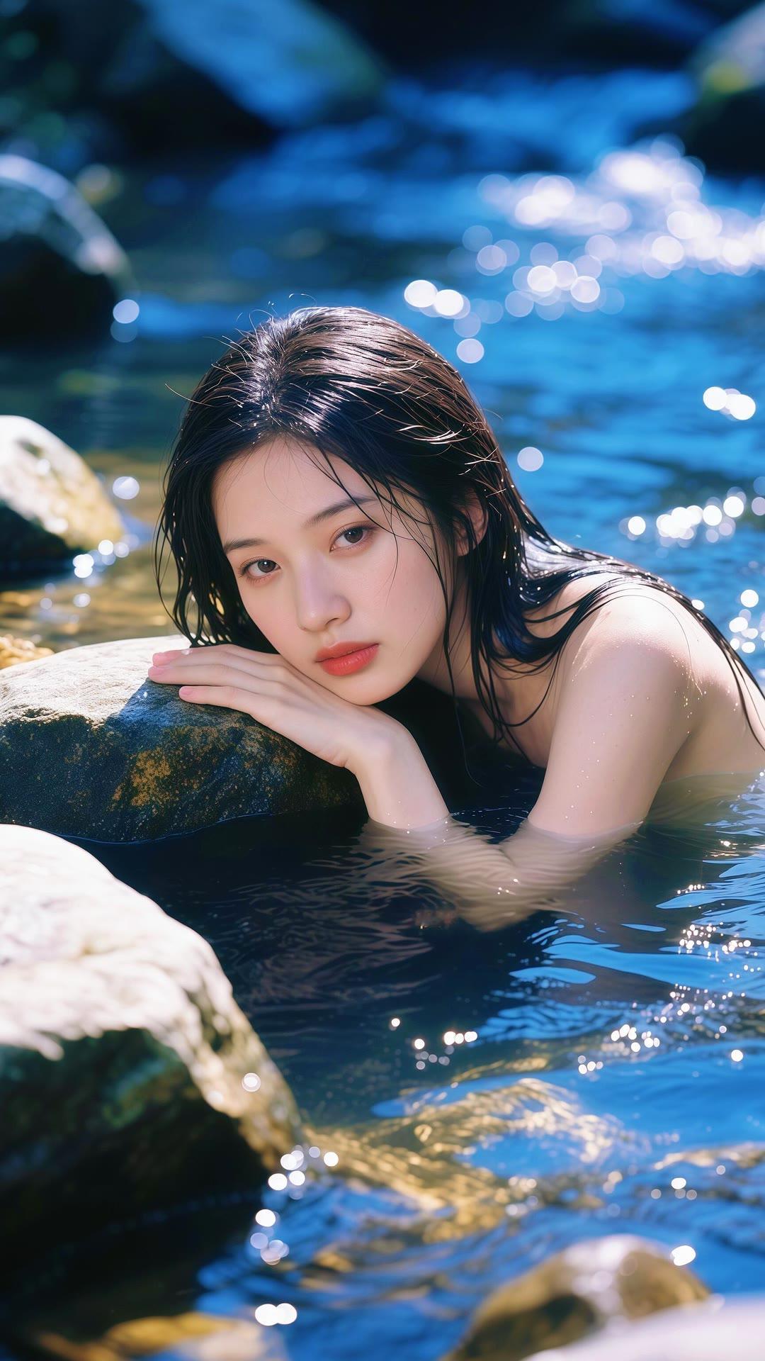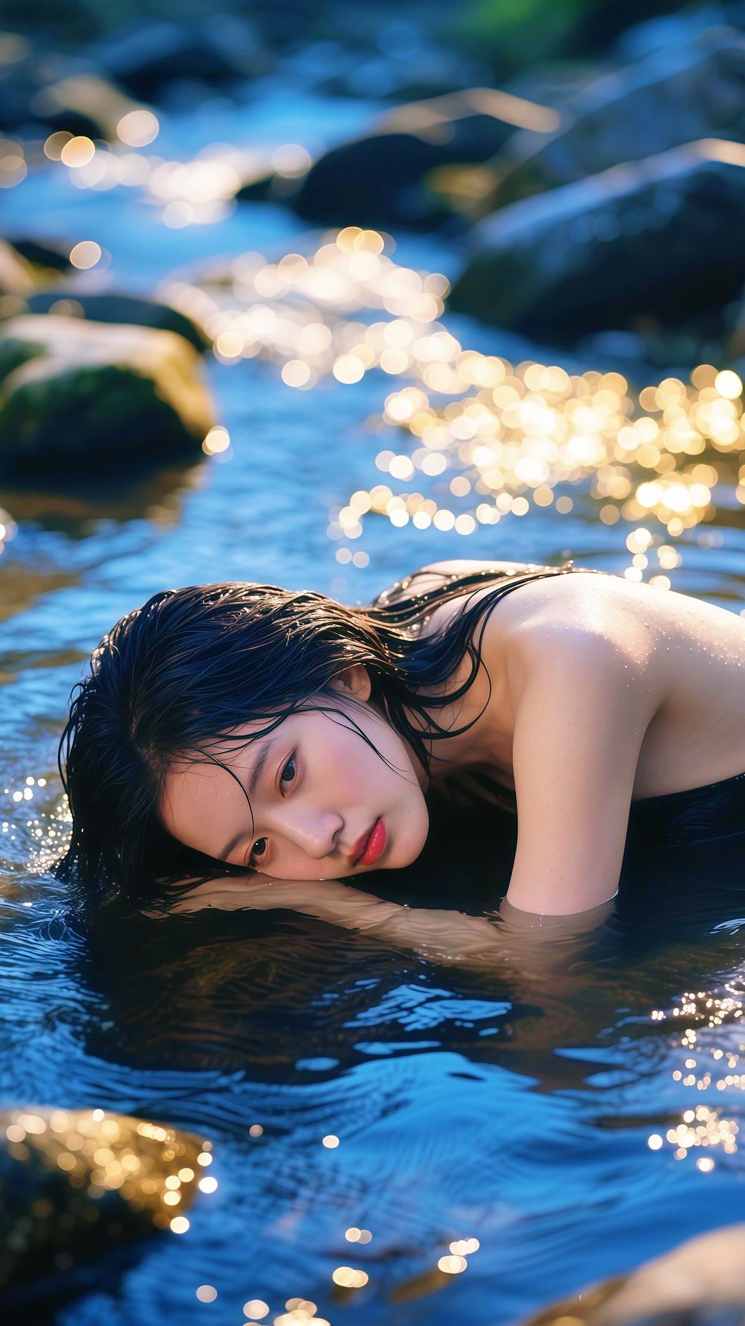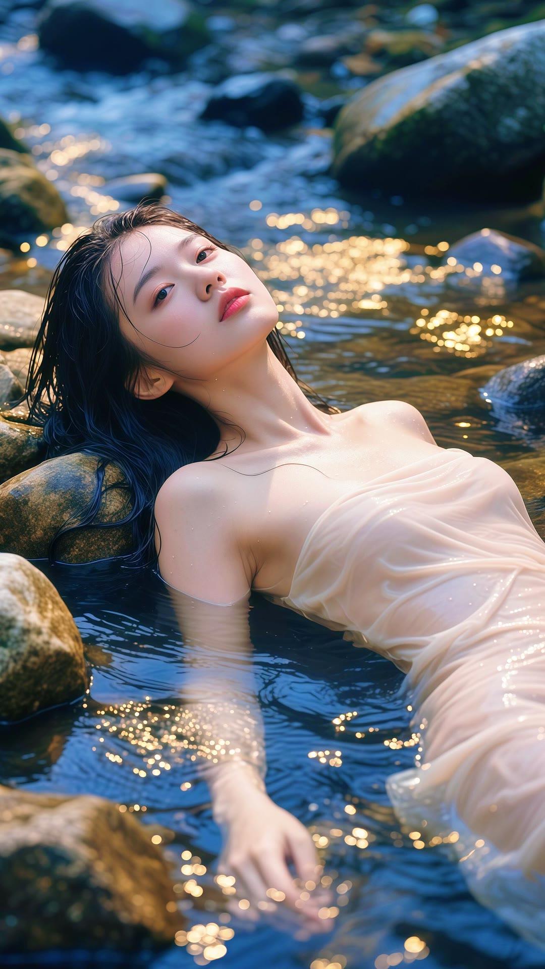 仙气飘飘的汉服少女,漫步在清澈的小溪边,宛如画中人。