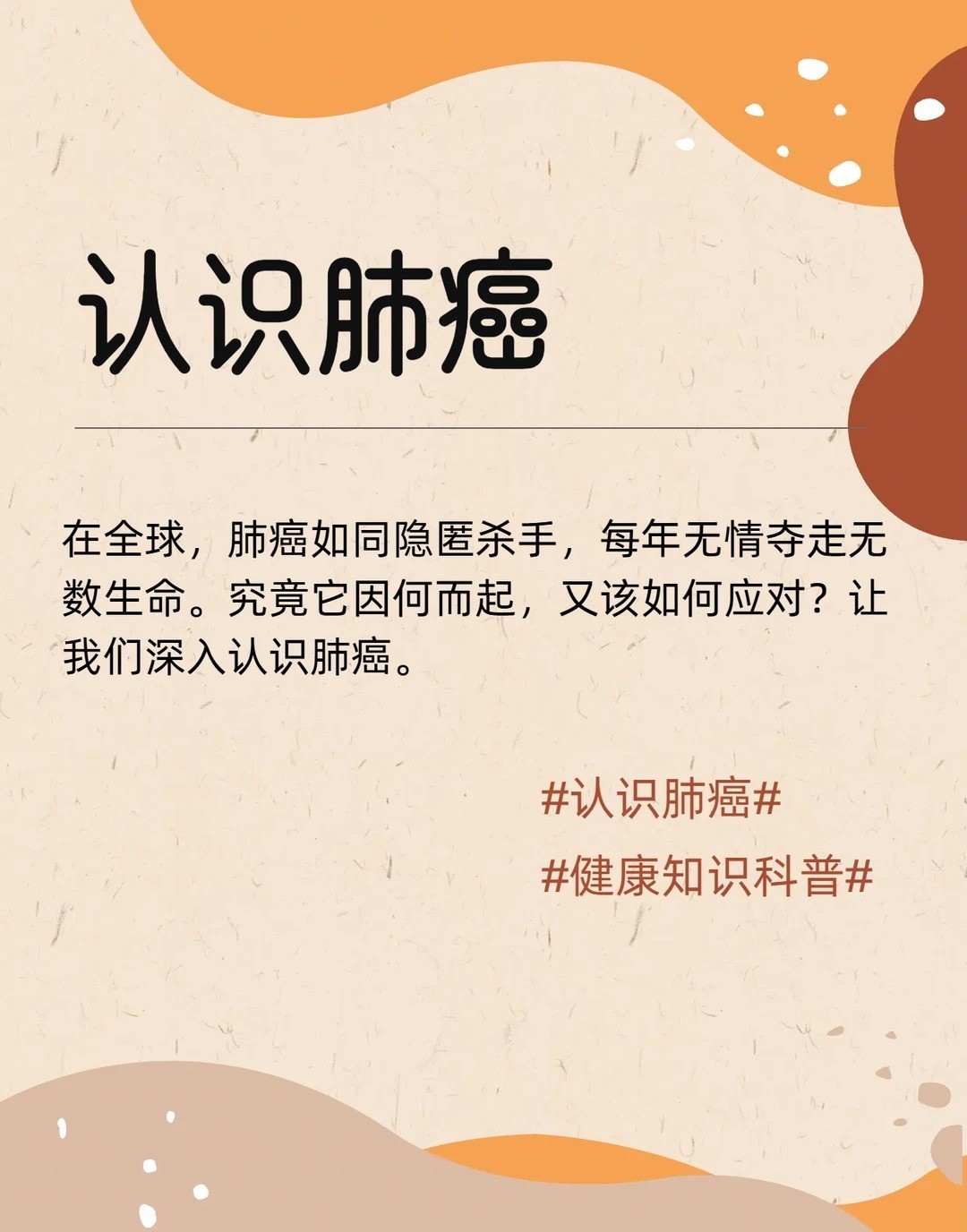 肺癌成中国女性第一大癌症 肺癌早期多无症状,但若出现刺激性干咳、痰中带血、胸闷超2周的情况务必警惕!吸烟、油烟、粉尘为高危因素,建议长期吸烟、有家族史者每年做一次低剂量螺旋CT。