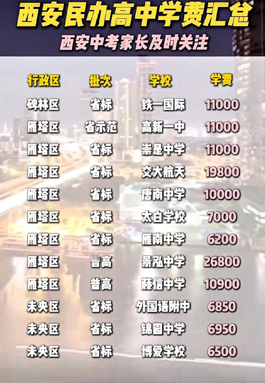 西安市民办高中名单及收费标准(2026参考) 说明:以下均为学费,不含住宿费、书本费、杂费等;非营利性民办学校执行政府指导价,营利性民办学校为市场调节价,每年可能略有调整,以学校当年公示为准。 一、热门高端民办 - 铁一国际:11000元/学期 - 高新一中:10000元/学期 - 高新唐南中学:10000元/学期 - 交大航天:19800元/学期 - 博迪学校:18000元/学期 - 西咸黄冈泾河学校:13500元/学期 - 景泓高级中学:26800元/学期 二、中等民办 - 太白学校:8750元/学期 - 西安外国语学校:6850元/学期 - 锦园中学:6950元/学期 - 雁南中学:6200元/学期 - 崇是中学:6200元/学期 - 电子科技中学:6050元/学期 - 陕西实验高级中学:7000元/学期 三、普惠型民办 - 铁一滨河:5000元/学期 - 西港花园高级中学:5000元/学期 - 思源中学:5000元/学期 四、国际课程类 - 西安枫叶国际学校:90000元/年高中民办学校