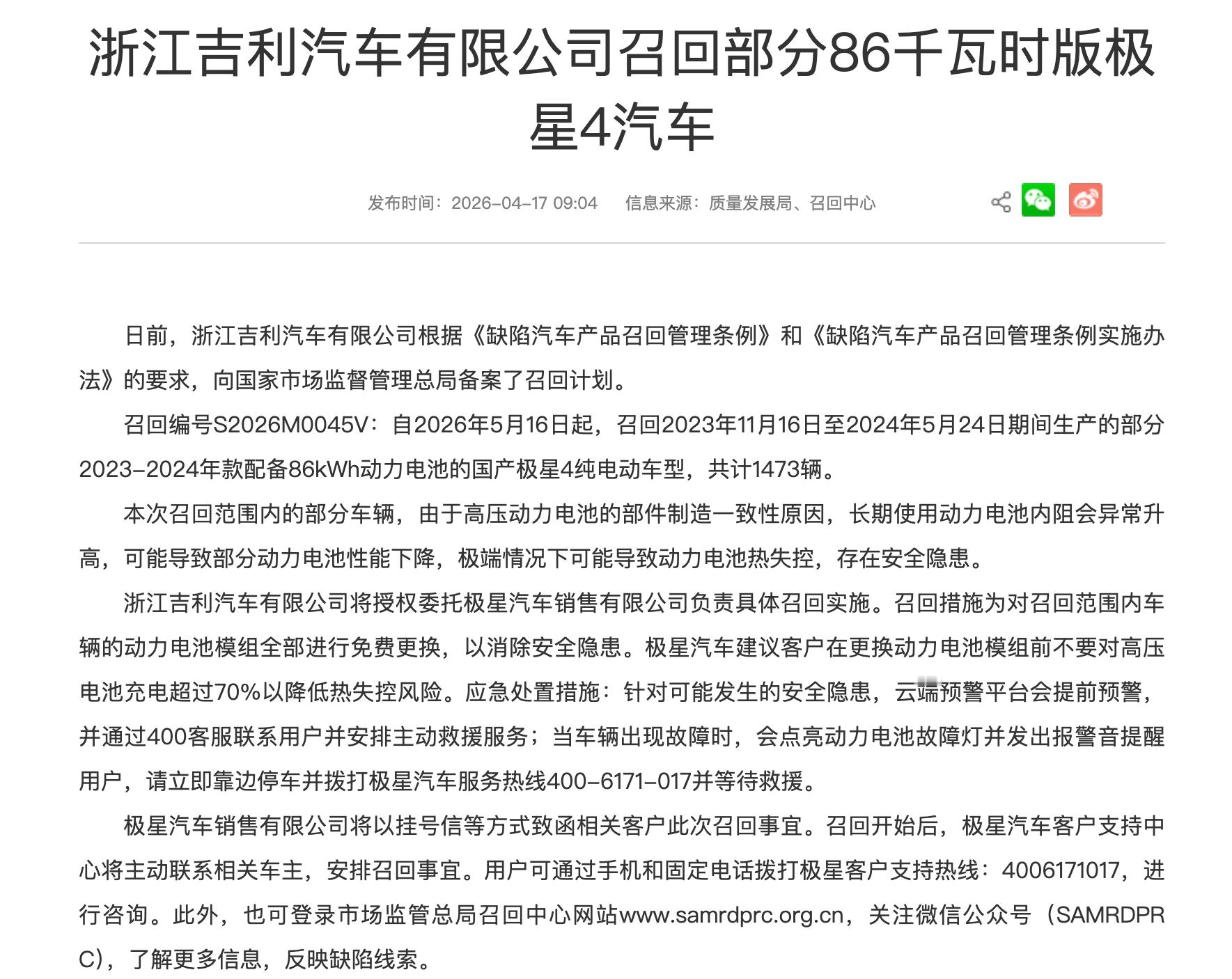 电池热失控!极星4宣布召回